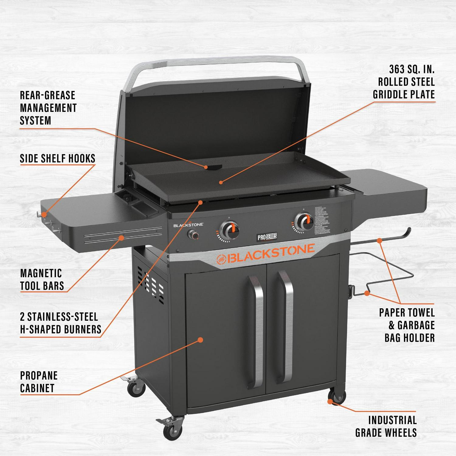 - Blackstone ProSeries 2-Burner 28″ Propane Griddle with Cabinet and Hood