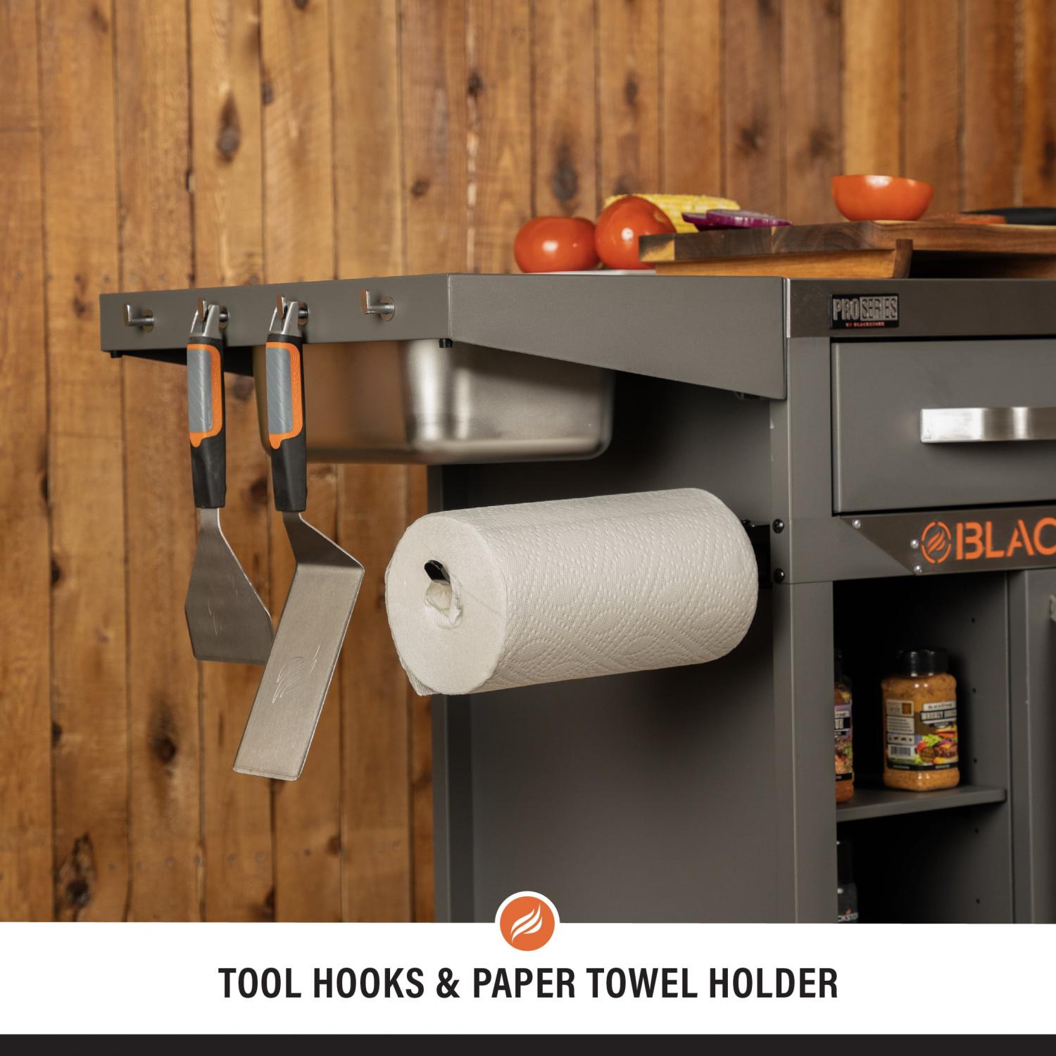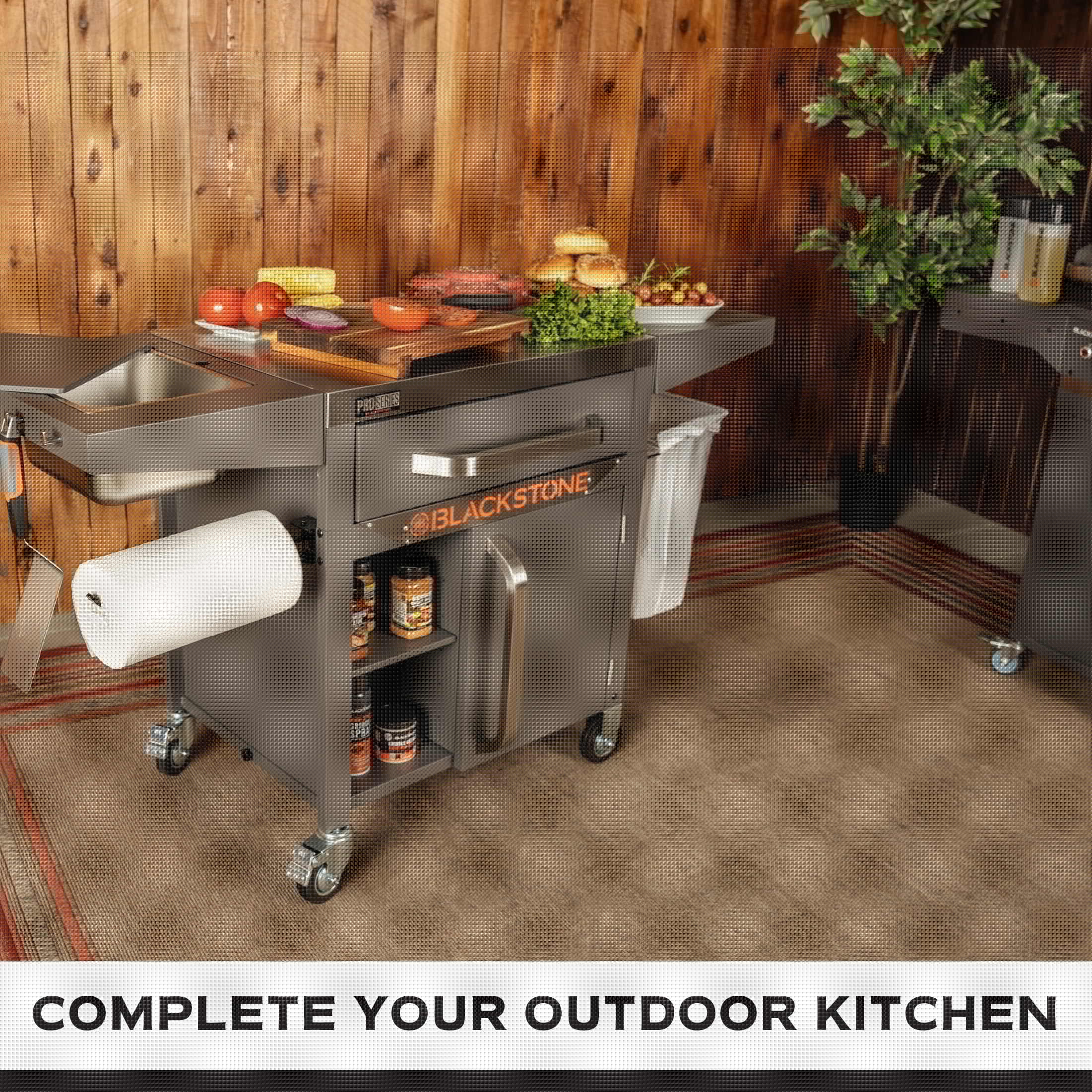 Complete your outdoor kitchen with the Blackstone ProSeries 28″ Serve and Store Prep Cart. With classic ProSeries detailing and design, the ProSeries Prep Cart is sure to elevate any outdoor cooking area thanks to all of its features. The stainless steel prep surface is perfect for prepping all of your ingredients for your next meal on the griddle. It can also be used as a stand for a smaller 17″ or 22″ Blackstone Griddle model. The two side shelves fold down to give you more versatility in your outdoor kitchen space. One shelf features a prep basin, and both shelves have convenient tool holders for your spatulas and other accessories when not in use. The paper towel holder and garbage bag holder make cleanup quick and easy. And to top it all off, you’ve got a drawer and shelves with a tray cabinet to hold even more accessories. Once you add the Blackstone ProSeries Prep Cart to your outdoor kitchen, you’ll never want to cook inside again.
