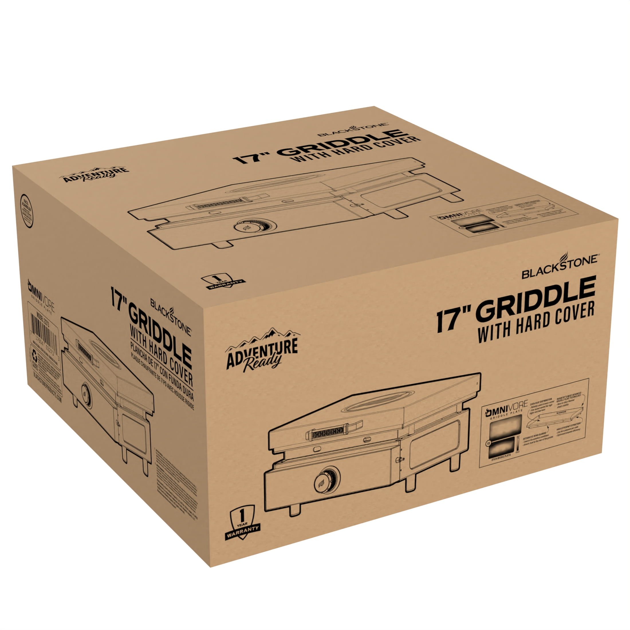 Blackstone 17″ Adventure Ready Propane Griddle Bundle Includes a 17″ griddle, protective hard cover, and carry bag 267 square inches of cooking space and 12,500 BTUs Hard cover protects griddle plate from scratching Carry bag is made of heavy-duty 600D polyester and has handles to help transport your griddle Model #2273