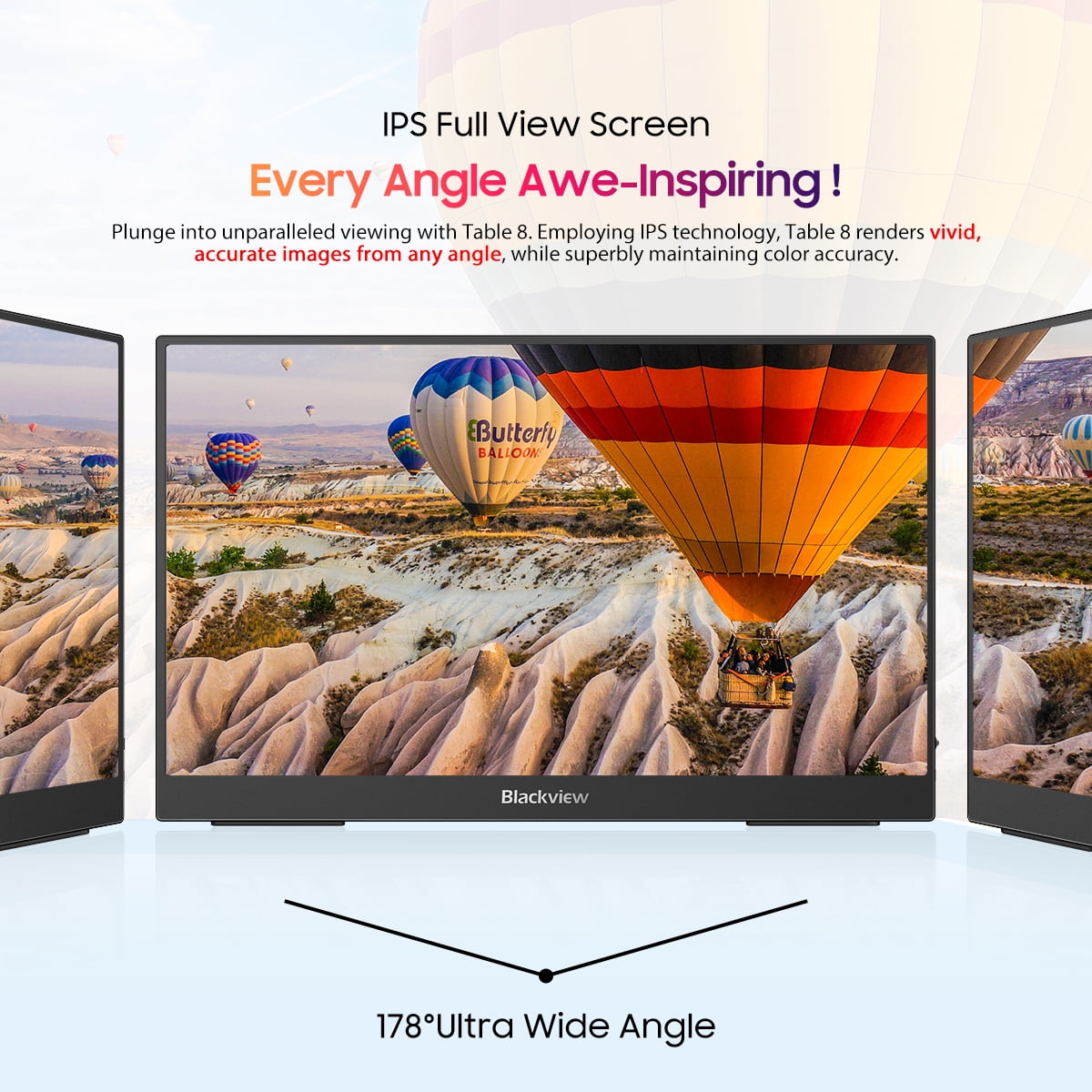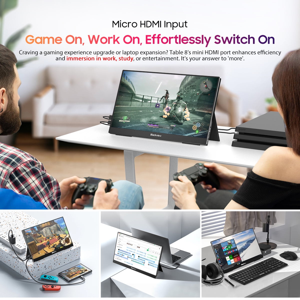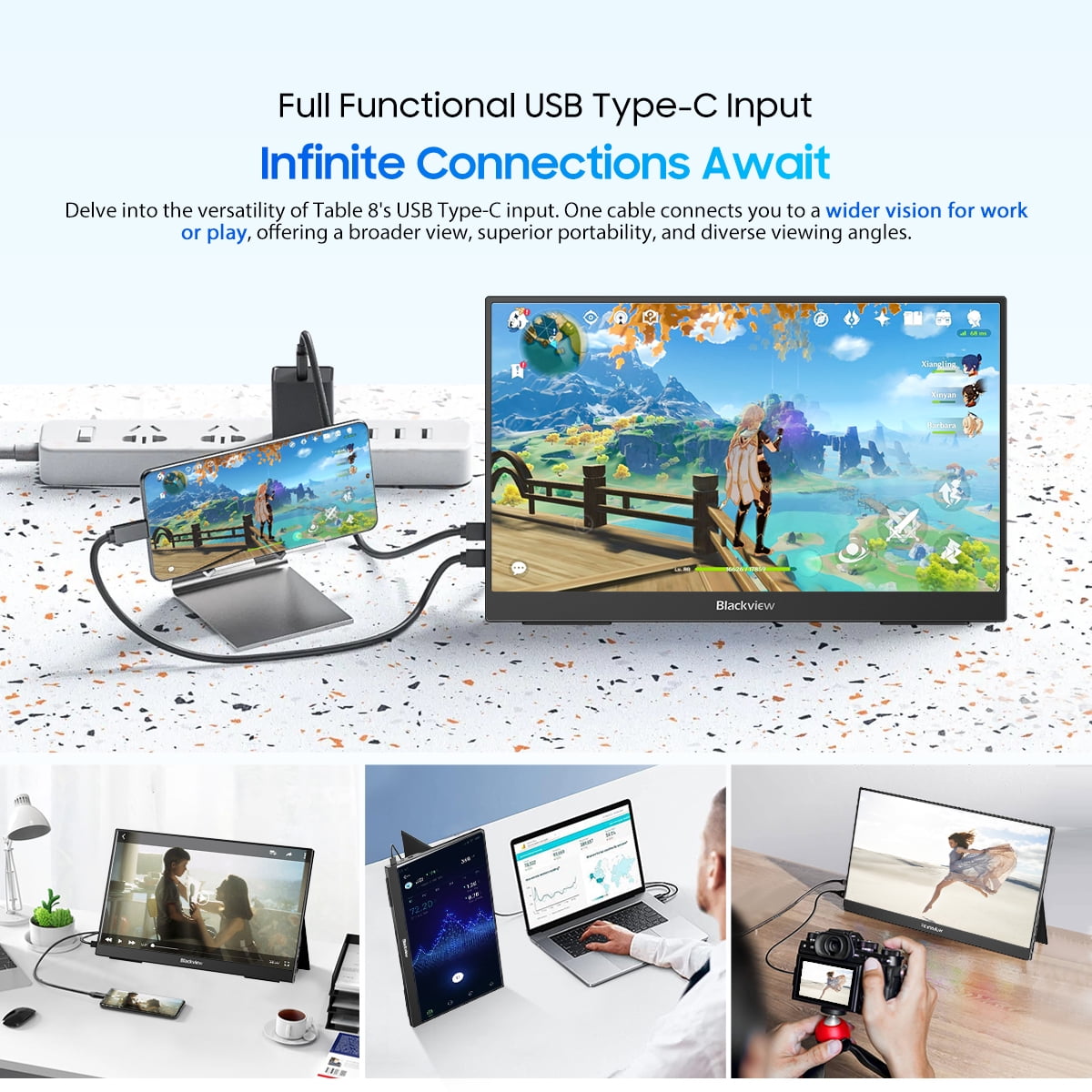 Blackview portable monitor Table 8 brand new Screen: 15.6 inch, FHD 1080P, 178° Viewing Angles gives superb color contrast, viewing quality is clear, and the color reproduction is accurate Screen Resolution: FHD 1920*1080, 16:9, has excellent color rendering ability Screen Brightness: 380 nit Mode: Landscape mode and portrait mode enabling simultaneous browsing, editing, or viewing, and enhancing your work, study, and entertainment efficiency. Support device: Laptop/Game Devices/smartphone Interface Type: Type-c*2 for phone/laptop/Mac/Xbox PS4/PS5,mini HDMI*1, headphone jack*1, compatible with most laptop💻, smartphone📱, PC, PS4, XBOX, or Nintendo Switch🎮, and more Size: 14 x 8.7 x 0.47 inch, 6mm Ultra-slim, easy to carry around Speaker: 2 surround speakers Support: HDR/brilliance control/contrast control/contextual model/VOL/RESET/Anti Blue Light 🎁Click here to purchase Blackview Mini PC MP80