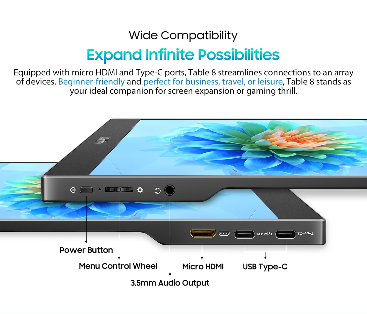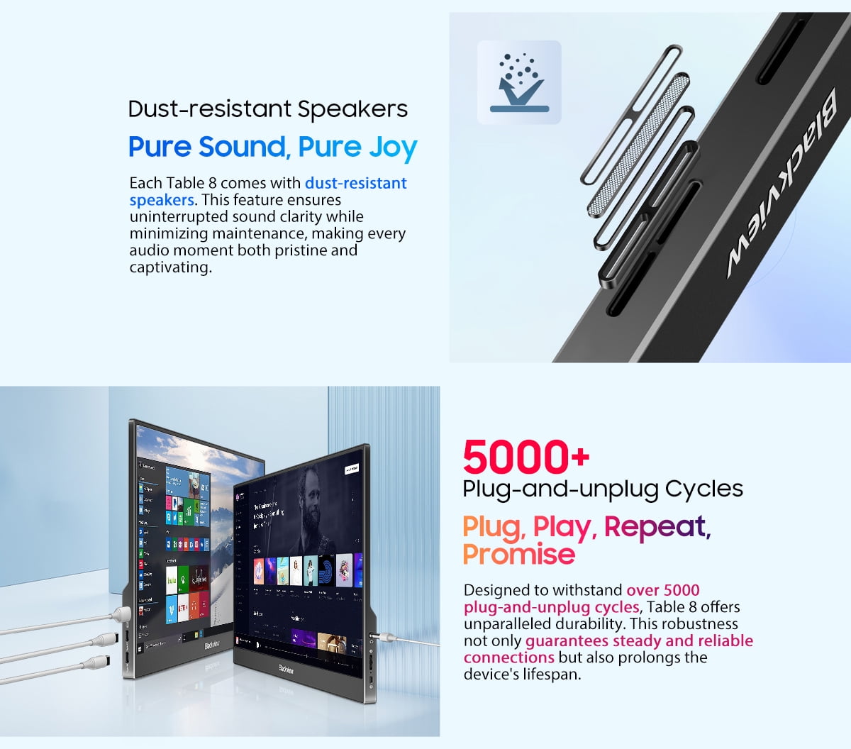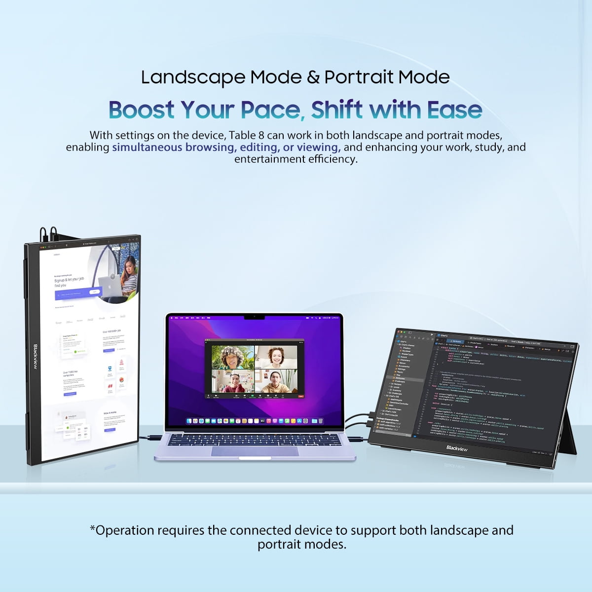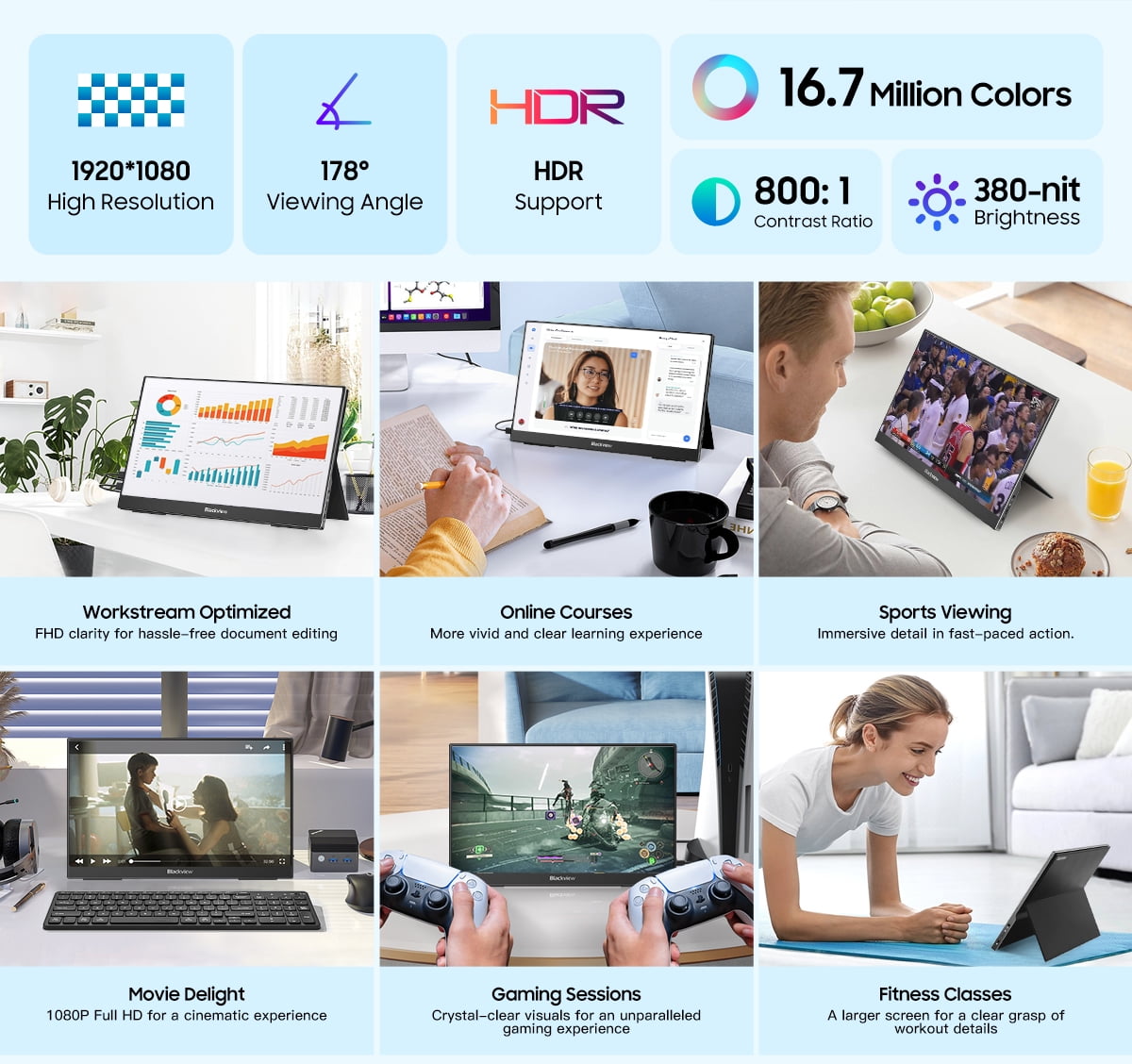 Blackview portable monitor Table 8 brand new Screen: 15.6 inch, FHD 1080P, 178° Viewing Angles gives superb color contrast, viewing quality is clear, and the color reproduction is accurate Screen Resolution: FHD 1920*1080, 16:9, has excellent color rendering ability Screen Brightness: 380 nit Mode: Landscape mode and portrait mode enabling simultaneous browsing, editing, or viewing, and enhancing your work, study, and entertainment efficiency. Support device: Laptop/Game Devices/smartphone Interface Type: Type-c*2 for phone/laptop/Mac/Xbox PS4/PS5,mini HDMI*1, headphone jack*1, compatible with most laptop💻, smartphone📱, PC, PS4, XBOX, or Nintendo Switch🎮, and more Size: 14 x 8.7 x 0.47 inch, 6mm Ultra-slim, easy to carry around Speaker: 2 surround speakers Support: HDR/brilliance control/contrast control/contextual model/VOL/RESET/Anti Blue Light 🎁Click here to purchase Blackview Mini PC MP80