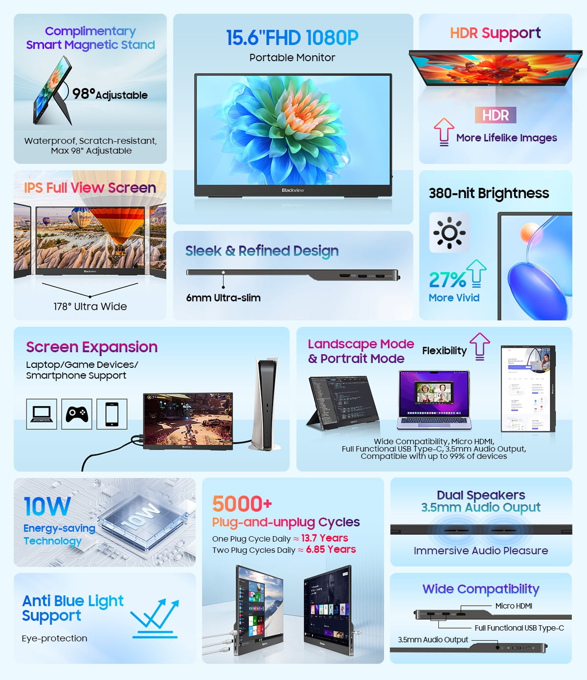 Blackview Table 8 15.6 inch Portable Monitor: Your on-the-go display solution! This sleek monitor offers a Full HD 1920×1080 resolution in a slim, 6mm design. Enjoy stunning visuals in both landscape and portrait modes. Connect easily to laptops, game devices, or smartphones with Type-C, mini HDMI, and a headphone jack. With 380 brightness, HDR, and anti-blue light, your eyes stay safe and visuals stay vibrant. Dual speakers provide great sound, making this monitor perfect for work, gaming, or entertainment on the move. Lightweight and stylish, the Table 8 is your perfect travel companion!