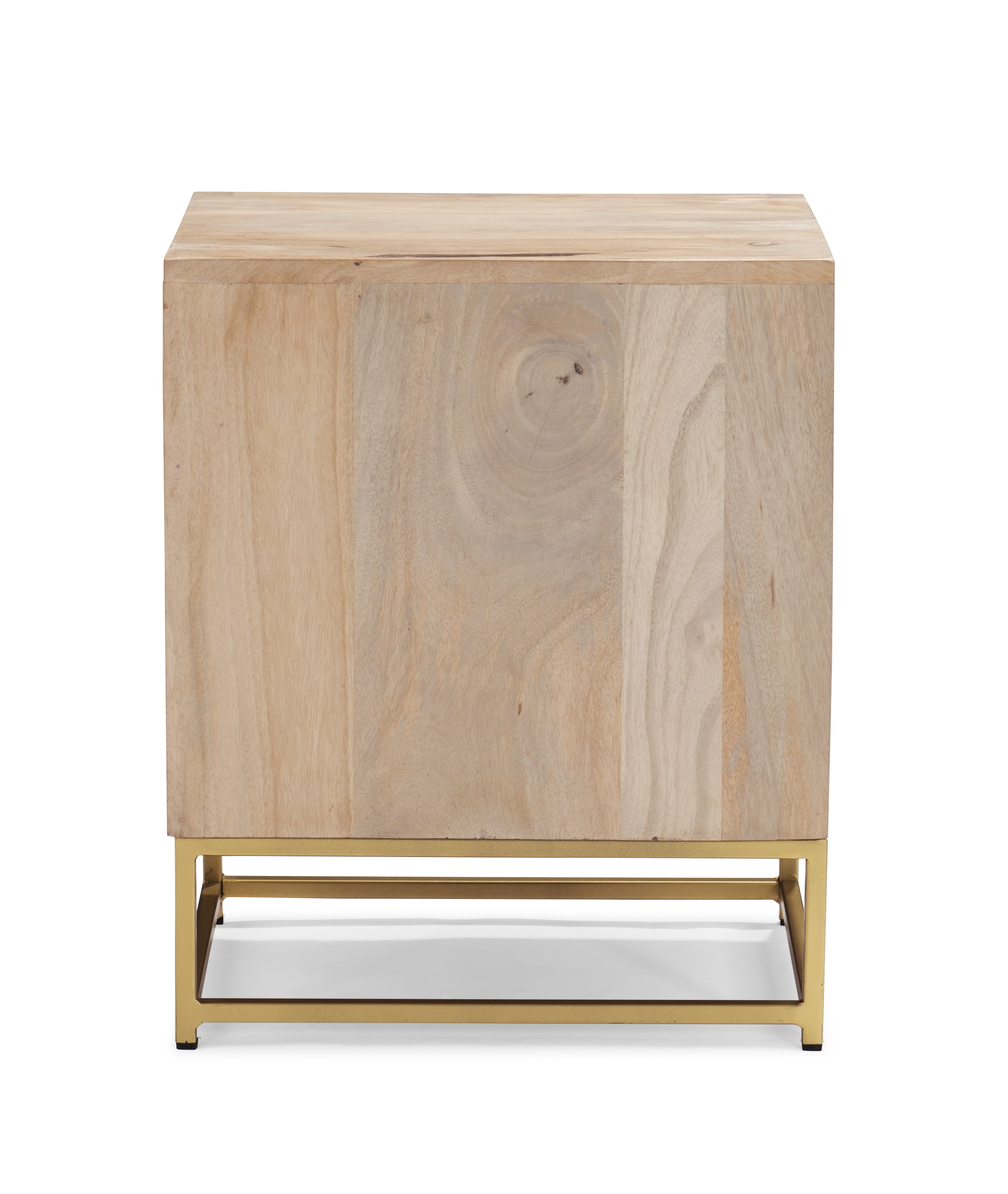 Simple and geometric, this Powell Blair 2-Drawer Rattan End Table offers versatile function without sacrificing distinctive style. Real Cane from Rattan creates natural texture while a metal frame adds a crisp shine with its gleaming gold finish. Blending both elements from a variety of styles, this piece complements any home or office in both form and function. Use as a stylish end table, and convenient night stand, or cabinet. Additional pieces also available with three drawers or two sliding doors.