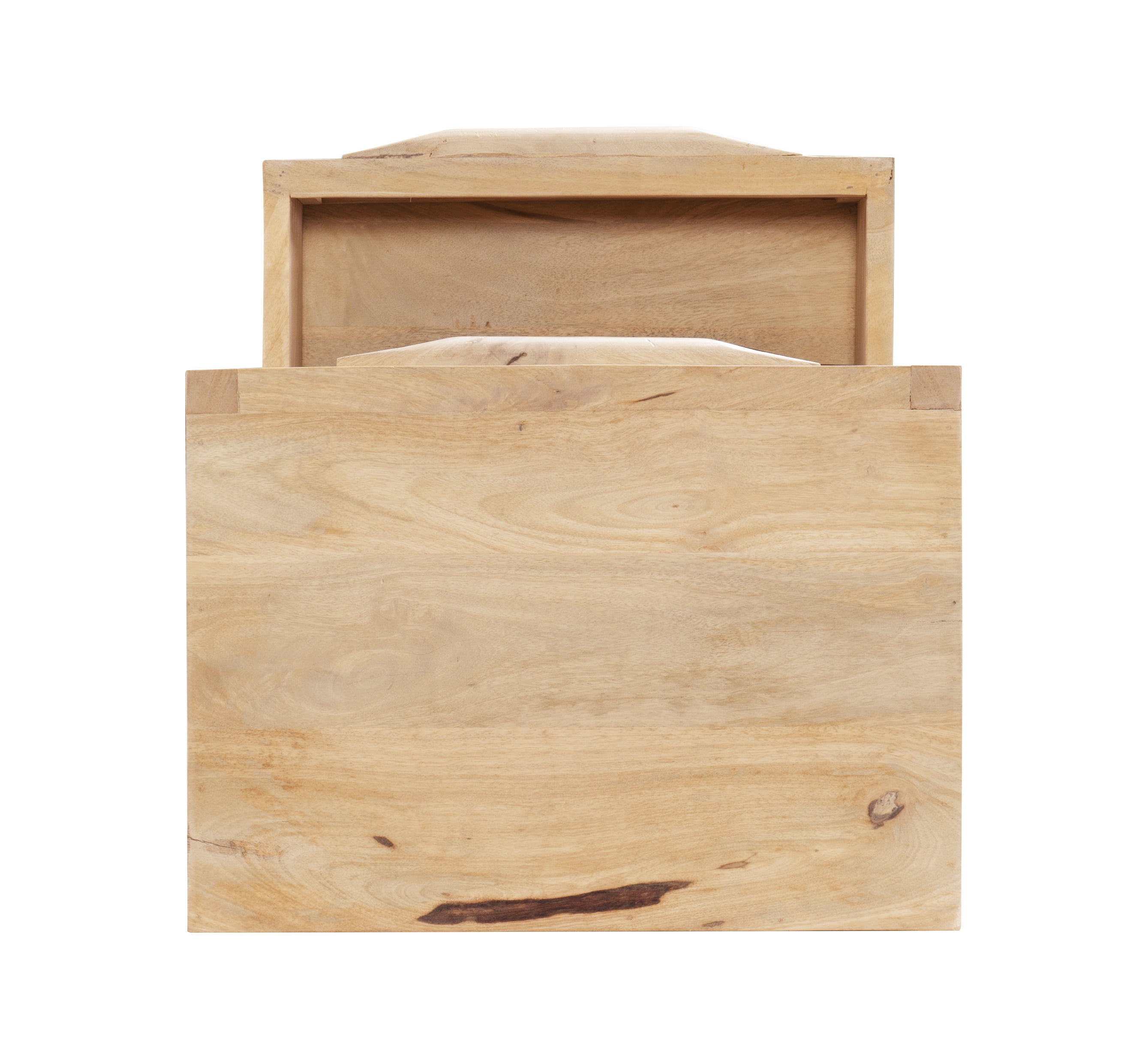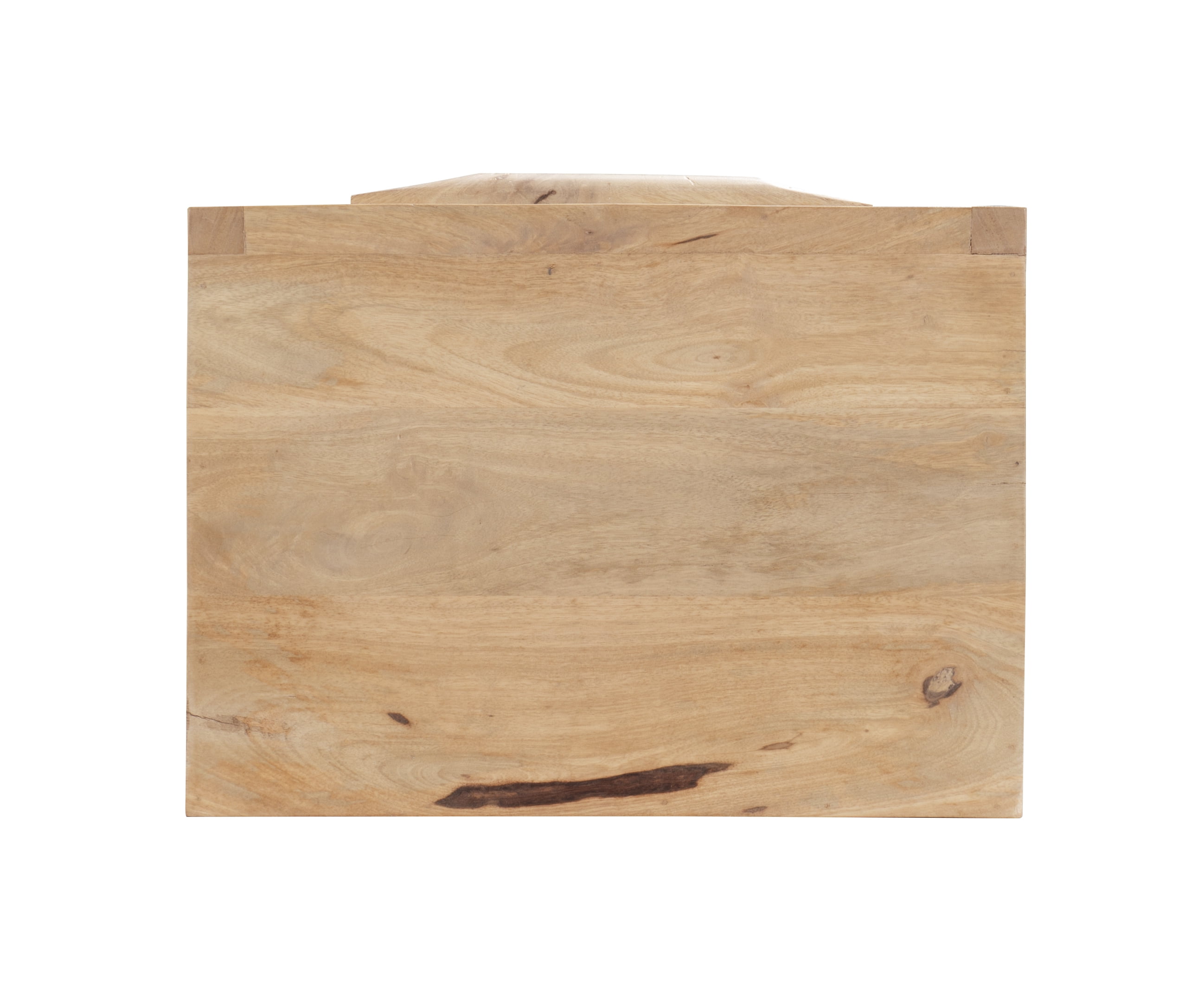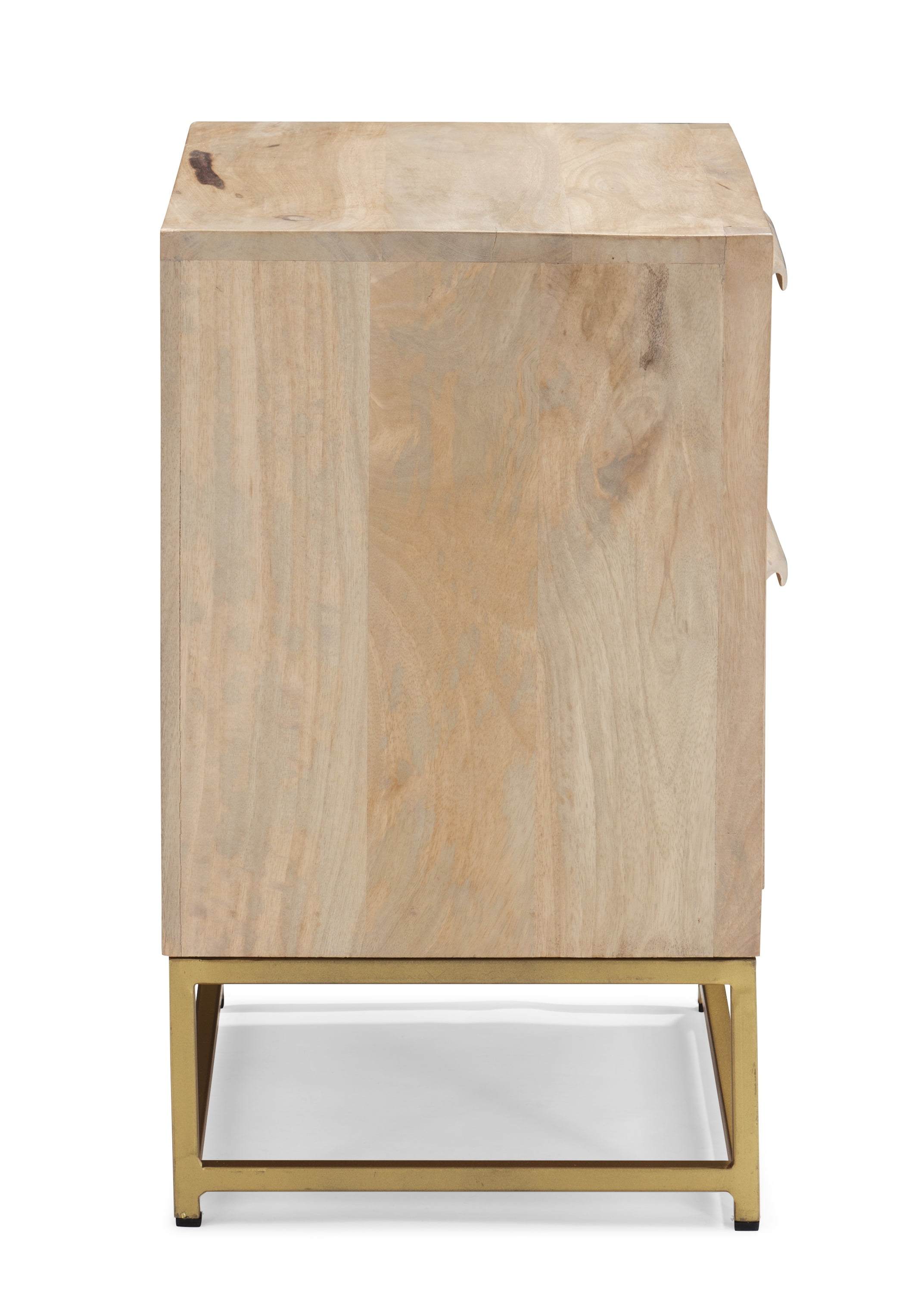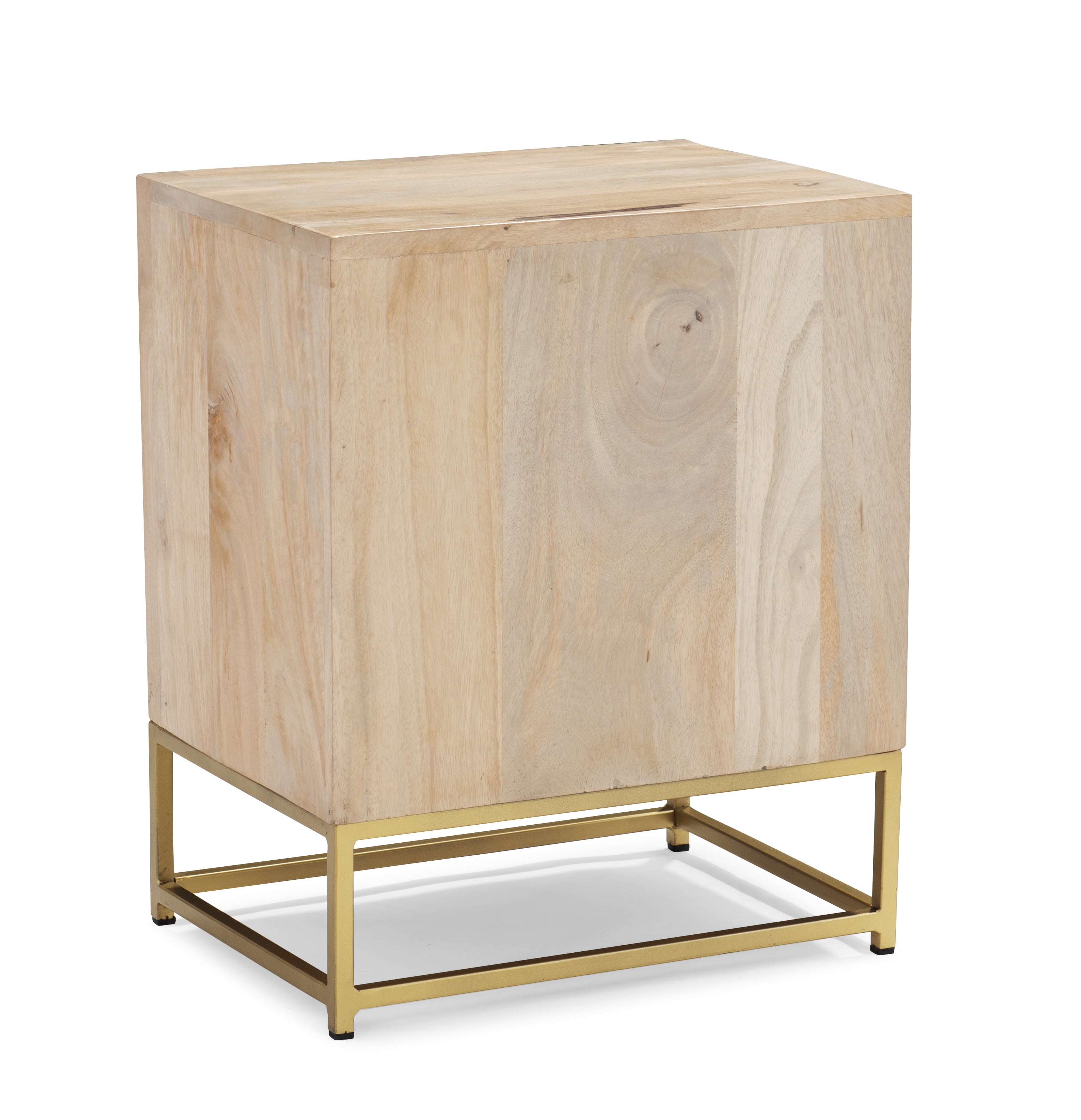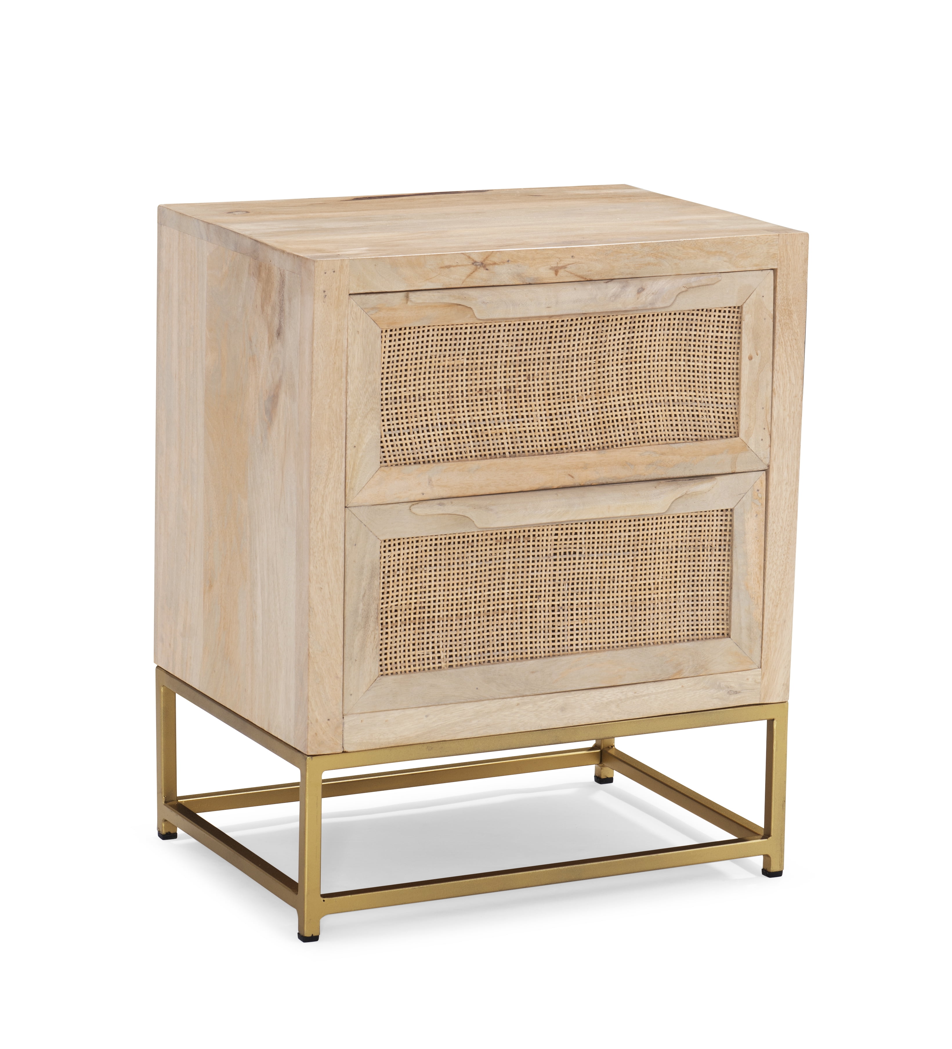 Powell Blair 2-Drawer Rattan End Table, Natural and Gold Two-drawer end table, nightstand, or cabinet Wood frame with metal base Gold metal finish Drawer dimensions: 16″w x 12″d x 7″h Height from floor to bottom of table: 5.5″ Assembled Dimensions: 18″ W x 14″ D x 22″ H Weight Capacity: 30 lbs each Drawer; Top 30 lbs Ships in one box