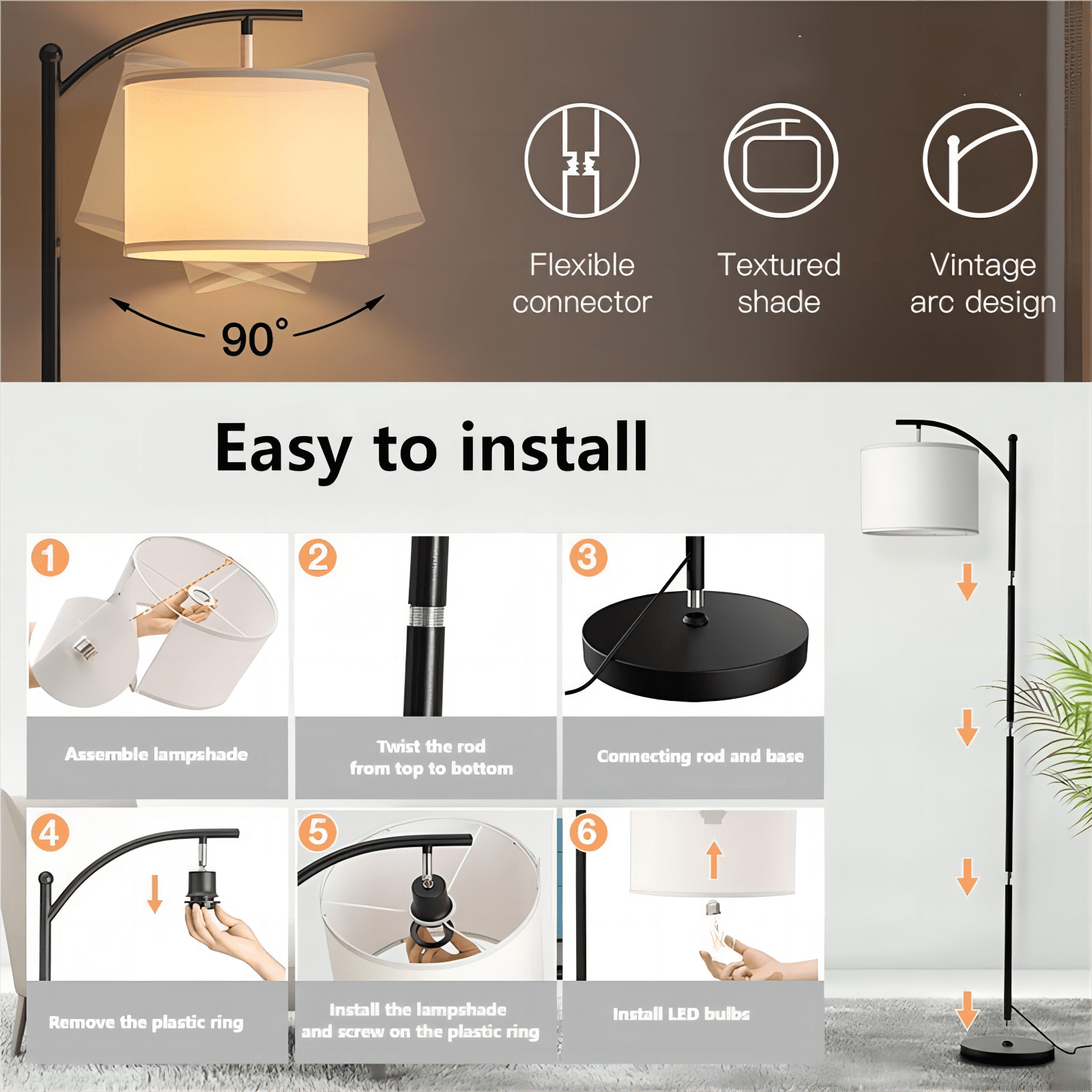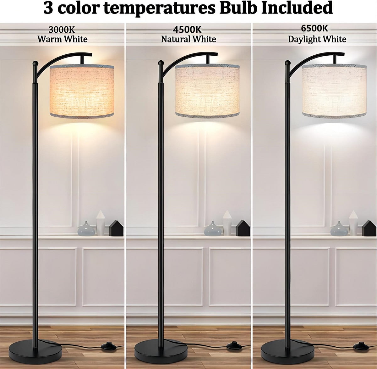 This minimalist modern arch floor lamp is made of metal and features a round base and slender body with curved arms that shape a sleek silhouette and add a unique touch to the room. The floor lamp has three color temperatures: 3000K Warm Yellow, 4500K Warm White, 6500K Cold White, 6000K White Daylight. This LED floor lamp allows you to change the ambiance of the room with just a press of the remote. 9W LED bulb, Glare-free, and flicker-free. The weighted base provides good stability from falling, safe for your kids and pets. Energy-saving and Long-lasting. Suitable for study room, living room, bedroom. Specifications: Base Type: E26 Base Input Voltage: 85- 265 V/AC Frequency: 50/60 Hz Wattage: 9 W Luminous Flux: 1000 lm Color Temperature: 3000-6500K Beam angle: 180° Color Rendering Index(CRI): 90 lm Lifespan:>25,000 Hours Material: Metal + linen Power source: Corded electric Light source: LED Package Included: 1 x Floor Lamp 1 x Lamp Shades (Beige) 1 x 9W LED Bulb 1 x User Manual