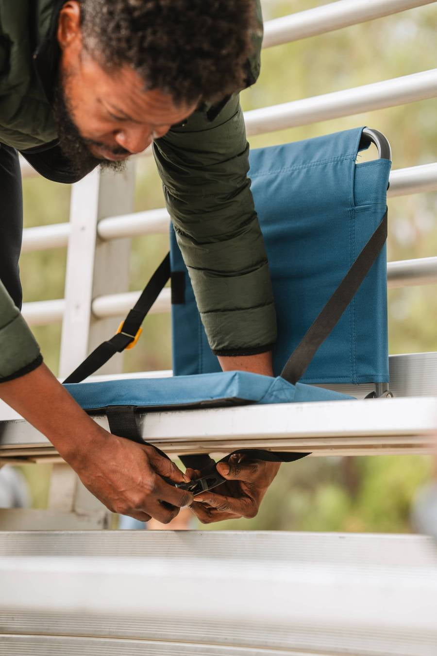 The BleacherBack™ stadium seat fastens to stadium benches with the click of a buckle. BackComfort™ Technology adjusts the backrest to unlimited reclining positions and a shoulder strap with Auto-Fold™ Technology makes it easy to open, close and carry. The BleacherBack™ is constructed of powder-coated steel and features a cushioned seat and storage pocket.