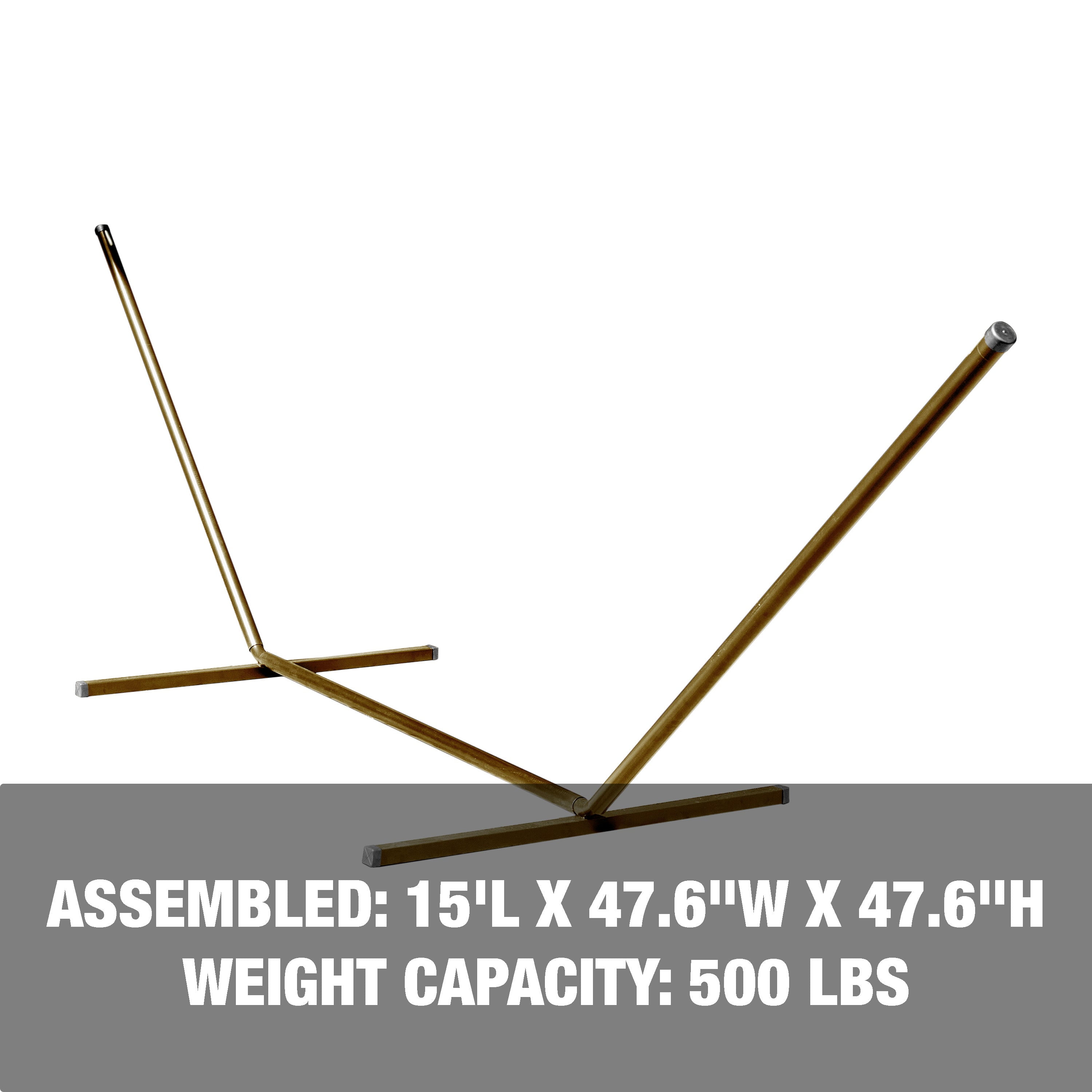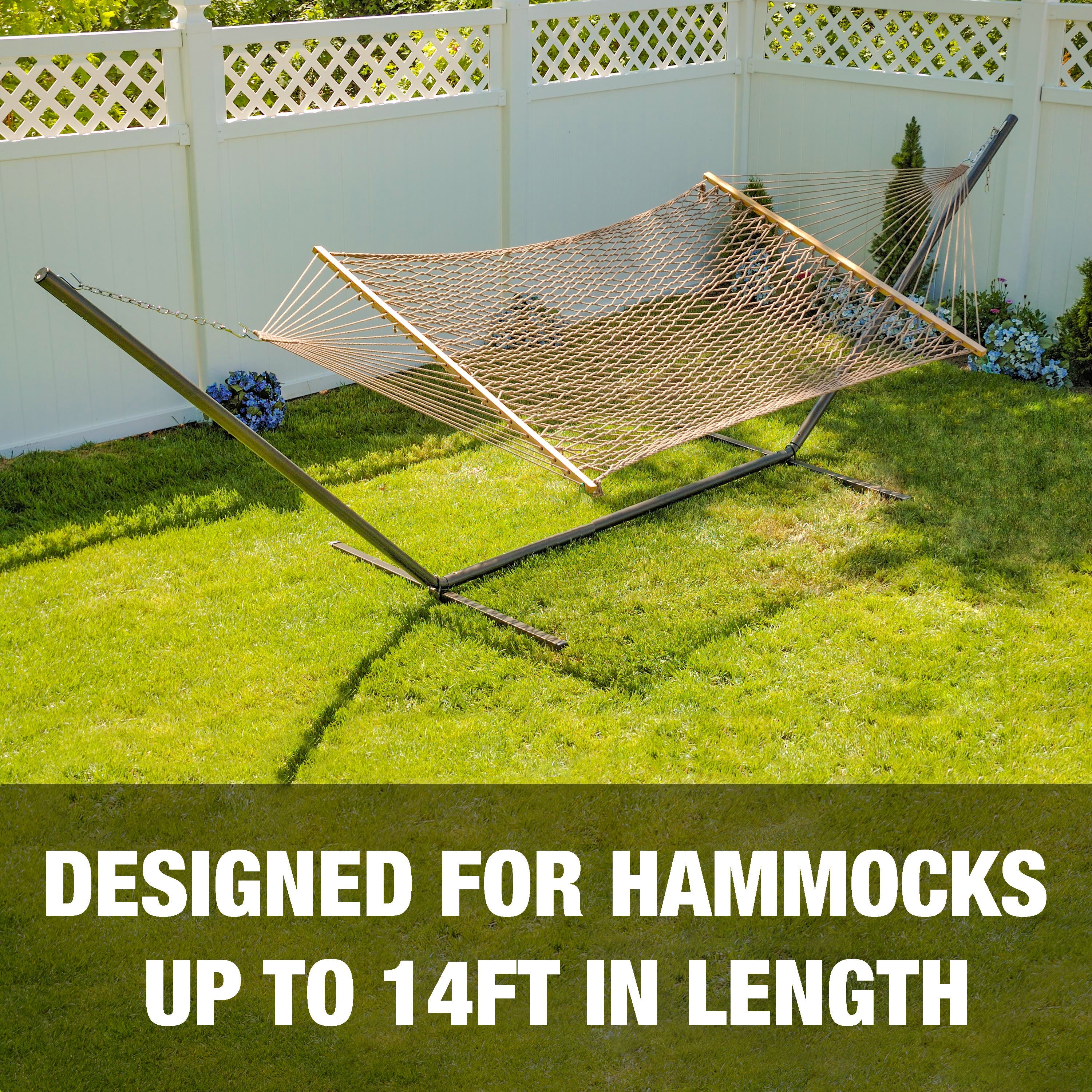 SUPERIOR CONSTRUCTION: 15 ft extra strong steel stand with minimal foot print, ideal even for smaller yards. Constructed with heavy duty 2″ steel tubing with U-brackets to reinforce the joints EXTRA DURABILITY: Made of heavy-duty steel Galvanized and powder coated baked enamel finish for extra weather resistance and rust prevention FIT: Designed for hammocks with an overall length of 10 to 14 feet (end loop to end loop). It accommodates a multitude of our hammocks with or without spreader bars, single or double hammocks. EASY ASSEMBLY: Snap locks on the end of each tube allows for easy assembly. (2) Z Hook screws with nuts included to anchor your hammock to the heavy-duty stand. DIMENSIONS: Fully Assembled: 15′ L x 47.6″ W x 47.6″ H Weight Capacity: 500 lbs.