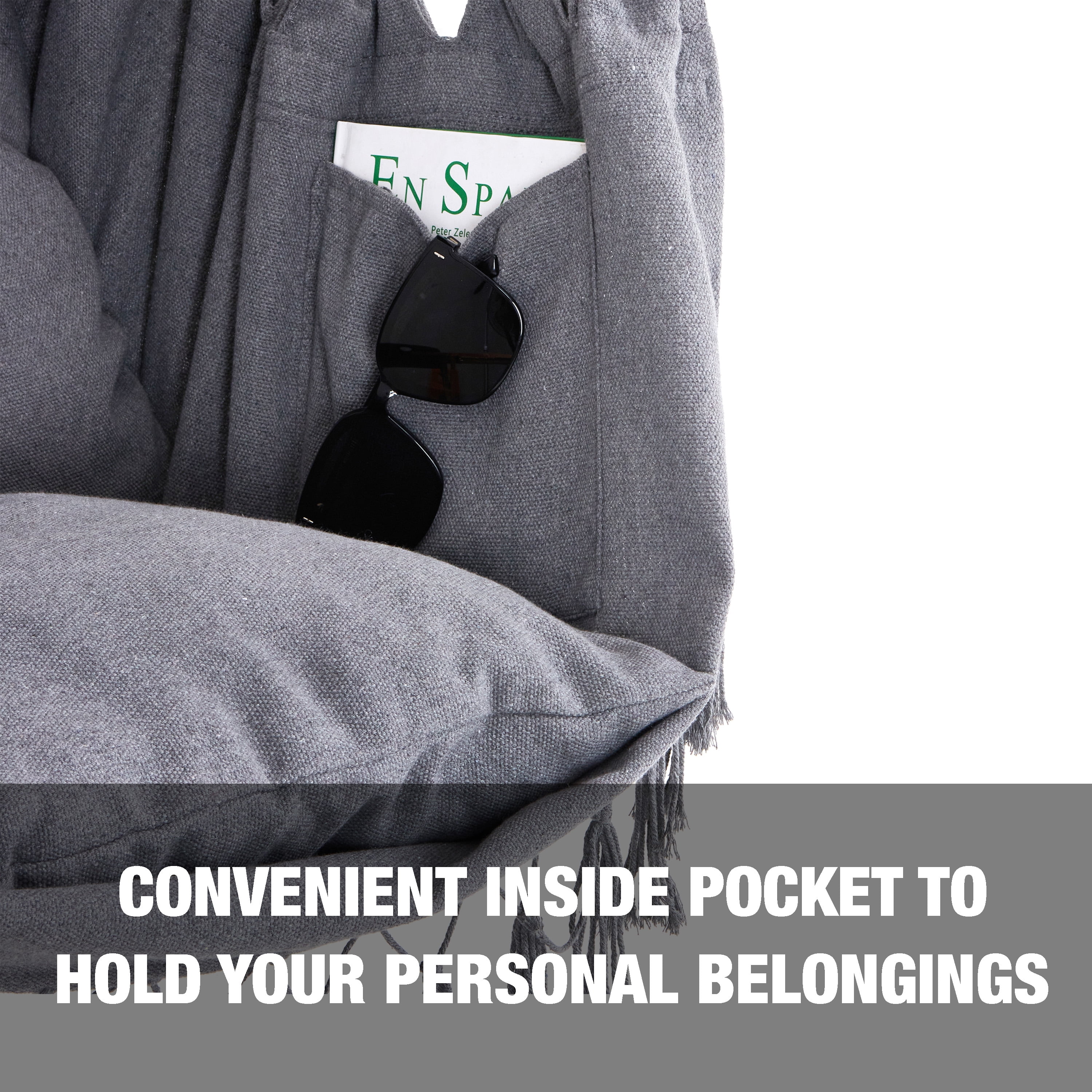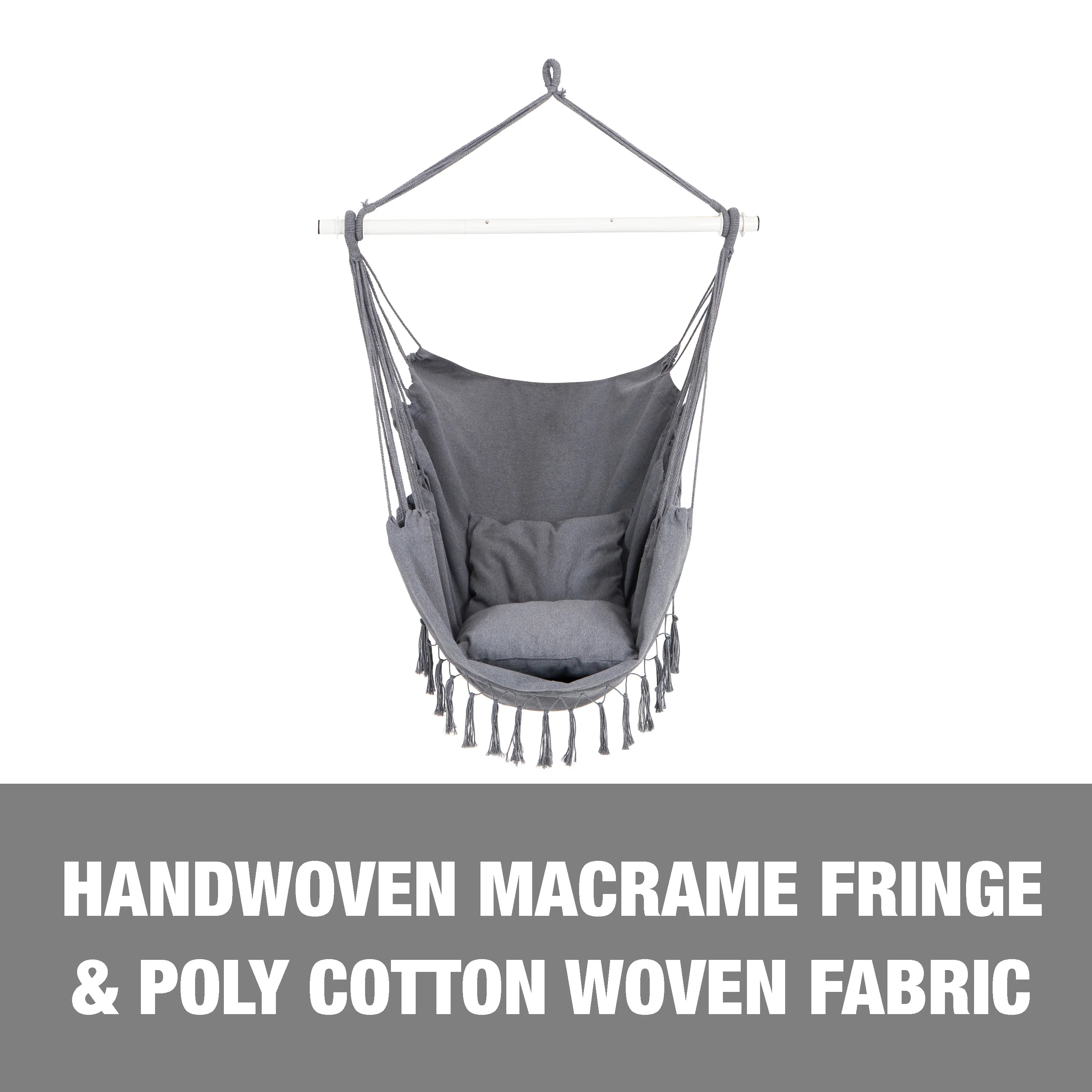 This tasteful, incredibly comfortable fringed designed fabric hammock chair is perfect to add a little flair to your indoor decor and can also add the perfect personal touch to your outdoor space. This hammock chair features a strong woven, breathable polyester and cotton material with 100% handmade/woven fringes along the front end of the chair. Also Includes 2-square pillows for ultimate comfort. It also features a built in pocket on the side so you can hold your phone, iPad, book, drink and more. The spreader bar is a collapsible powder coated steel design that makes it easily storable during the cold season, while providing durability when in use. Hand crafted rope loop end for a classic style and durability with a 250 lbs weight capacity. All Hanging hardware is included with chain and all the screws needed to install indoors as well.