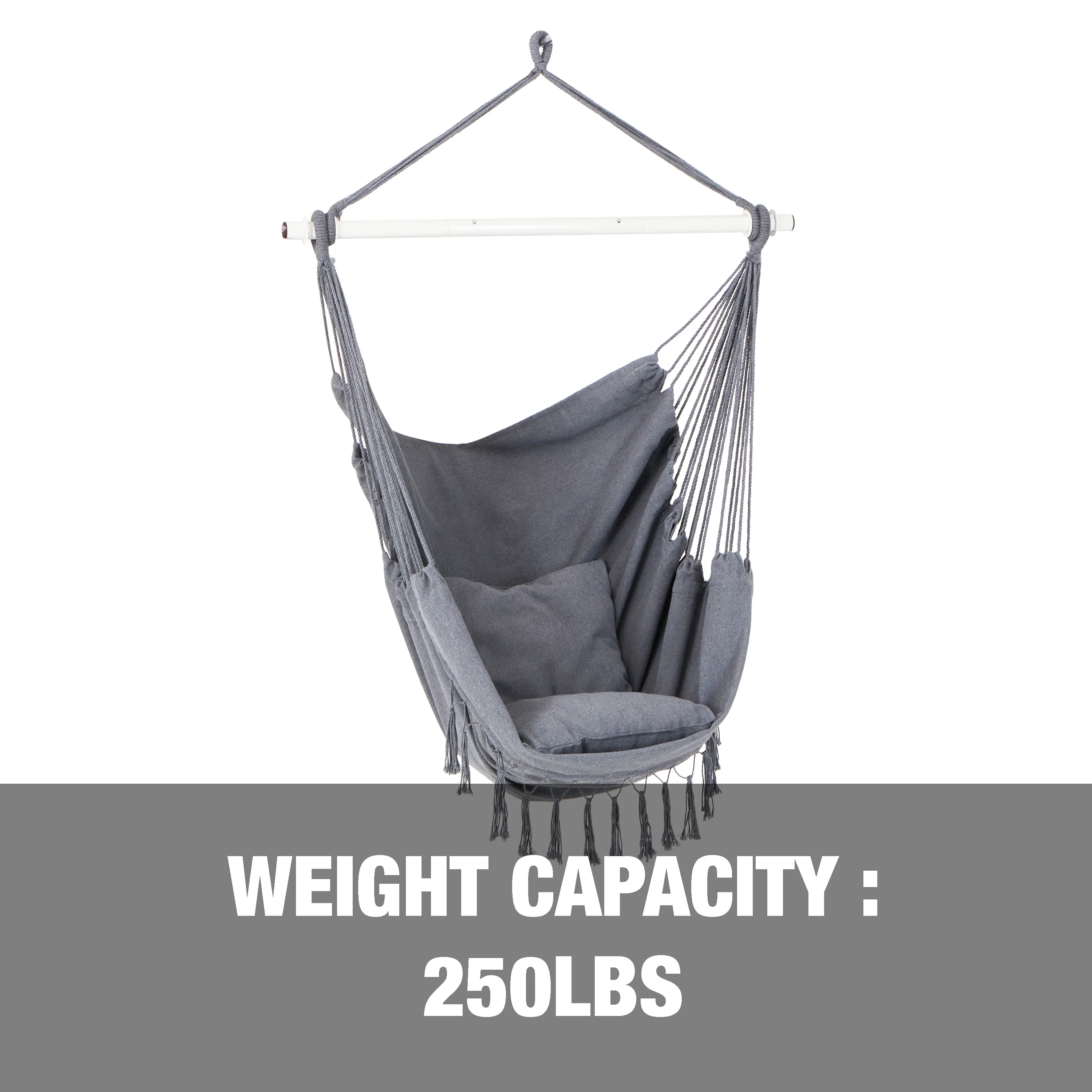 SLEEK & STYLISH: Exquisite hand-woven decorative macramé fringe design on a poly/cotton woven fabric that’s durable and breathable so it aerates your body while sitting in it. COMFORTABLE: Includes 2- 14.5″ x 14.5″ square pillows in matching color for added comfort. CONVENIENCE: No assembly required. Built in side pocket to hold phones, books, iPad, Drinks and More. Coated steel hanging hardware included: Indoor mount with screws and anchors, 12″ chain, S Hook and carabiner. STRONG & DURABLE: Collapsible powder coated steel spreader bar for easy storage, with a weight capacity of 250 lbs. LARGE SEATING AREA DIMENSIONS: 63″L X 40″ W X 55″H Large enough to sit or recline.