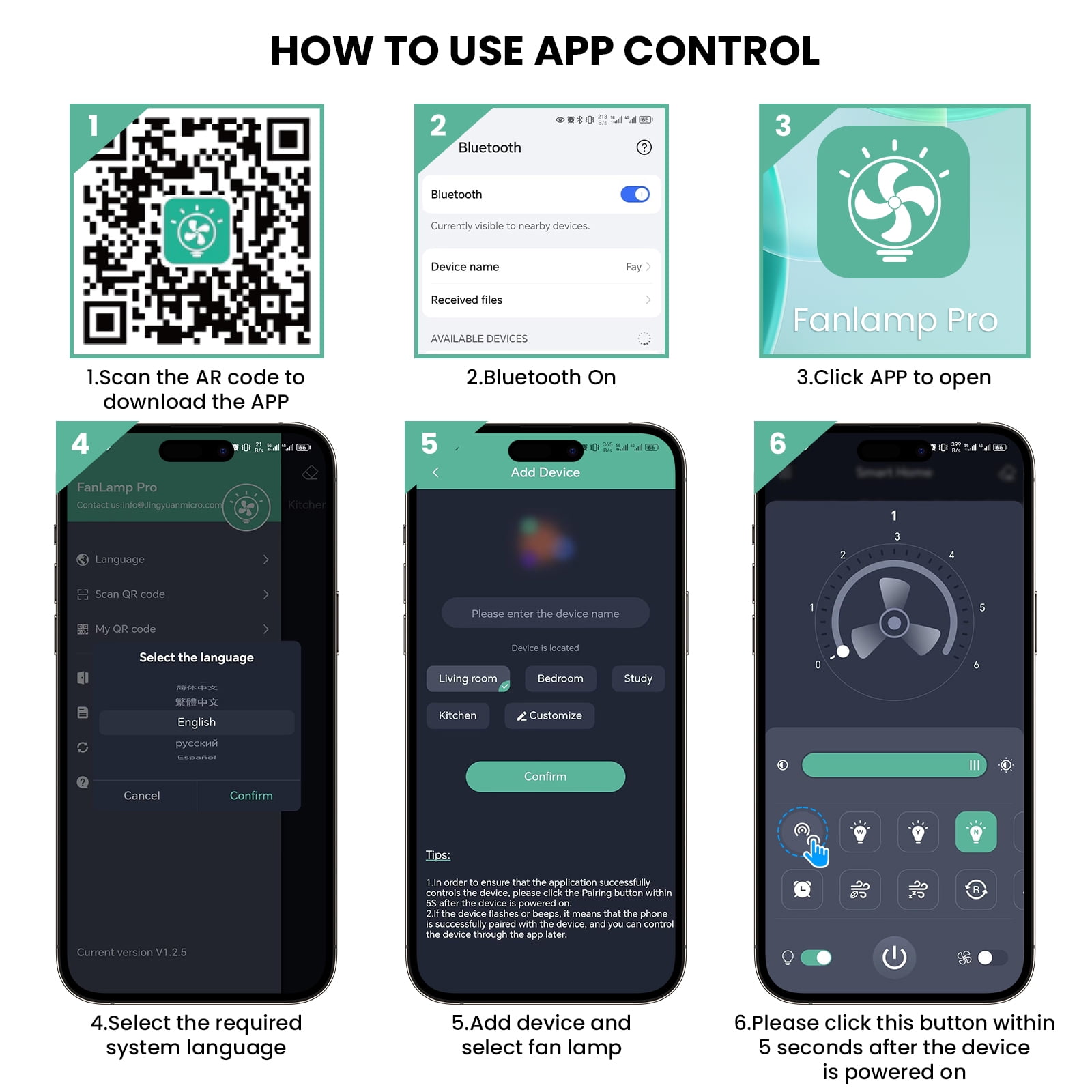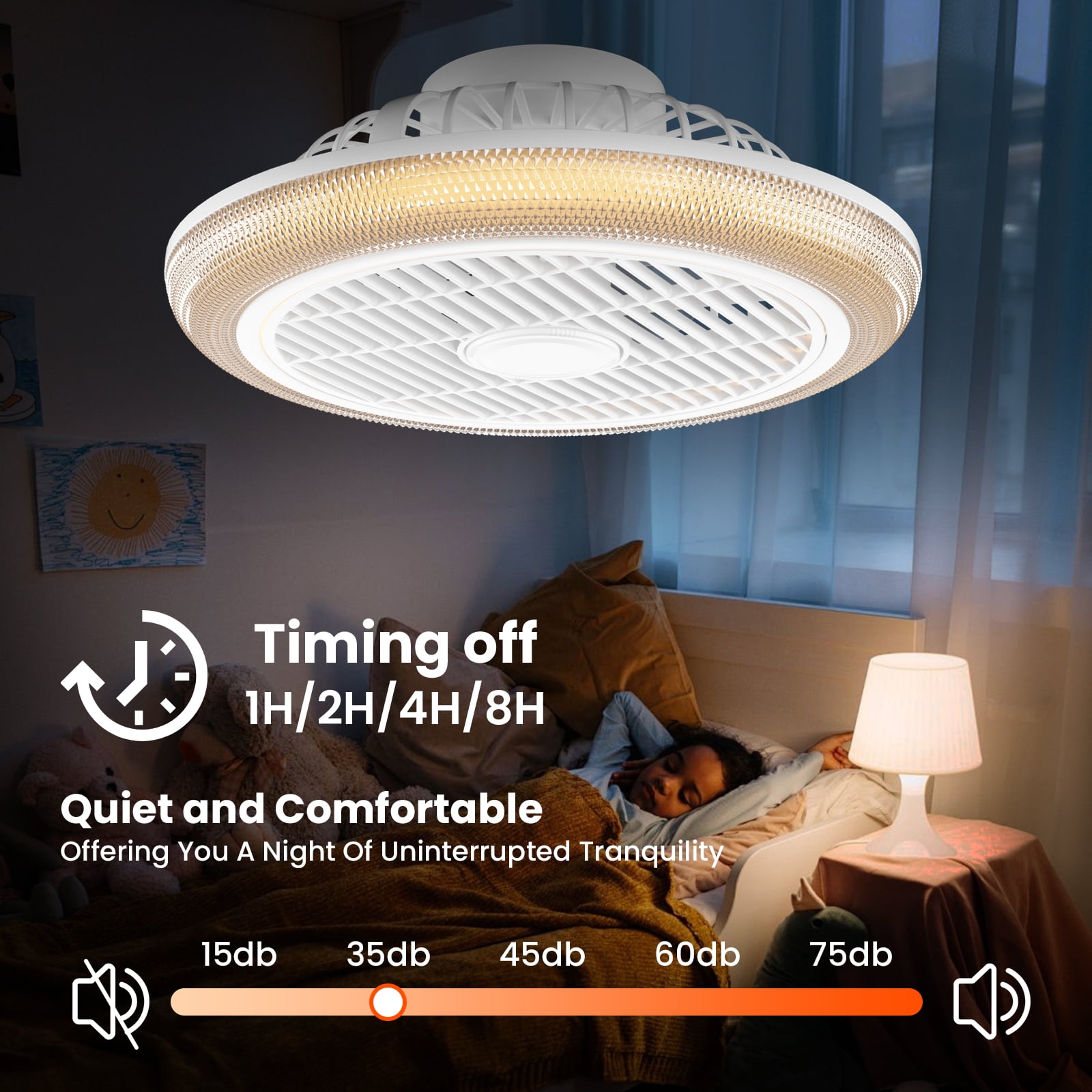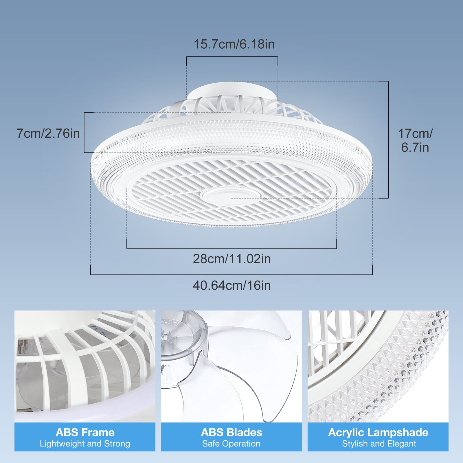 ▶SPECIFICATIONS: Type Modern Color White Material ABS+Metal+Acrylic Dimensions 16x16x6.7 inch Light Source LED Fan Voltage 110 V Fan Wattage 60 W Sound Level 35 dB Mounting Type Ceiling Mount Numbers of Blades 7 Numbers of Speeds 6 Control Method Remote +APP+Wall switch Grounding Device No grounding requirement, double insulation structure Special Feature RGB Ligth,Dimmable,Timer,Color Temperature Selectable,Reverse Function ▶ PACKAGE LIST: 1 x Ceiling fan with light 1 x Remote control(battery not included) 1 x English manual 1 x Accessory bag ▶ NOTE:Code Matching Operation Remote Control Code Matching: Turn on the power, press and hold the “Color temperature dimmer switch” button within 5 seconds after the light turns on, and when you hear a “beep” sound or the indicator light flashes, the code binding is successful. APP Code Matching: Click the code matching button within 5 seconds after turning on the light. If the light source flashes or the buzzer beeps, it proves that the code pairing is successful. ▶KEY FEATURES: 【Acrylic Crystal Sand Lampshade Design】 This low profile Flush Mount Ceiling Fan 16” x 6.7” , Upgraded in appearance, the high transparency Acrylic lampshade brings a unique experience to your space.Suitable for children’s rooms, living rooms, bedrooms, bgame room, party, festival etc. 【RGB Color Light and Dimmable White】 The Smart fan with RGB back light,supports Various RGB light mode conversions,to fit any mood or occasion. It also includes dim or brighten the Front White light,LED light source can support 3000K warm light to 6500K daylight adjustment 【Smart APP & Remote Control】 This smart ceiling fan of ours can be controlled using wall switch, remote control, and mobile APP. You can find on the manual to carry out QR code scanning to download APP, connect the light to Bluetooth.Without getting up,adjust the light change, switch it on/off, speed adjustment, timing setting, reverse steering .And includes light memory functions. 【6-Speed adjustable & Reversible Motor】 Our Enclosed ceiling fan features 6 wind speeds to choose from, it also has a rotation reversal function, summer mode produces downward airflow (keeps you cool), and winter mode produces upward airflow (air circulation). Is equipped with air guide wheels, which can make the airflow smoother and wider. 【Easy to Install & Safe Design】 Most functional components are pre-assembled, and all accessories are included, so all you have to do is mount it onto your ceiling.The removable wind deflector also makes it easy to clean without removing the entire ceiling fan. Fully enclosed structure, safer than traditional ceiling fans;
