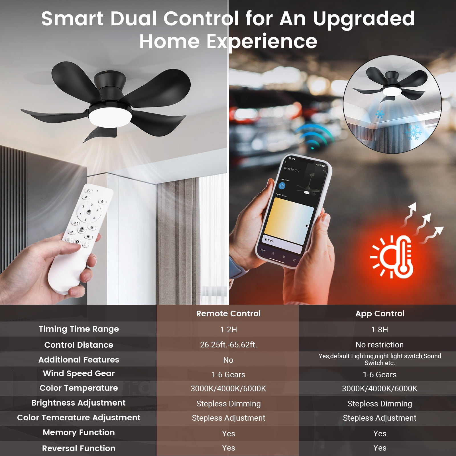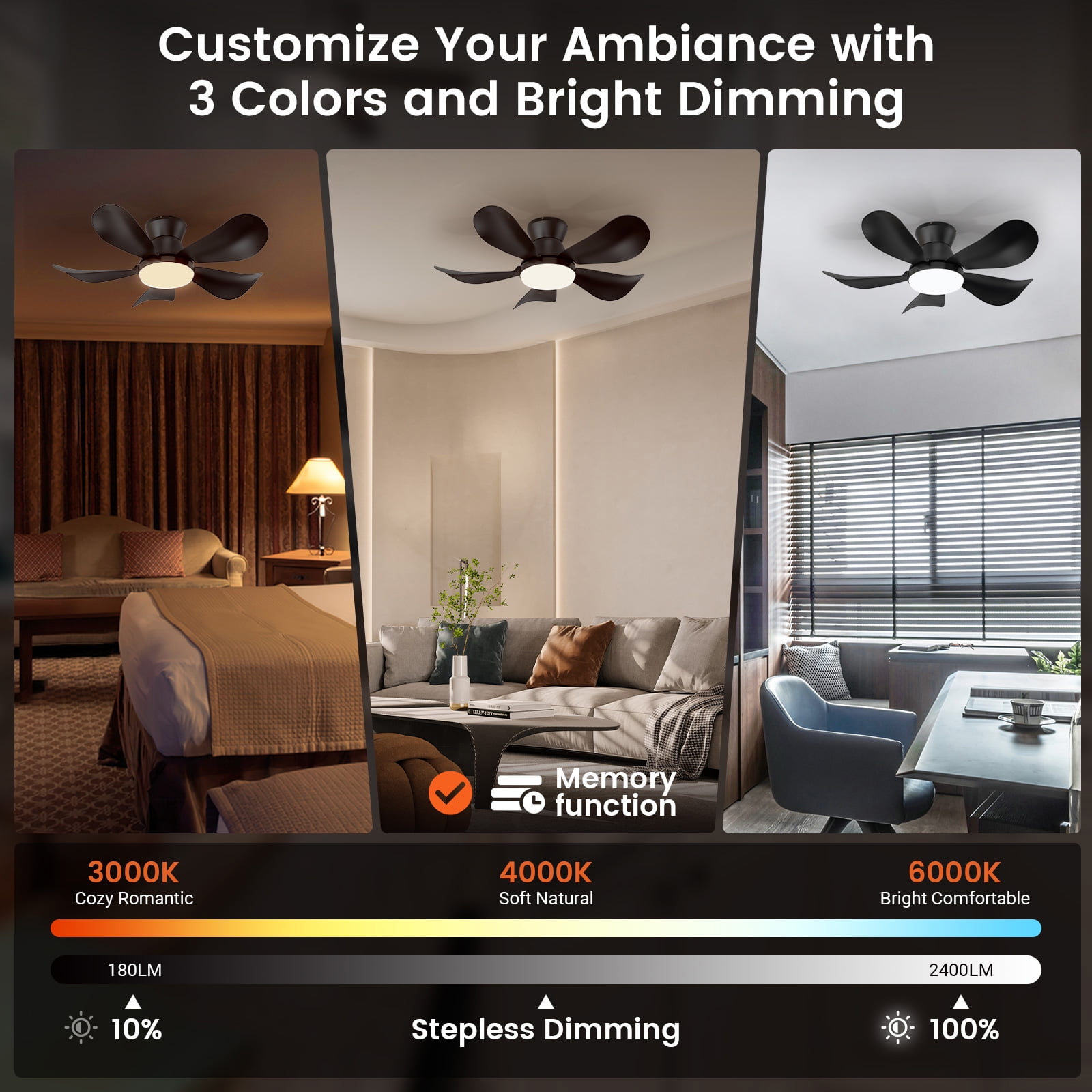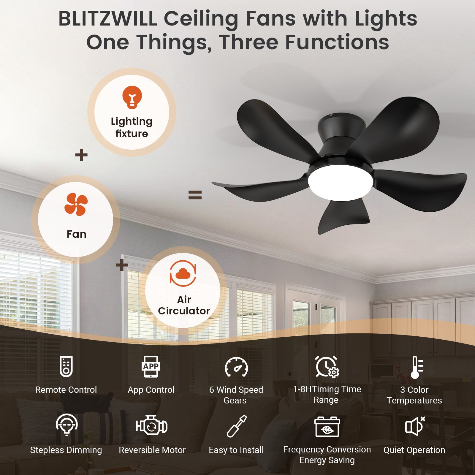 BLITZWILL Ceiling Fans with Lights and Remote & App Control,26 inch Low Profile Modern Ceiling Fans with 5 Reversible Blades,3 Colors Dimmable 6 Speeds Quiet, for Bedroom Kitchen Garage,Black