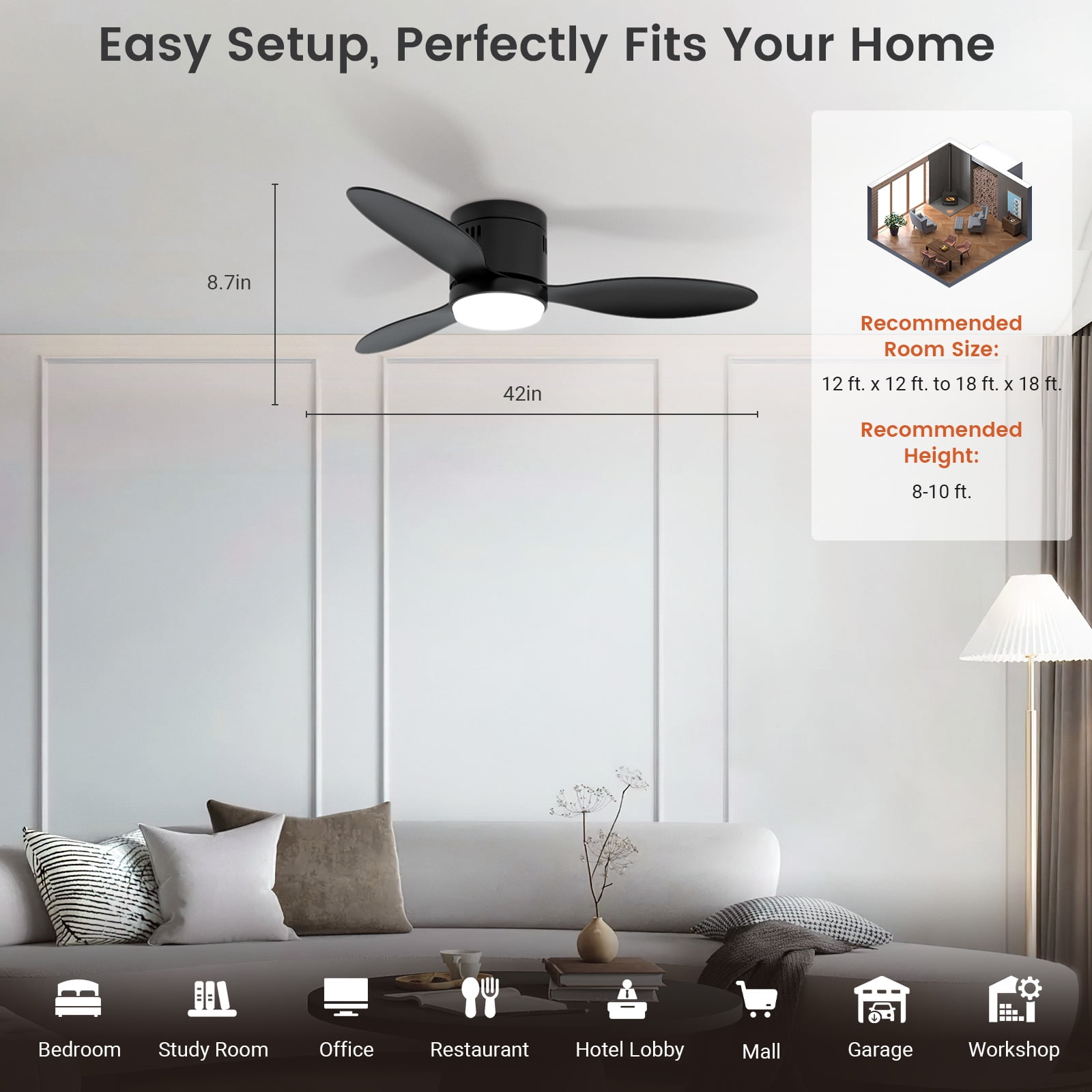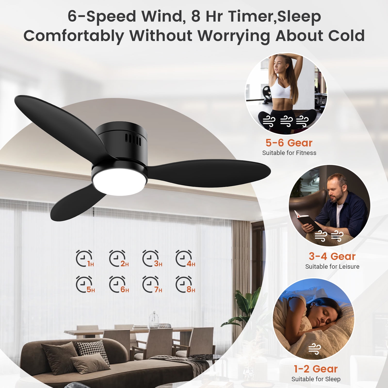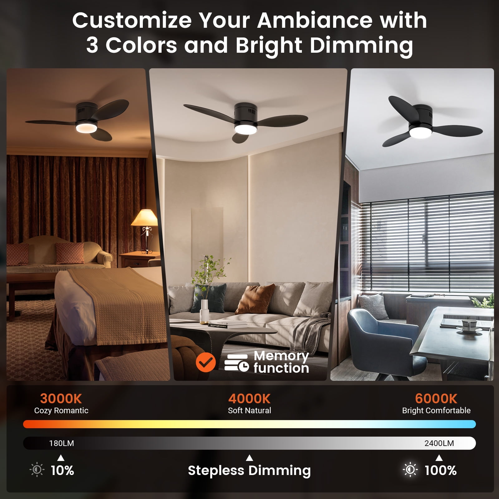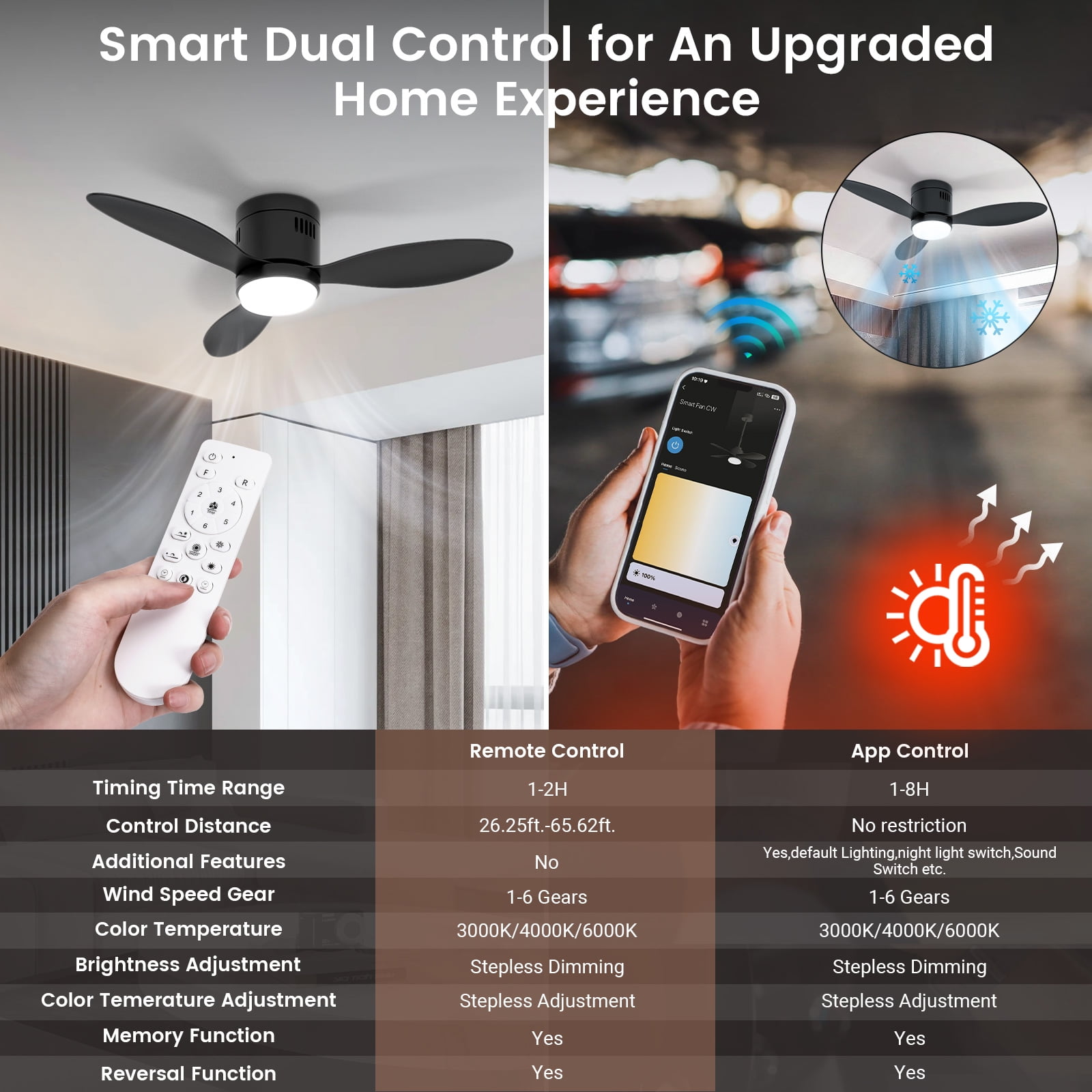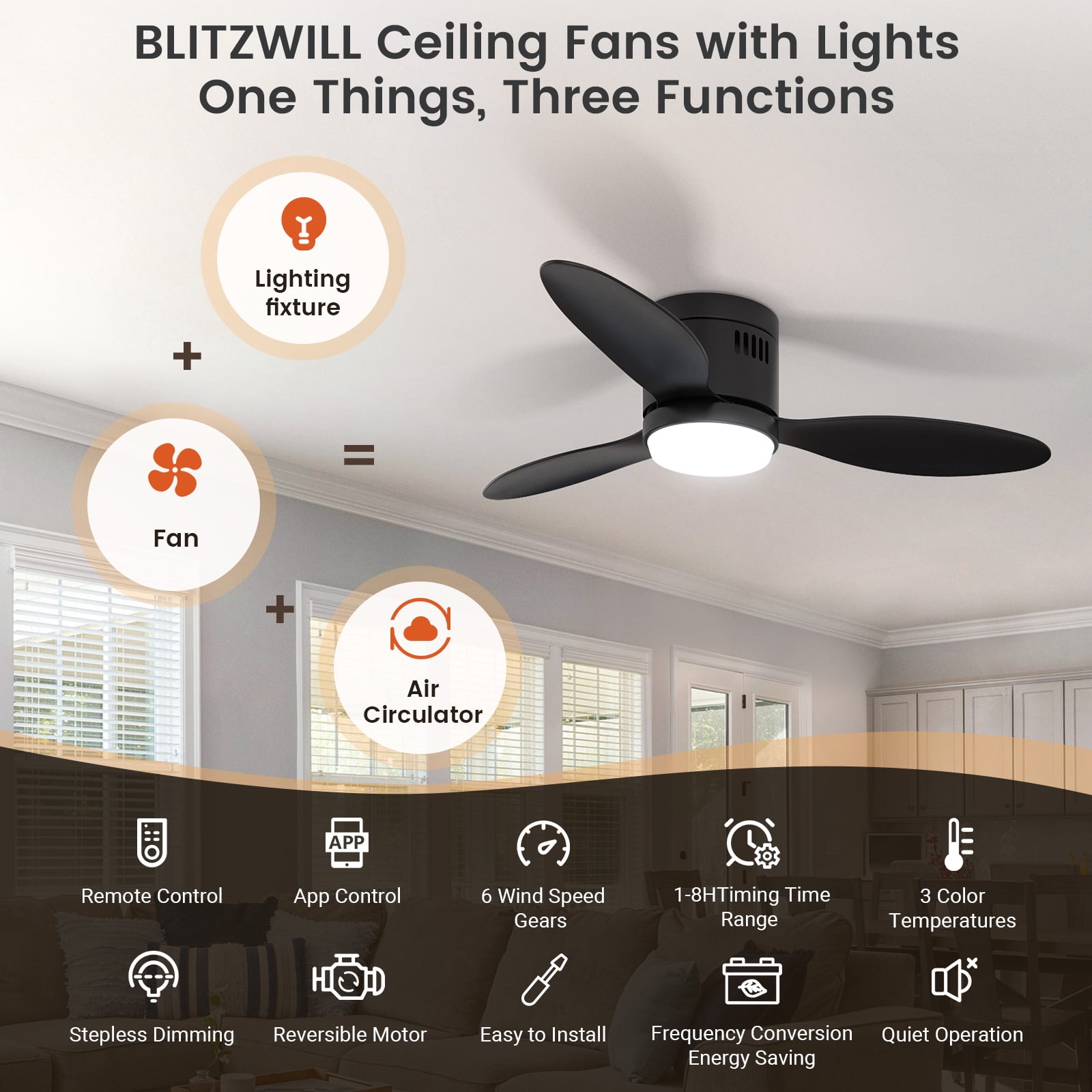▶ KEY FEATURES: Low Profile Ceiling Fan Elevate your living space with our low profile ceiling fans, meticulously designed for rooms with lower ceilings. Experience efficient cooling without sacrificing valuable space. Its compact yet powerful design ensures optimal airflow, creating a comfortable environment in small room. Remote / 2.4 GHz WiFi APP Control By the remote controller or WiFi APP,puts you in command of your ceiling fan’s speed, direction, and lighting effortlessly.No matter where you are,enjoy the convenience of intelligence.Say goodbye to reaching for pull chains. DC Motor Technology The BlitzWill ceiling fans operates with energy savings,powered by advanced reversible DC motor technology.In the summer, bask in the cool breeze as the fan’s forward airflow. Come winter, engage the reverse function to ensuring a cozy and evenly heated space.Powerful DC motor ensures smooth, ultra-quiet blade operation( the noise level less than 35 dB) Memory Function & High Brightness The memory function allows you to save and recall your preferred fan speed and light settings. With this feature, you can easily return to your desired settings without the need for readjustment every time you turn on the fan with ceiling flight. (Note: make sure the light is off for at least 10 seconds).This low profile ceiling fan uses thin flat integrated 2834LED light source,provides bright and energy-efficient lighting. After-sales Service and Easy To Install We provide detailed installation instructions and videos, Make your installation easy and efficient.For any other assistance, please reach out to our dedicated customer service team. ▶ SPECIFICATIONS: Brand: BLITZWILL Style: Modern Dimensions: 36/42/52in(Optional) Color:Black/White/Walnut(Optional) Material: Metal Shell + ABS Fan Blade + Pure Copper Motor Lamp type: 2834LED (56 lamp beads: 28 pure white + 28 warm white) Lighting power: 25-60W Voltage: 110-265V DC Motor power: 24W Memory Function: support Motor Reversal: Support Noise: Less Than 35db Air Volume: 1.41m/s Number of Blades: 3 blade Remote Control distance: 8-20m