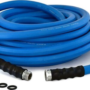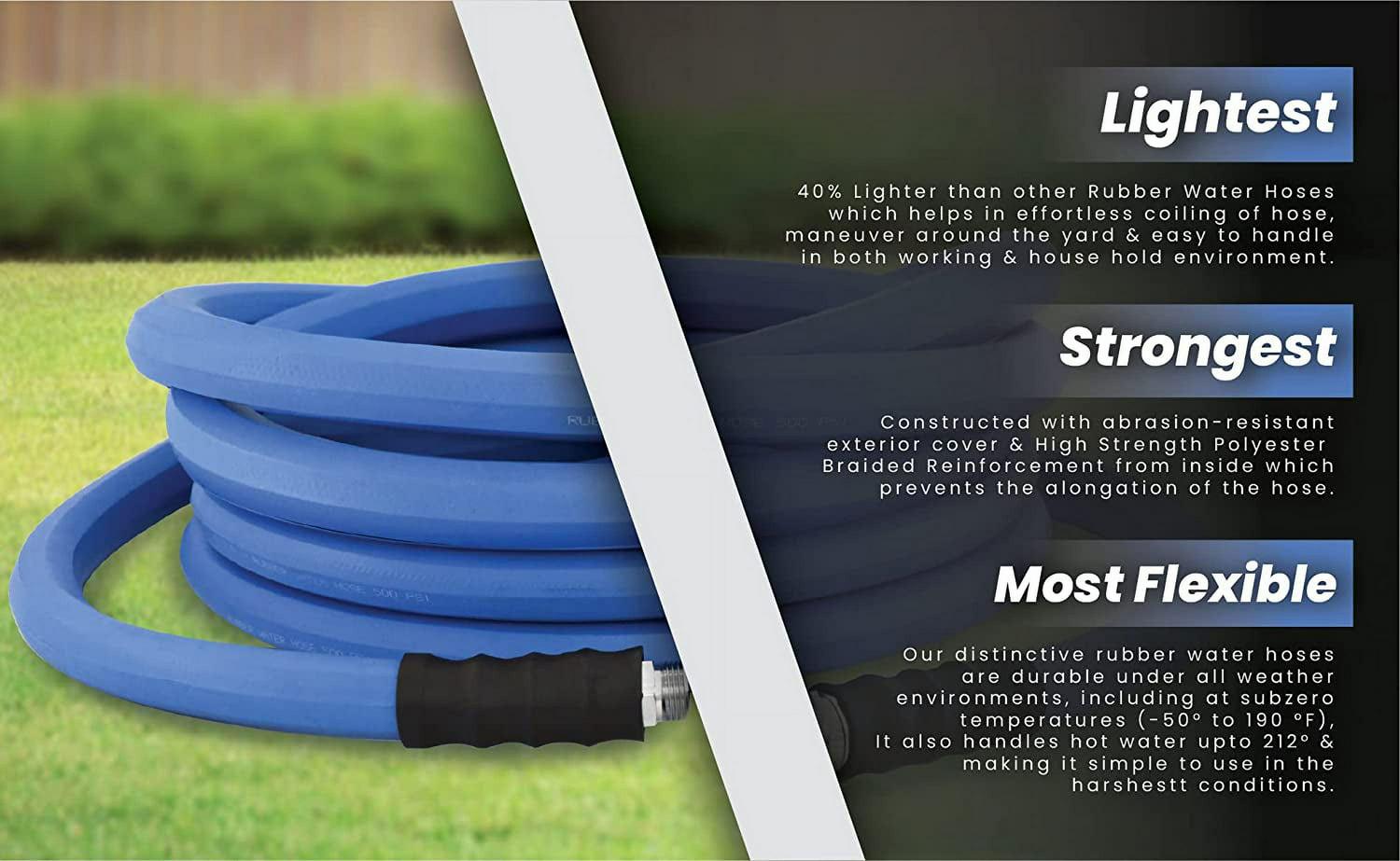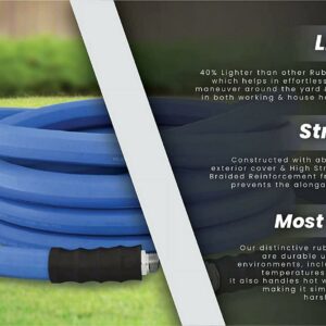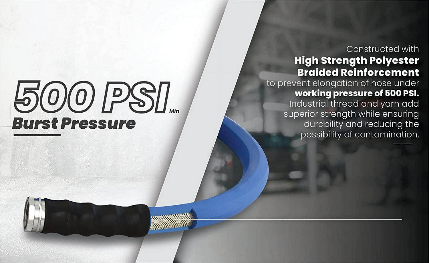Solid crush-proof chrome plated brass fittings and handles hot water up to 200 degrees Fahrenheit. The BlueHose 1″ x 50′ 500 PSI rubber water hose with 3/4″ GHT couplings. Ultra lightweight, durable and super strong premium grade hot water hose. Constructed with high strength polyester braided reinforcement with ozone resistant cover providing protection from extreme weather, abrasions and kinks. Flexibility in extreme conditions from -50 to 180 degrees Fahrenheit. Oil resistant core tube meets RMA Class C oil resistance and four finger grip bend restrictor for easy use and better durability.