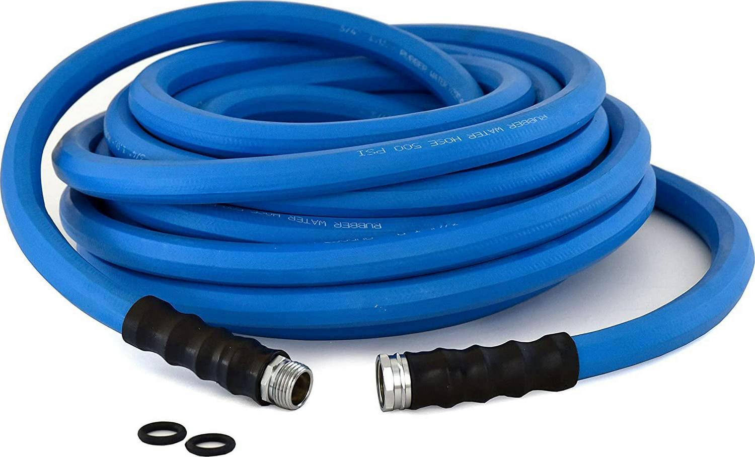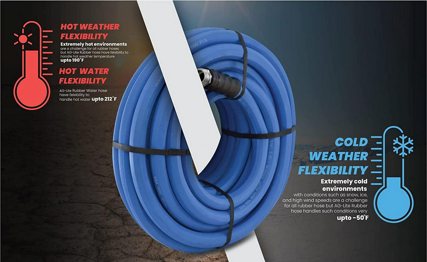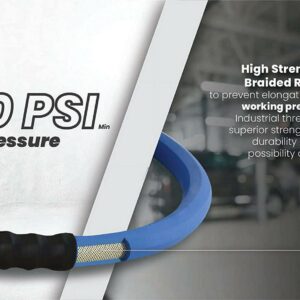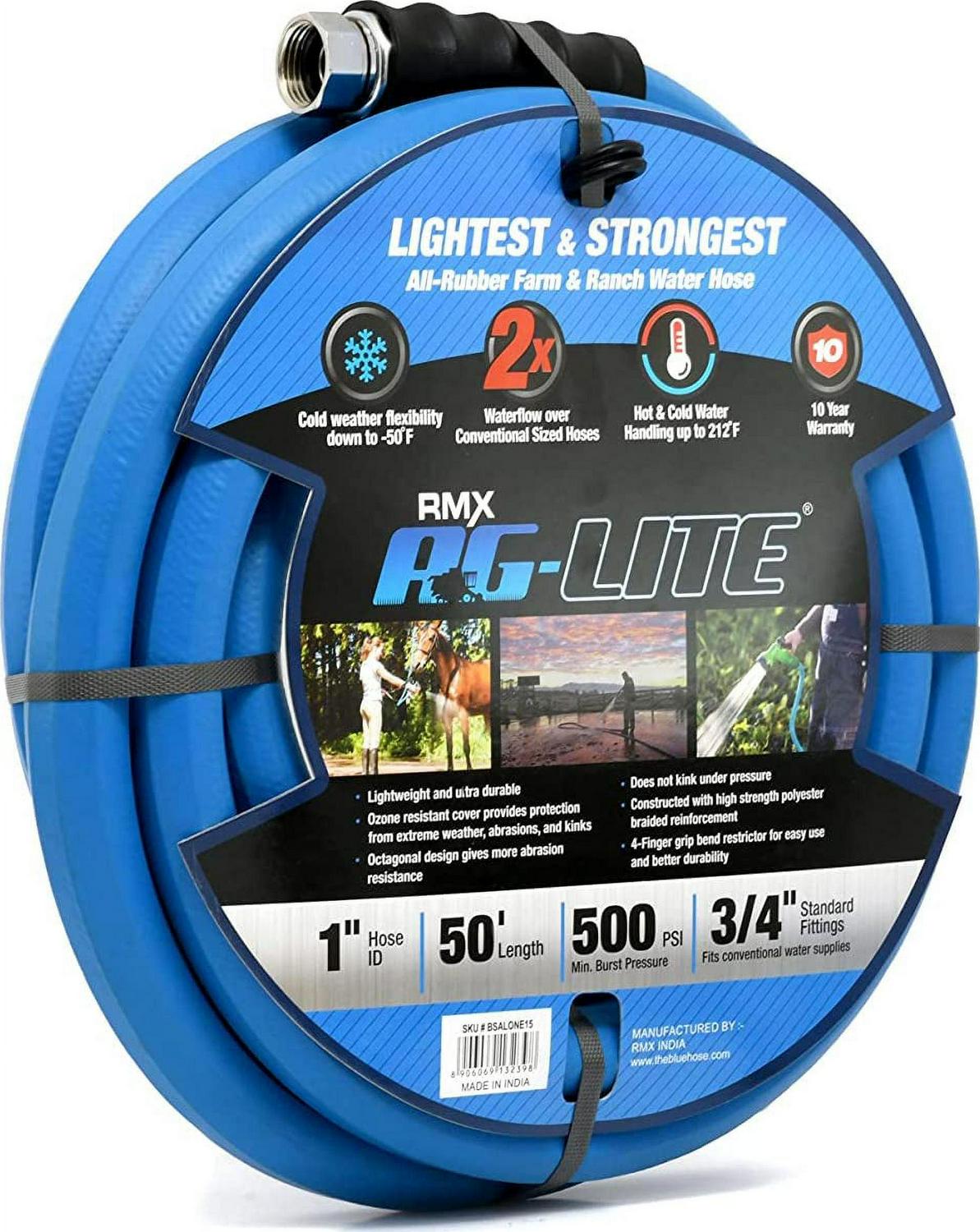 Solid crush-proof chrome plated brass fittings and handles hot water up to 200 degrees Fahrenheit. The BlueHose 1″ x 50′ 500 PSI rubber water hose with 3/4″ GHT couplings. Ultra lightweight, durable and super strong premium grade hot water hose. Constructed with high strength polyester braided reinforcement with ozone resistant cover providing protection from extreme weather, abrasions and kinks. Flexibility in extreme conditions from -50 to 180 degrees Fahrenheit. Oil resistant core tube meets RMA Class C oil resistance and four finger grip bend restrictor for easy use and better durability.