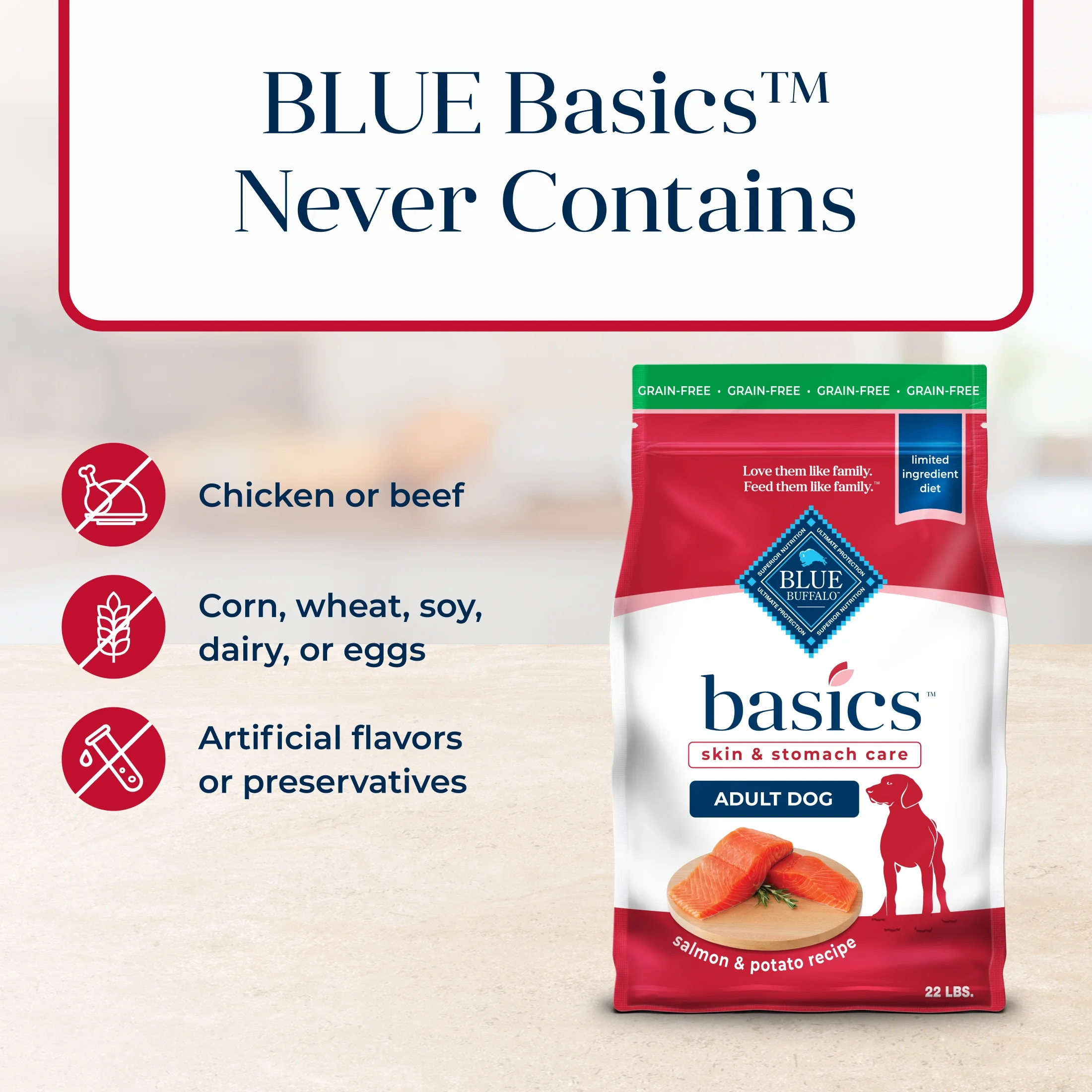 REAL SALMON FIRST: This Blue Buffalo dry dog food is made with real, high-quality salmon as the #1 ingredient ADULT DOG FORMULA: This natural dog food is made with healthy ingredients that support gentle digestion, plus Omega 3 & 6 fatty acids to nourish skin & coat IMMUNE SYSTEM SUPPORT: This grain-free dog food contains exclusive, antioxidant-rich LifeSource Bits HEALTHY, WHOLESOME INGREDIENTS: This Blue Buffalo dog food is made with no chicken (or poultry) by-product meals, and no corn, wheat, or soy Contains: One (1) 22-lb. bag of BLUE Basics Skin & Stomach Care Adult Grain-Free Dry Dog Food, Salmon & Potato Recipe ENHANCED IMAGERY: We have enhanced our digital product packaging to highlight our products’ ingredients and essential benefits. While the physical packaging will differ slightly, all information is accurate.