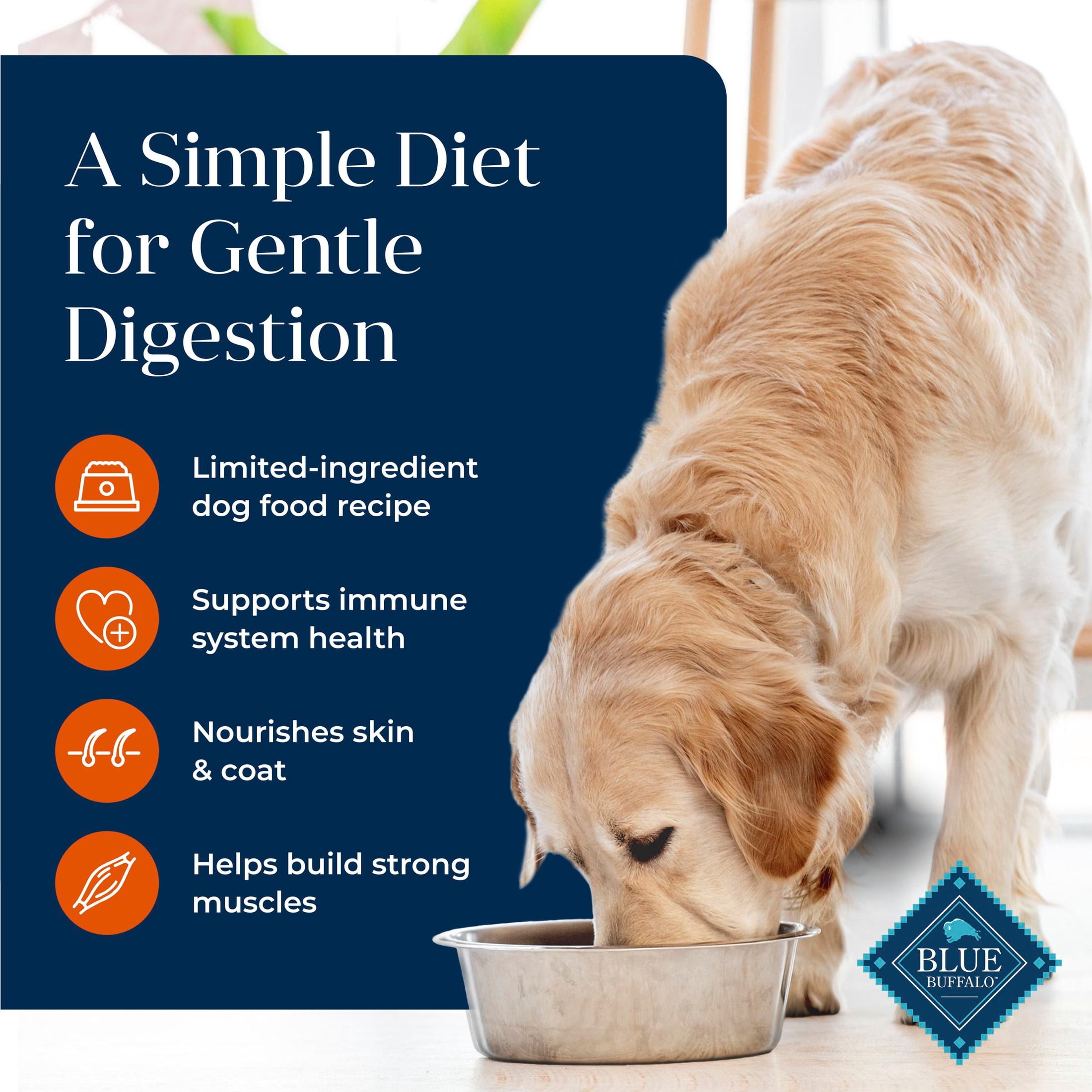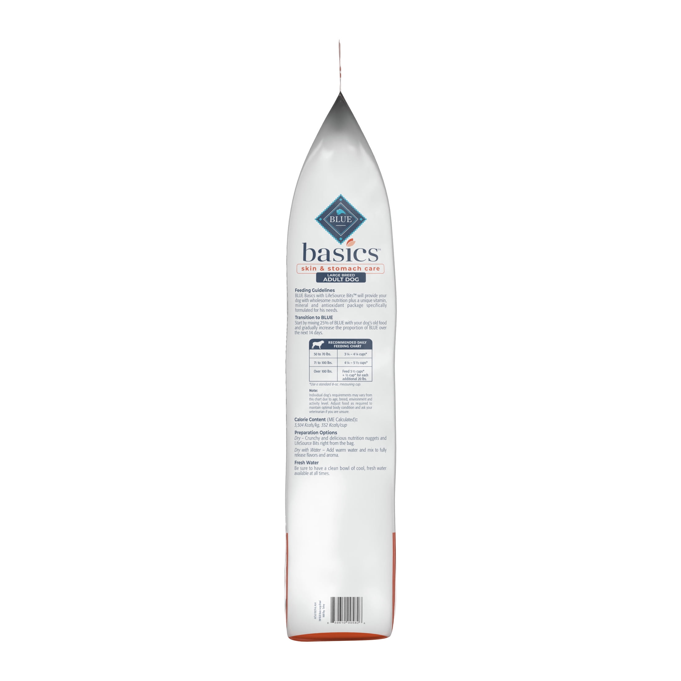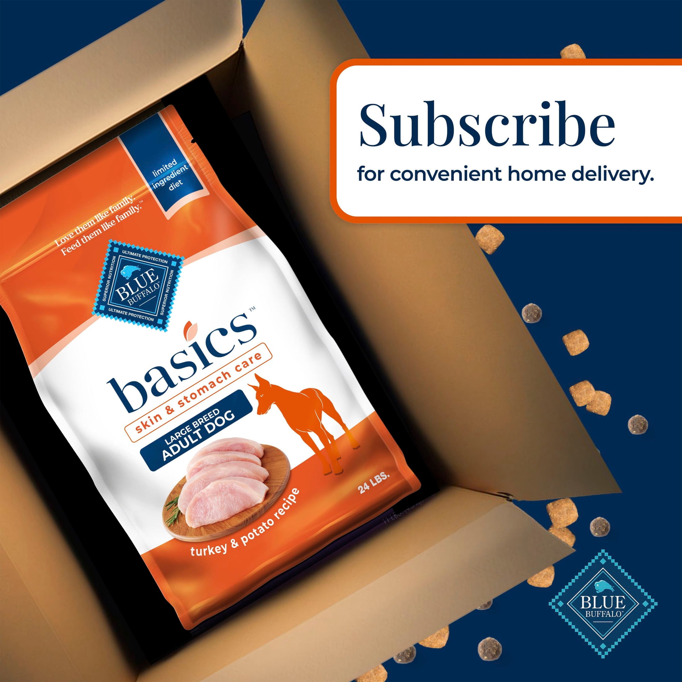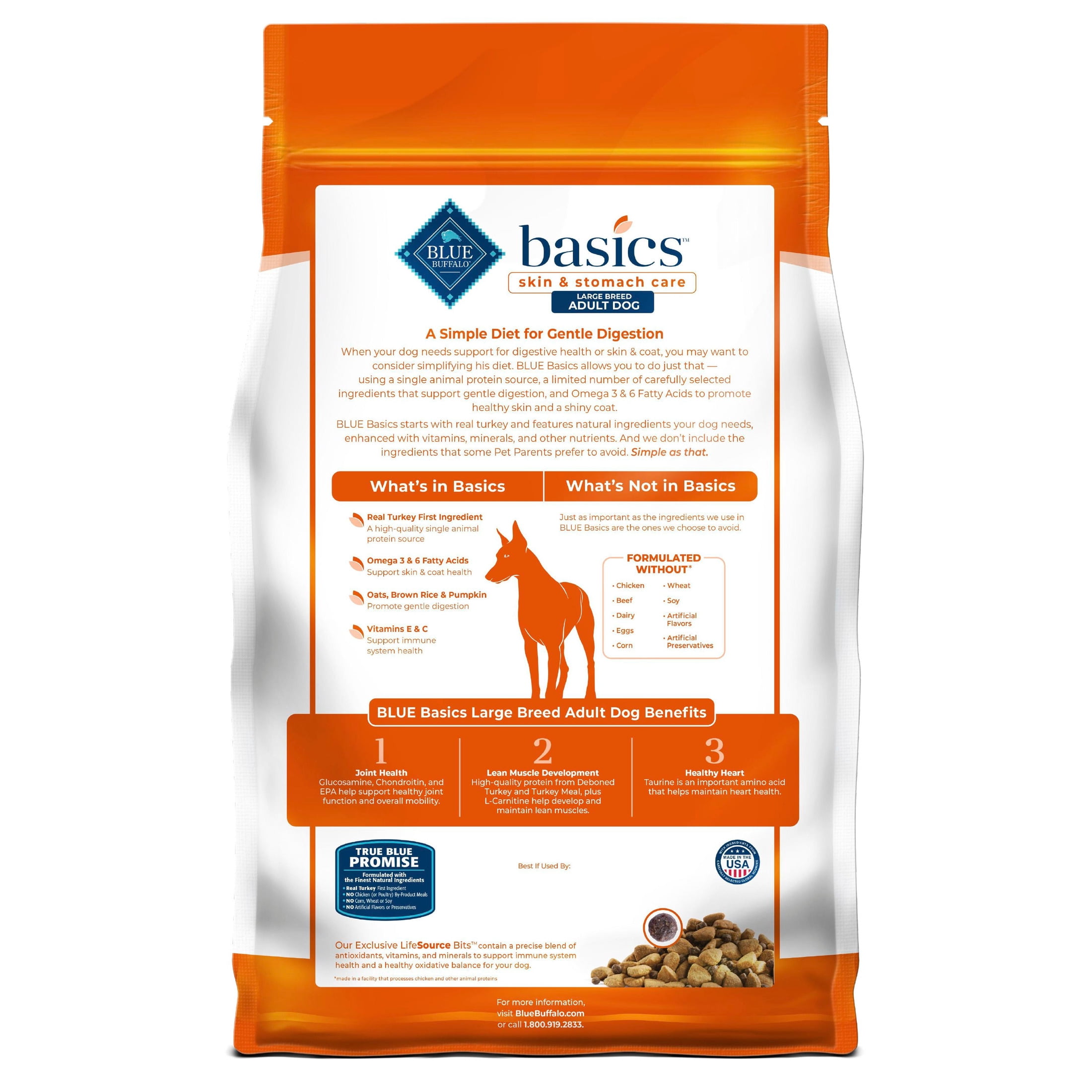 REAL TURKEY FIRST: This Blue Buffalo dry dog food is made with real, high-quality turkey as the #1 ingredient LARGE BREED ADULT DOG FORMULA: This natural dog food is formulated with healthy ingredients that support gentle digestion, plus Glucosamine, Chondroitin, and EPA to support healthy joints and L-Carnitine to support lean muscle development IMMUNE SYSTEM SUPPORT: This dry dog food contains exclusive, antioxidant-rich LifeSource Bits HEALTHY, WHOLESOME INGREDIENTS: This Blue Buffalo dog food is made with no chicken (or poultry) by-product meals, and no corn, wheat, or soy Contains: One (1) 24-lb. bag of BLUE Basics Grain-Free Large Breed Adult Dry Dog Food, Limited Ingredient Diet, Turkey, 24 lbs. ENHANCED IMAGERY: We have enhanced our digital product packaging to highlight our products’ ingredients and essential benefits. While the physical packaging will differ slightly, all information is accurate.