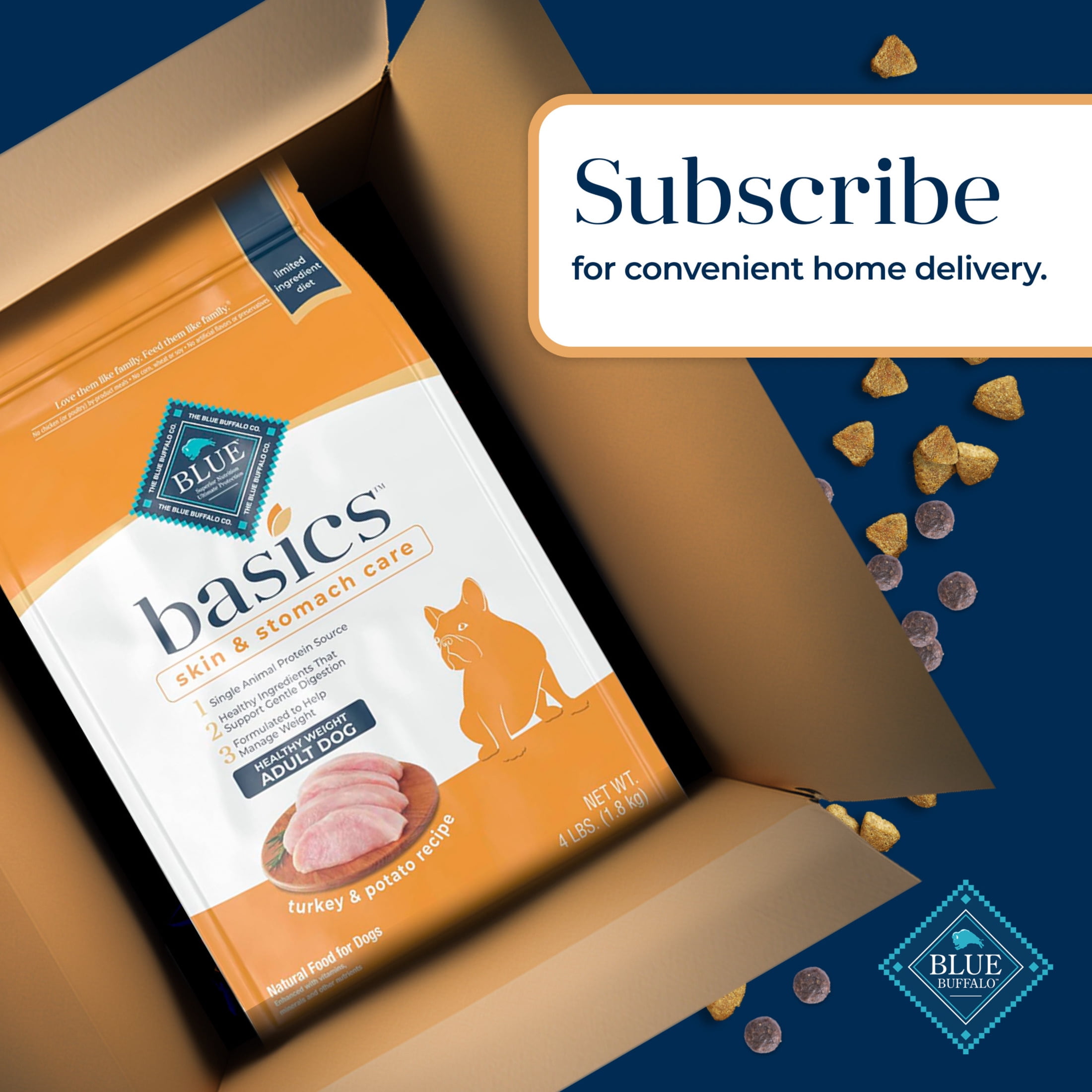 BLUE Basics Healthy Weight Turkey and Potato Recipe for Adult Dogs is a deliciously simple limited-ingredient diet for skin and stomach care. It’s designed to support healthy skin and gentle digestion. This dry dog food starts with real turkey as its only animal protein source and contains no corn, wheat, soy, dairy, or eggs, making it ideal for dogs with food sensitivities. This BLUE Basics Healthy Weight formula contains L-Carnitine and fiber to help support your dog’s optimal weight while providing a satisfying meal. Like all BLUE dry foods, BLUE Basics includes exclusive antioxidant-rich LifeSource Bits, which are “cold-formed” to retain their potency. Give your dog the balanced nutrition of BLUE Basics today. BLUE Basics is brought to you by Blue Buffalo, the leader in natural pet food. Blue Buffalo makes premium-quality pet foods featuring real meat first, wholesome whole grains, and healthy fruits and vegetables. Love them like family. Feed them like family.