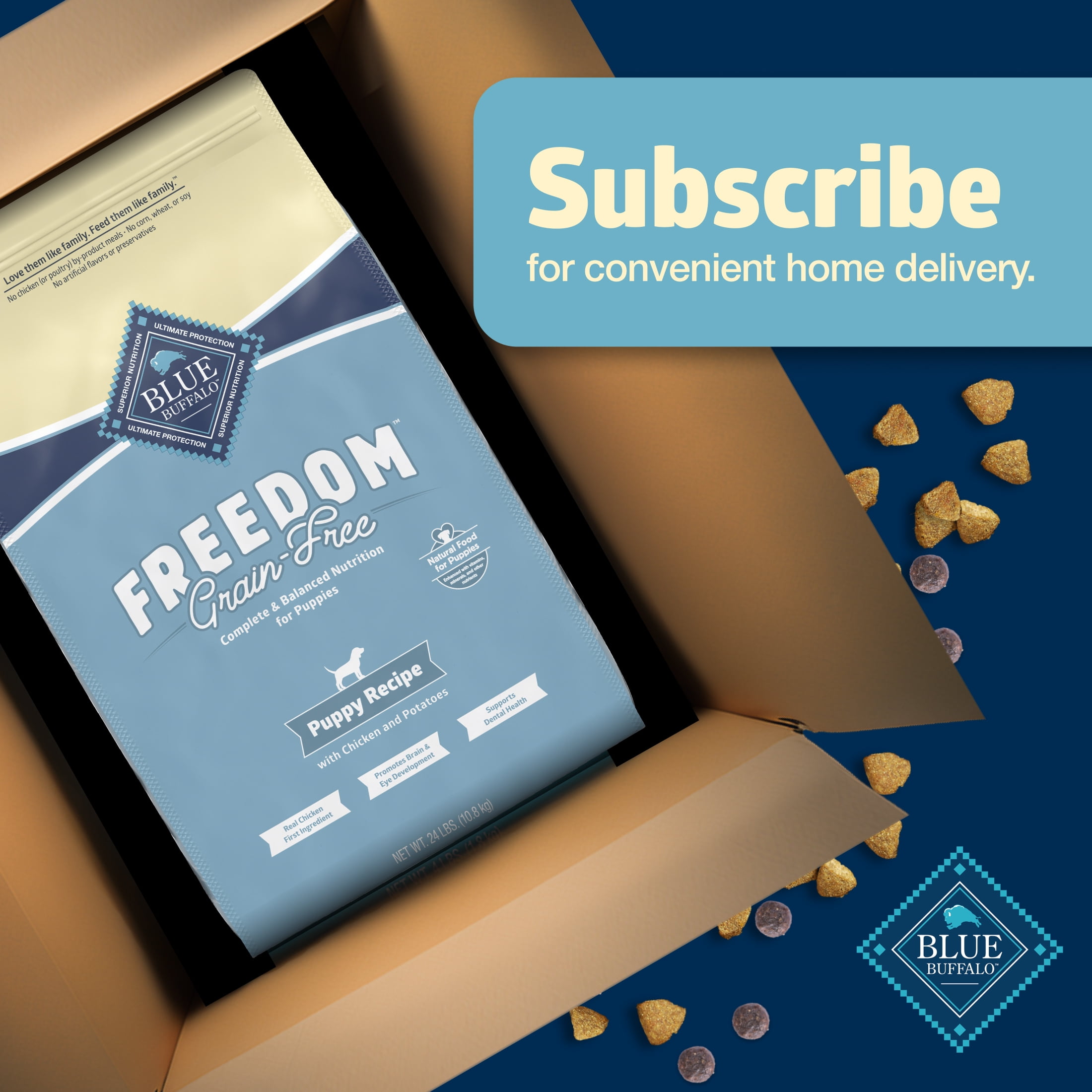 REAL CHICKEN FIRST: This grain-free dog food for puppies is made with real, high-quality chicken as the #1 ingredient ESSENTIAL NUTRITION FOR PUPPIES: This puppy food with DHA and ARA promotes brain and eye development IMMUNE SYSTEM SUPPORT: Nutritious puppy food that contains exclusive, antioxidant-rich LifeSource Bits HEALTHY, WHOLESOME INGREDIENTS: This Blue Buffalo dog food is made with no chicken (or poultry) by-product meals and no corn, wheat, or soy Contains: One (1) 24-lb. bag of BLUE Freedom Grain-Free Dry Puppy Food, Chicken Recipe ENHANCED IMAGERY: We have enhanced our digital product packaging to highlight our products’ ingredients and essential benefits. While the physical packaging will differ slightly, all information is accurate.