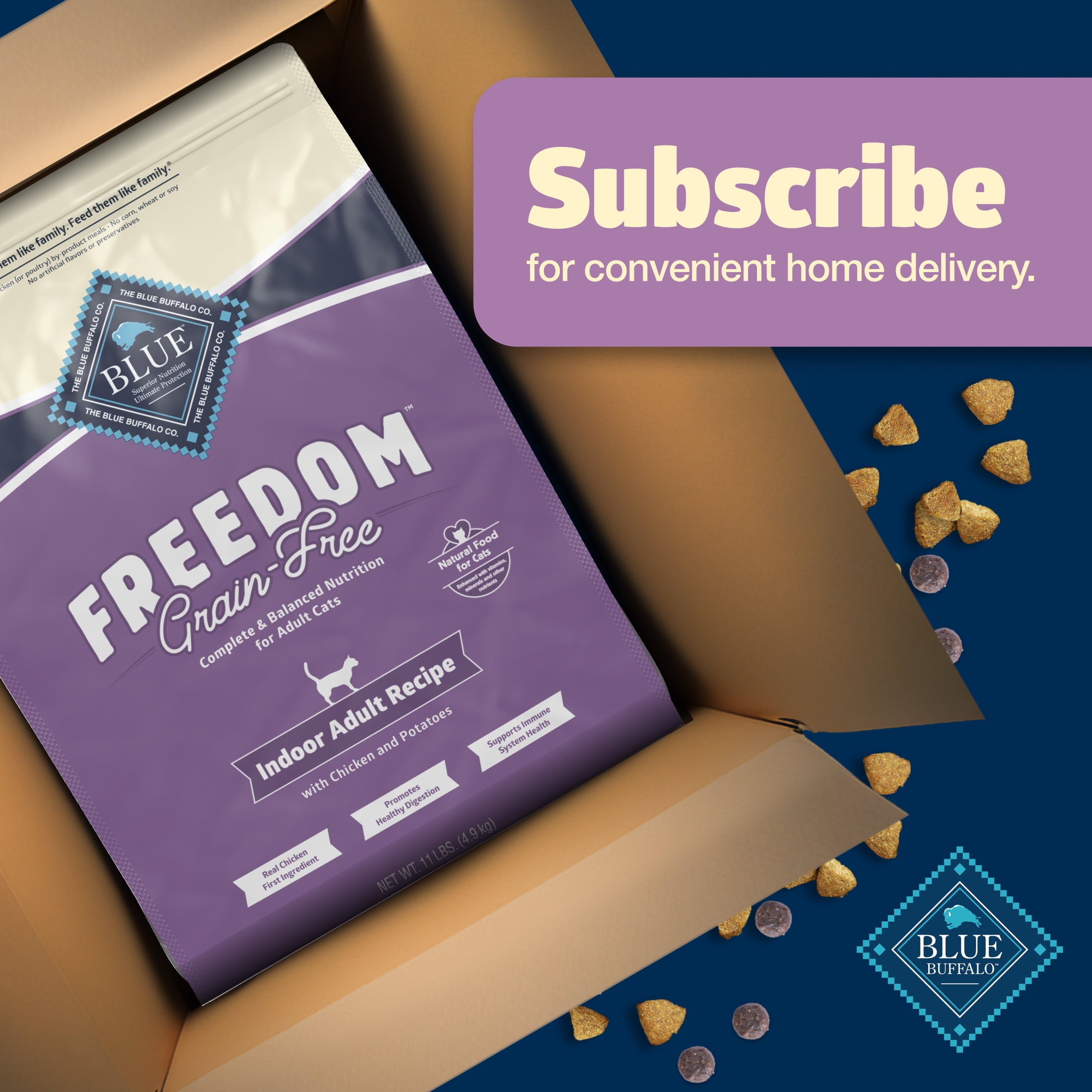 REAL CHICKEN FIRST: This Blue Buffalo dry cat food is made with real, high-quality chicken as the #1 ingredient FOR ADULT CATS: This indoor cat food promotes healthy digestion with high-quality protein and natural sources of fiber IMMUNE SYSTEM SUPPORT: This dry cat food for indoor cats contains exclusive, antioxidant-rich LifeSource Bits HEALTHY, WHOLESOME INGREDIENTS: This grain-free dry cat food is made with no chicken (or poultry) by-product meals, and no corn, wheat, or soy Contains: One (1) 11-lb. bag of BLUE Freedom Grain-Free Adult Dry Cat Food for Indoor Cats, Chicken Recipe ENHANCED IMAGERY: We have enhanced our digital product packaging to highlight our products’ ingredients and essential benefits. While the physical packaging will differ slightly, all information is accurate.