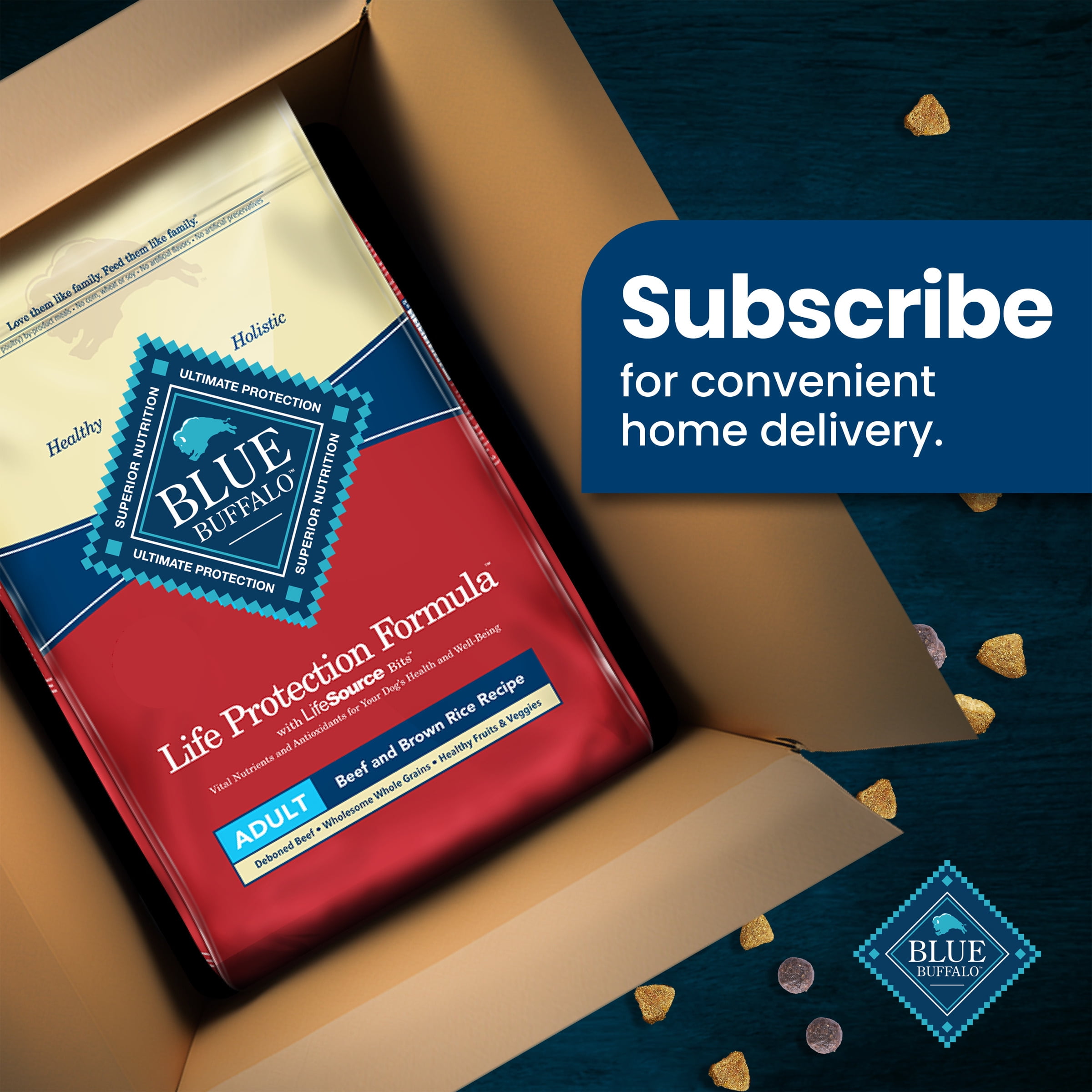 Formulated for the health and well-being of adult dogs, BLUE Life Protection Formula Beef and Brown Rice dry dog food is made with the finest natural ingredients enhanced with vitamins, minerals, and other nutrients. It’s a high-quality, balanced recipe you can both feel great about. Designed to help your dog thrive, this formula starts with real beef and contains no chicken (or poultry) by-product meals, no corn, wheat, or soy, and no artificial flavors or preservatives. Like all BLUE dry foods, BLUE Life Protection Formula includes exclusive, antioxidant-rich LifeSource Bits to support a healthy immune system in your adult dog. Give your dog the balanced nutrition of BLUE Life Protection Formula today. BLUE Life Protection Formula is brought to you by Blue Buffalo, the leader in natural pet food. Blue Buffalo makes premium-quality pet foods featuring real meat, fruit, and vegetables. Love them like family. Feed them like family.