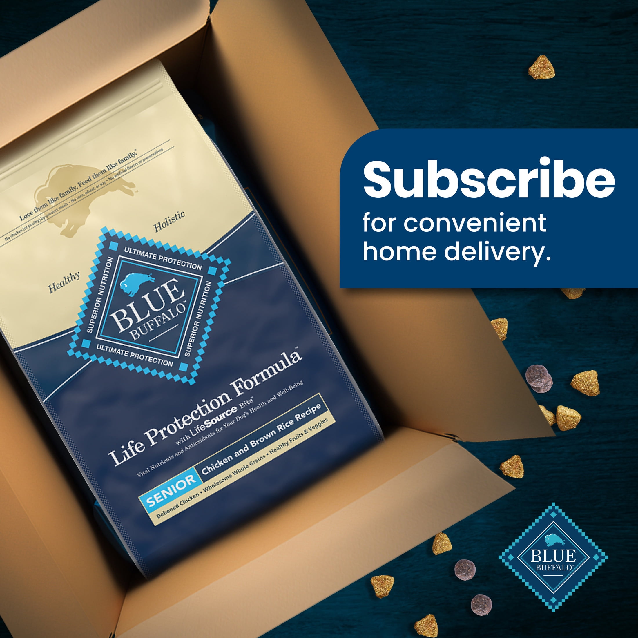 REAL CHICKEN FIRST: This Blue Buffalo dog food is made with real, high-quality chicken as the first ingredient NUTRITION FOR SENIOR DOGS: BLUE Life Protection Formula senior dry dog food with perfectly balanced essential proteins and carbohydrates to give older dogs energy to stay active IMMUNE SYSTEM SUPPORT: This natural dog food features exclusive antioxidant-rich LifeSource Bits HEALTHY, WHOLESOME INGREDIENTS: Blue Buffalo dry dog food is made with no chicken (or poultry) by-product meals and no corn, wheat, or soy Contains: One (1) 30-lb. bag of BLUE Life Protection Formula Senior Dry Dog Food, Chicken & Brown Rice Recipe ENHANCED IMAGERY: We have enhanced our digital product packaging to highlight our products’ ingredients and essential benefits. While the physical packaging will differ slightly, all information is accurate