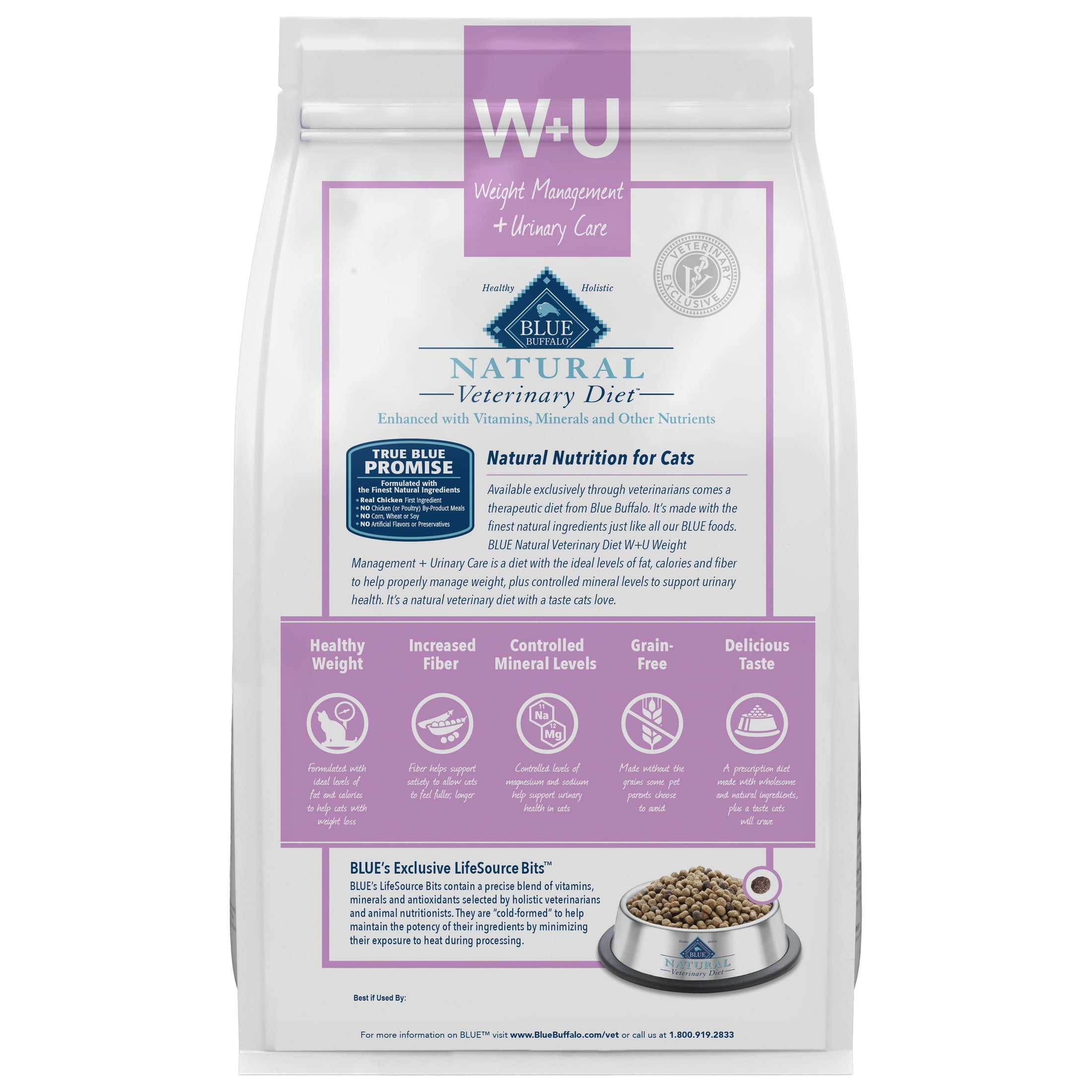 REAL CHICKEN FIRST: This Blue Buffalo wet cat food is made with real, high-quality chicken as the #1 ingredient VETERINARY-PRESCRIBED FORMULA: Formulated to help with kidney health and mobility, this dry cat food is packed with nutrition and flavor WEIGHT MANAGEMENT + URINARY CARE: Formulated to support weight management with ideal levels of fat and calories, plus fiber to help cats feel full HEALTHY, WHOLESOME INGREDIENTS: This natural cat food is made with no chicken (or poultry) by-product meals, and no corn, wheat, or soy Contains: One (1) 6.5-lb. bag of BLUE Natural Veterinary Diet W + U Weight Management and Urinary Care Dry Cat Food, Chicken Recipe ENHANCED IMAGERY: We have enhanced our digital product packaging to highlight our products’ ingredients and essential benefits. While the physical packaging will differ slightly, all information is accurate.