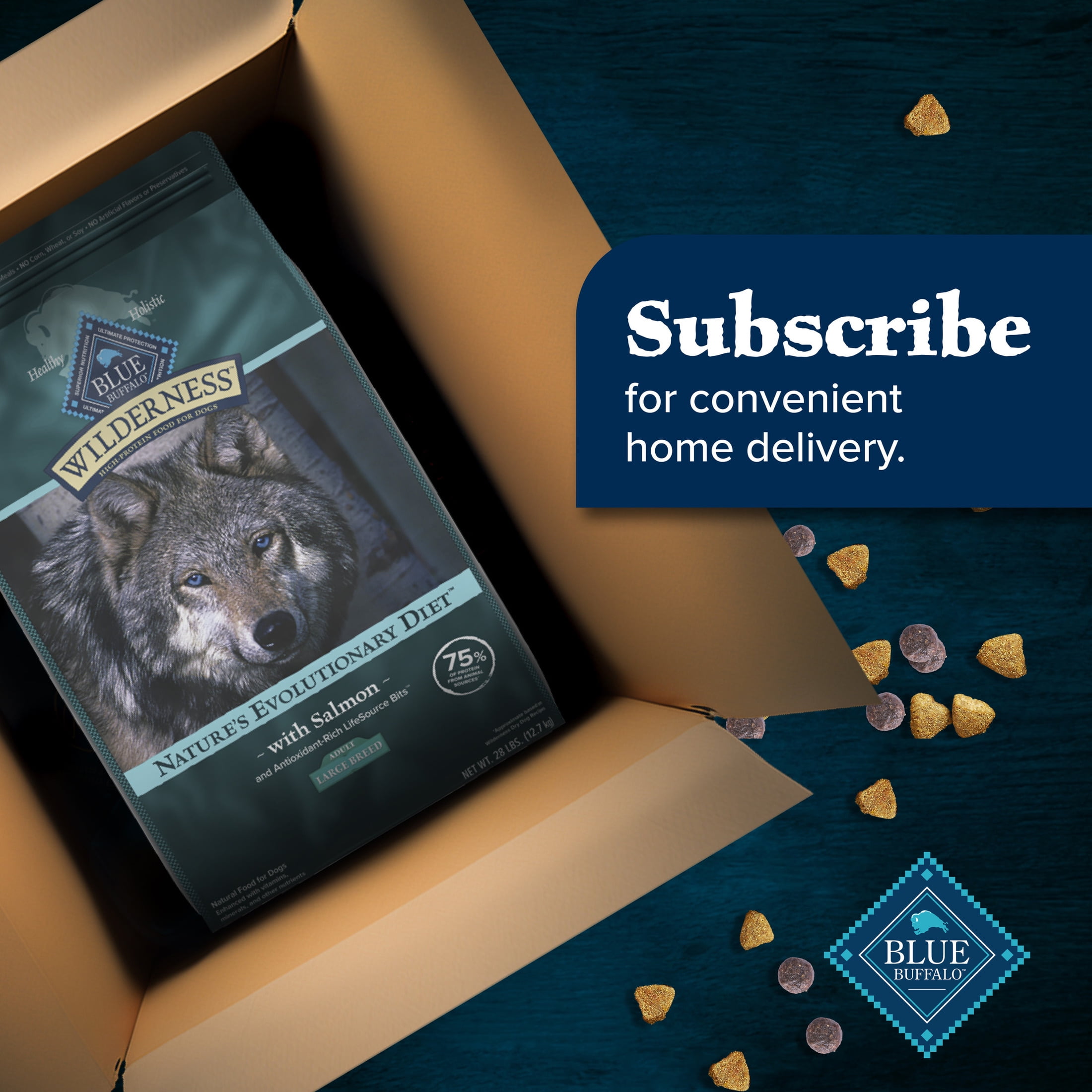 REAL SALMON FIRST: This Blue Buffalo dog food is made with real, high-quality salmon as the #1 ingredient FOR LARGE BREED DOGS: This dog food promotes muscle development, helps strengthen bones and teeth, and supports lasting mobility IMMUNE SYSTEM SUPPORT: High-protein dog food contains exclusive, antioxidant-rich LifeSource Bits HEALTHY, WHOLESOME INGREDIENTS: This natural dog food is made with no chicken (or poultry) by-product meals and no corn, wheat, or soy Contains one (1) 28-lb. bag of BLUE Wilderness High-Protein Large Breed Dry Dog Food; Salmon Recipe ENHANCED IMAGERY: We have enhanced our digital product packaging to highlight our products’ ingredients and essential benefits. While the physical packaging will differ slightly, all information is accurate