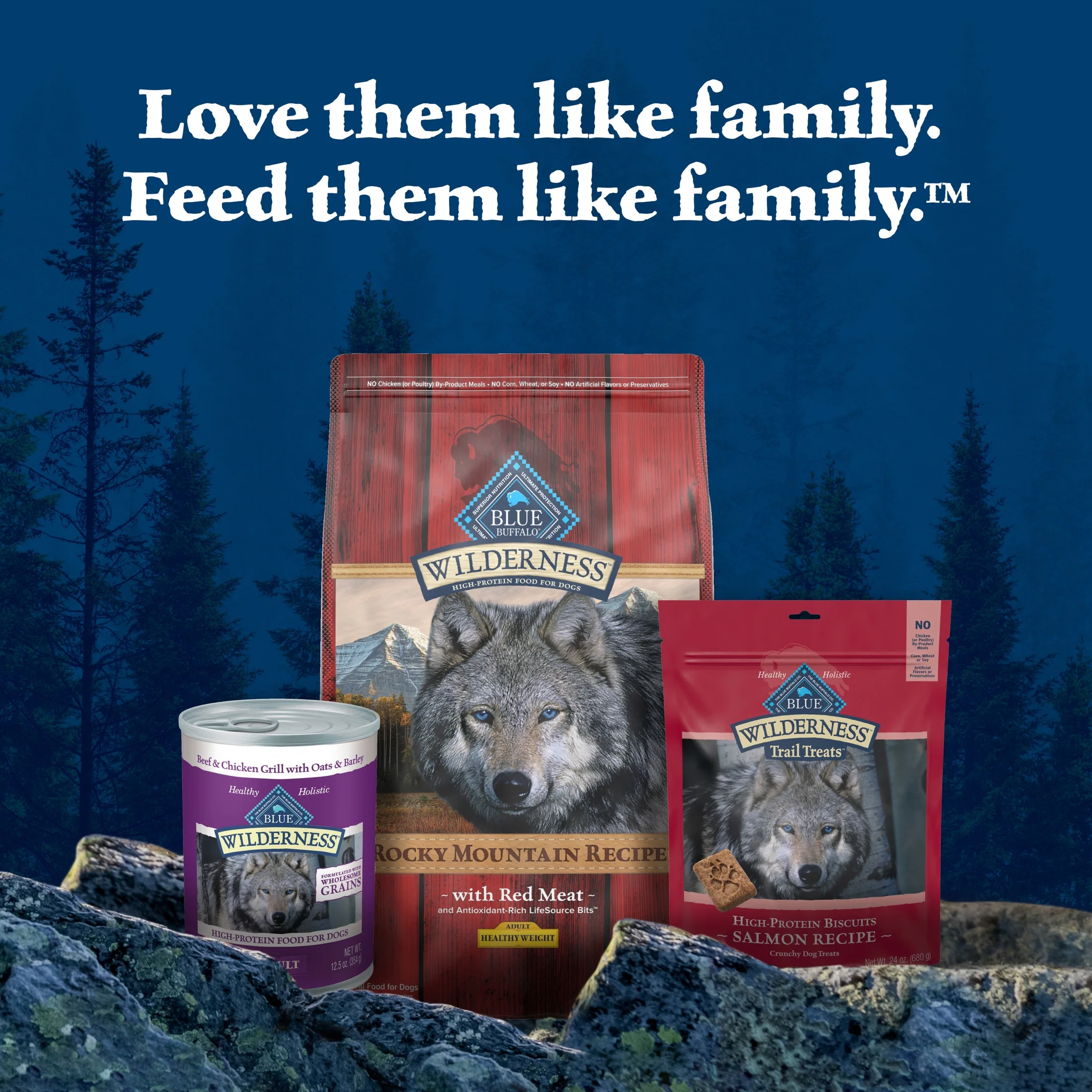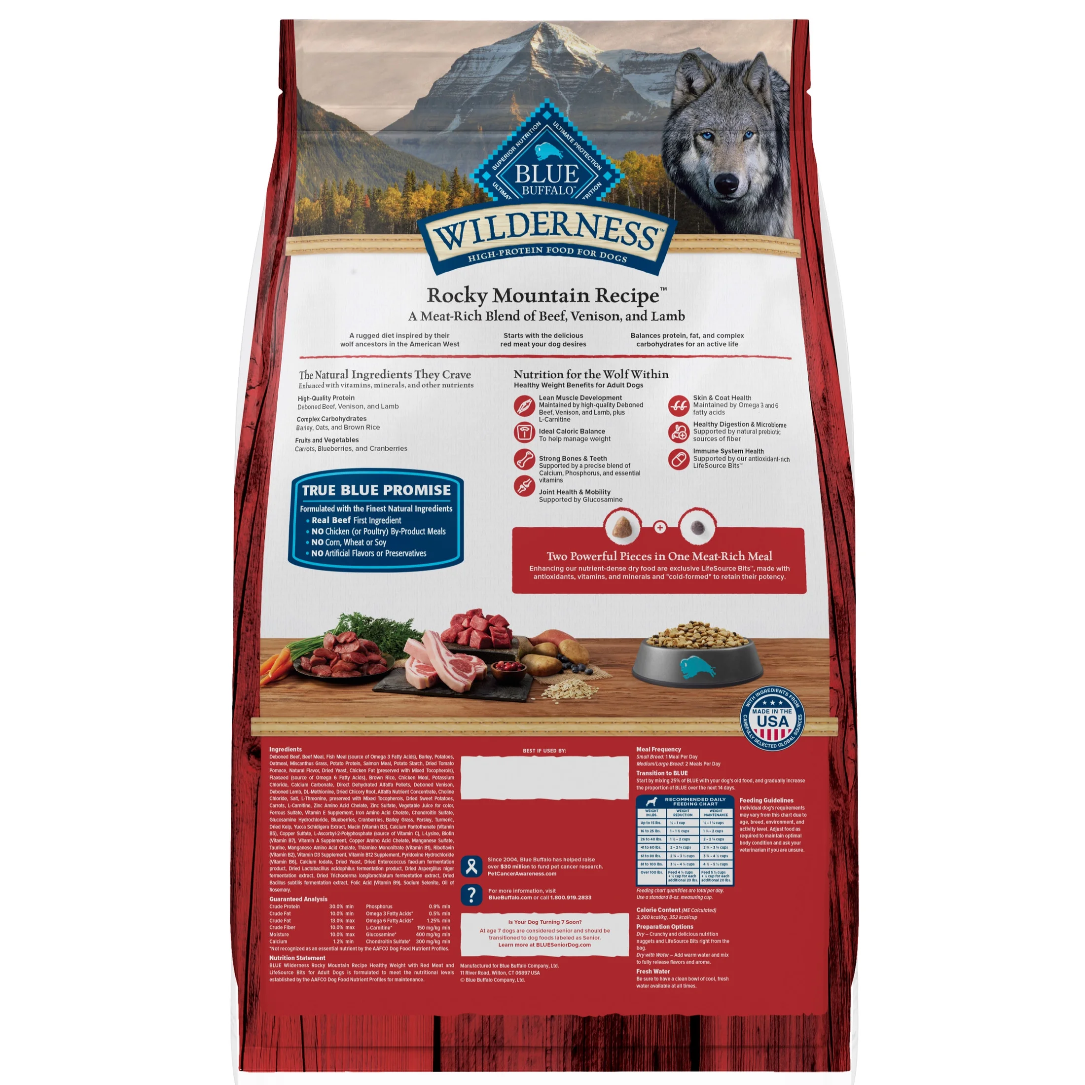 Feed your dog’s wild side with BLUE Wilderness Rocky Mountain Recipe Healthy Weight Adult Dry Dog Food. The first ingredient in this high-protein dog food is deboned beef. It’s also made with savory venison and lamb to help build and maintain strong muscles. This adult dog food with real meat is packed with healthy, complex carbohydrates, plus nutritious fruits and vegetables. It provides complete and balanced nutrition while supporting a healthy weight in your dog. BLUE Wilderness natural dog food is formulated without any chicken (or poultry) by-product meals. It is also free of corn, wheat, soy, artificial flavors, and preservatives. You can feel great knowing Blue Buffalo is helping your dog thrive with a protein-packed diet.