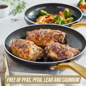 Prepare to conquer every meal efficiently with the Blue Diamond Gold 12-Piece Set. The PFAS free, Gold Diamond ceramic nonstick coating allows for healthier cooking and everyday use. Each pan is equipped with pouring rims, chip free edges and is fit for all stovetops, including induction. The riveted stainless steel handles are finished in a striking gold tone to give you a durable and stylish meal prepping experience. Blue Diamond Gold is tougher, stronger, and built for extreme demands, from your first course to your last