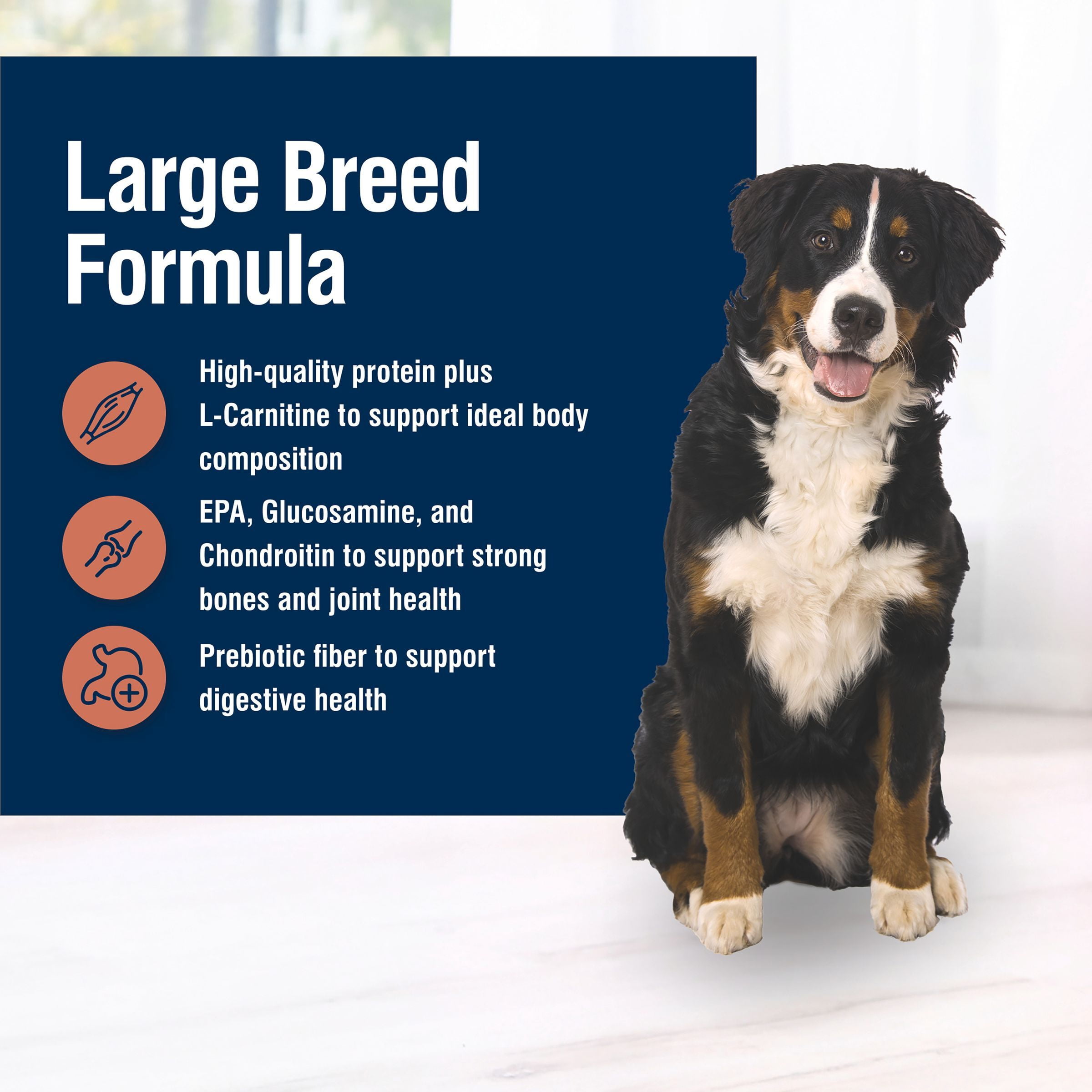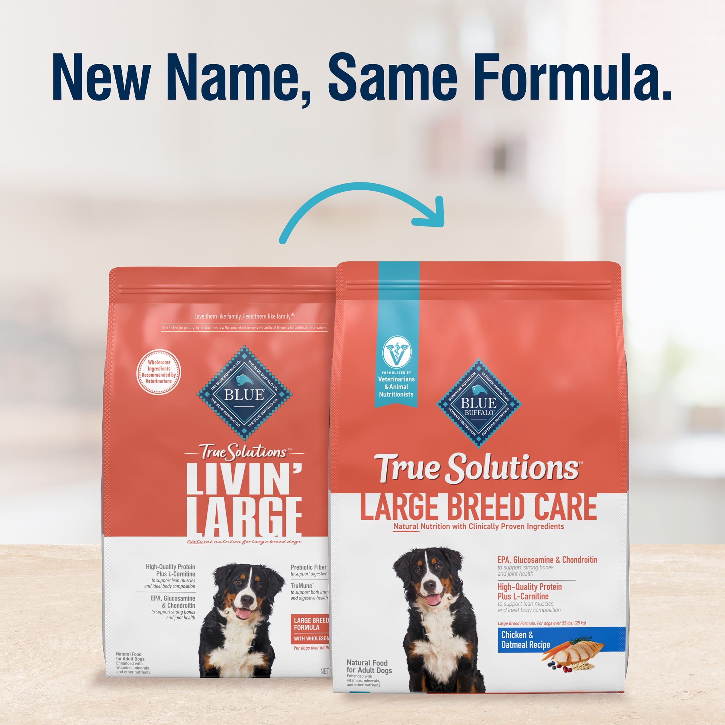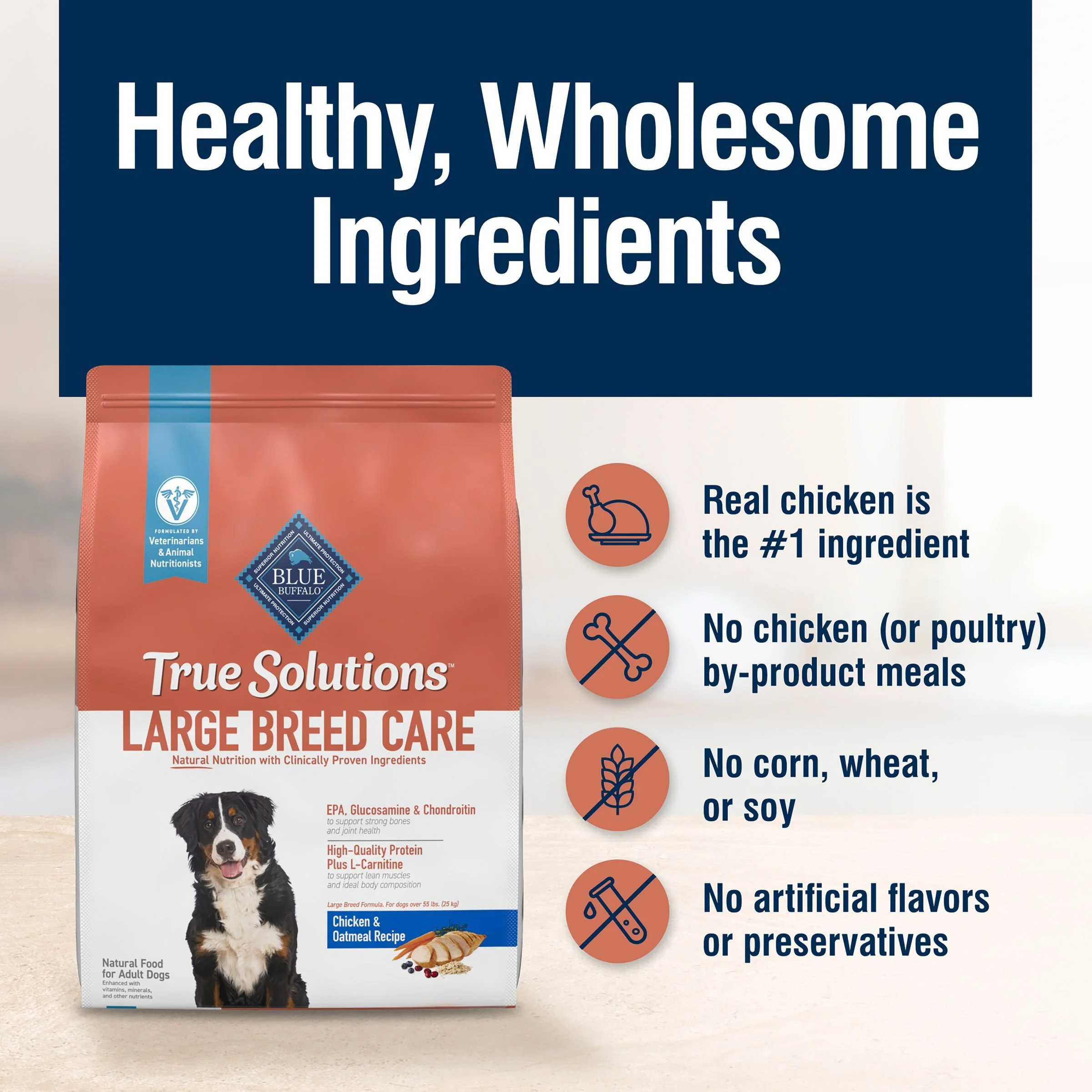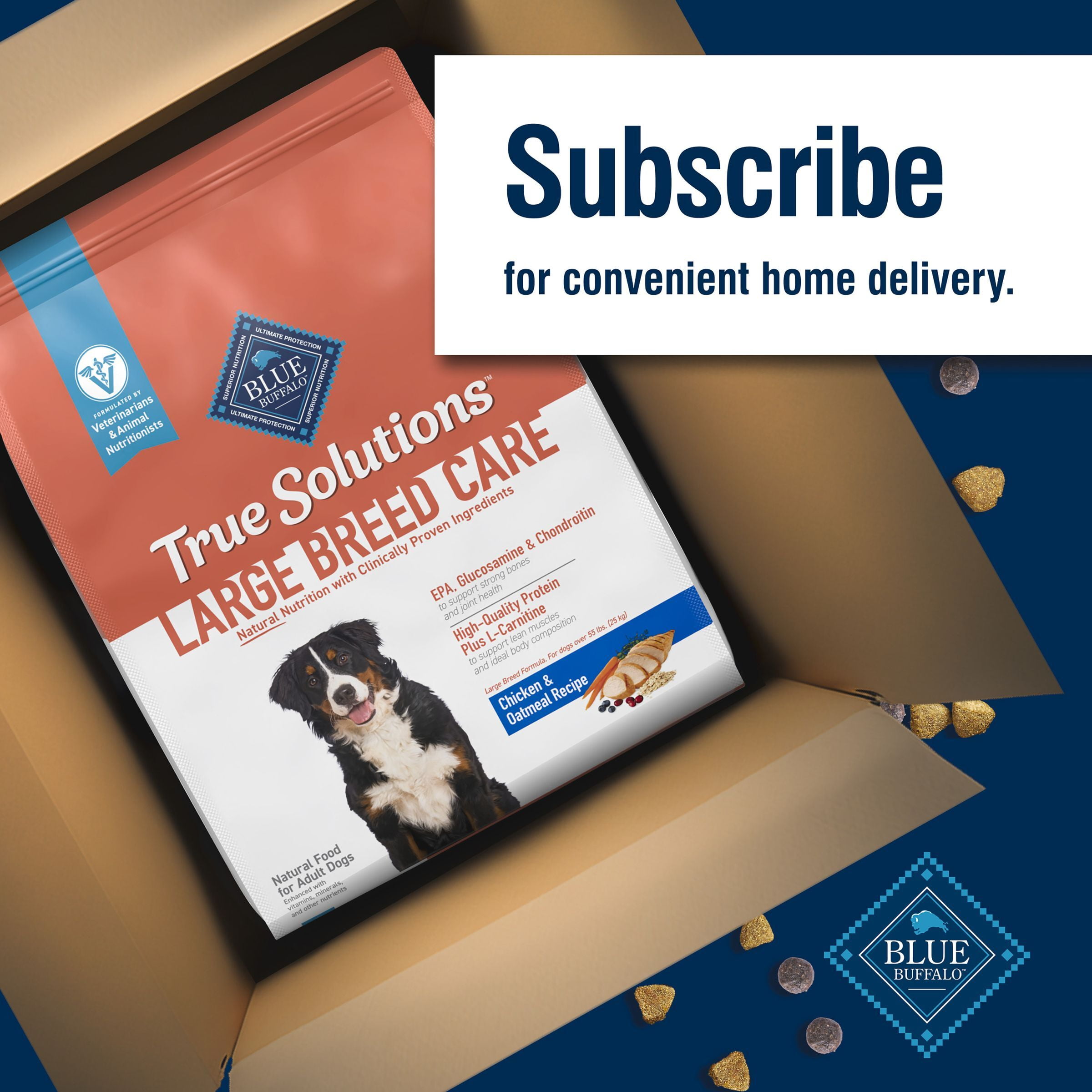 REAL CHICKEN FIRST: This Blue Buffalo dog food is made with real, high-quality chicken as the #1 ingredient SUPPORT FOR LARGE BREED DOGS: This Blue Buffalo dry dog food supports lean muscles and ideal body composition with high-quality protein plus L-Carnitine; strong bones and joint health with EPA, Glucosamine, and Chondroitin; and digestive health with prebiotic fiber IMMUNE SYSTEM SUPPORT: Blue Buffalo dog food contains exclusive, antioxidant-rich LifeSource Bits HEALTHY, WHOLESOME INGREDIENTS: This dry dog food is made with no chicken (or poultry) by-product meals and no corn, wheat, or soy Contains: One (1) 24-lb. bag of BLUE True Solutions Livin’ Large Adult Dog Dry Food; Chicken ENHANCED IMAGERY: We have enhanced our digital product packaging to highlight our products ingredients and essential benefits While the physical packaging will differ slightly; all information is accurate