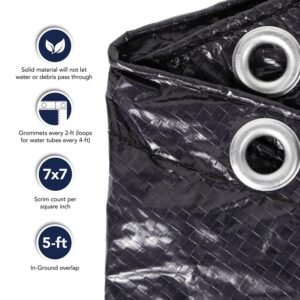 These super strong winter covers are built to last! The Blue Wave Bronze grade cover has the strength and durability of covers costing twice as much. Rugged polyethylene scrim and coating means that this cover can withstand winters worst. Blue Wave covers are U.V. protected so they will last for years in direct sunlight. The cover’s black underside retards algae growth and heat sealed seams means a crystal clear pool next spring. The Blue Wave 8-Year cover comes with loops every four feet to secure water bags and corner grommets allow for extra tie down in windy areas. The cover has a 5 foot overlap, and comes in a dark navy blue with a black underside. This Blue Wave cover is backed by an 8 year warranty.