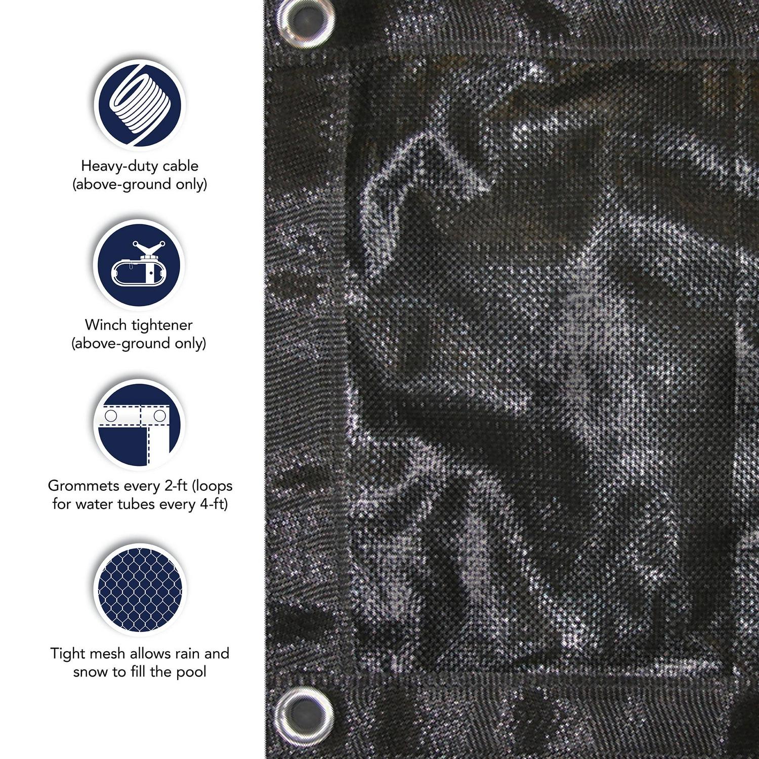 This rugged mesh cover makes spring clean-up a snap! The secret to this unique Blue Wave cover is the tightly woven scrim that holds together insuring that no gaps or holes develop. Rugged mesh allows only rain water and very fine silt to pass through. Since the cover is made of mesh that is very lightweight, simply lift it off in the spring. No heavy water to lift off or time consuming cover pumping. Simply remove the rugged mesh cover, vacuum up the fine silt and open your pool. Since our scrim is so tightly woven, the cover allows almost no sunlight through and ensures an algae-free pool in the spring. Our rugged mesh covers are made from tough U.V. protected woven polyethylene that is strong enough to handle ice, snow, sleet and high winds. All Blue Wave in-ground Rugged Mesh covers have a 5-ft overlap with loops every four feet to secure water bags. Corner grommets allow for extra tie down in windy areas. Backed by an 8 Year warranty.