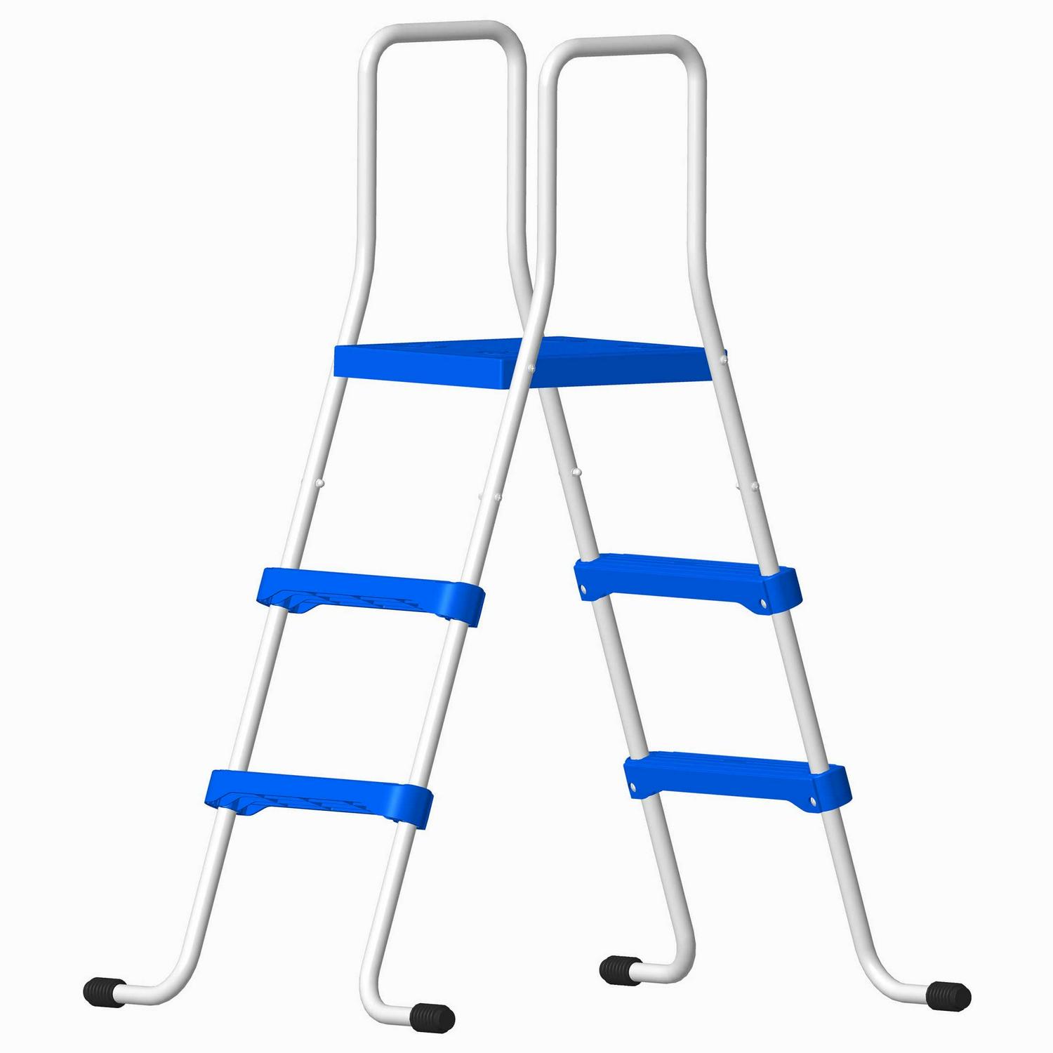 - Includes a skimmer and filter system, an A-frame ladder, blue overlap liner, and hoses
