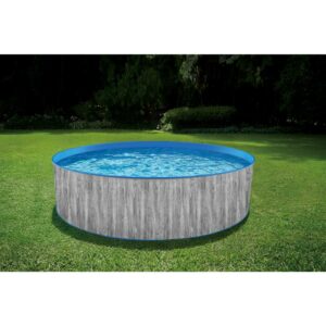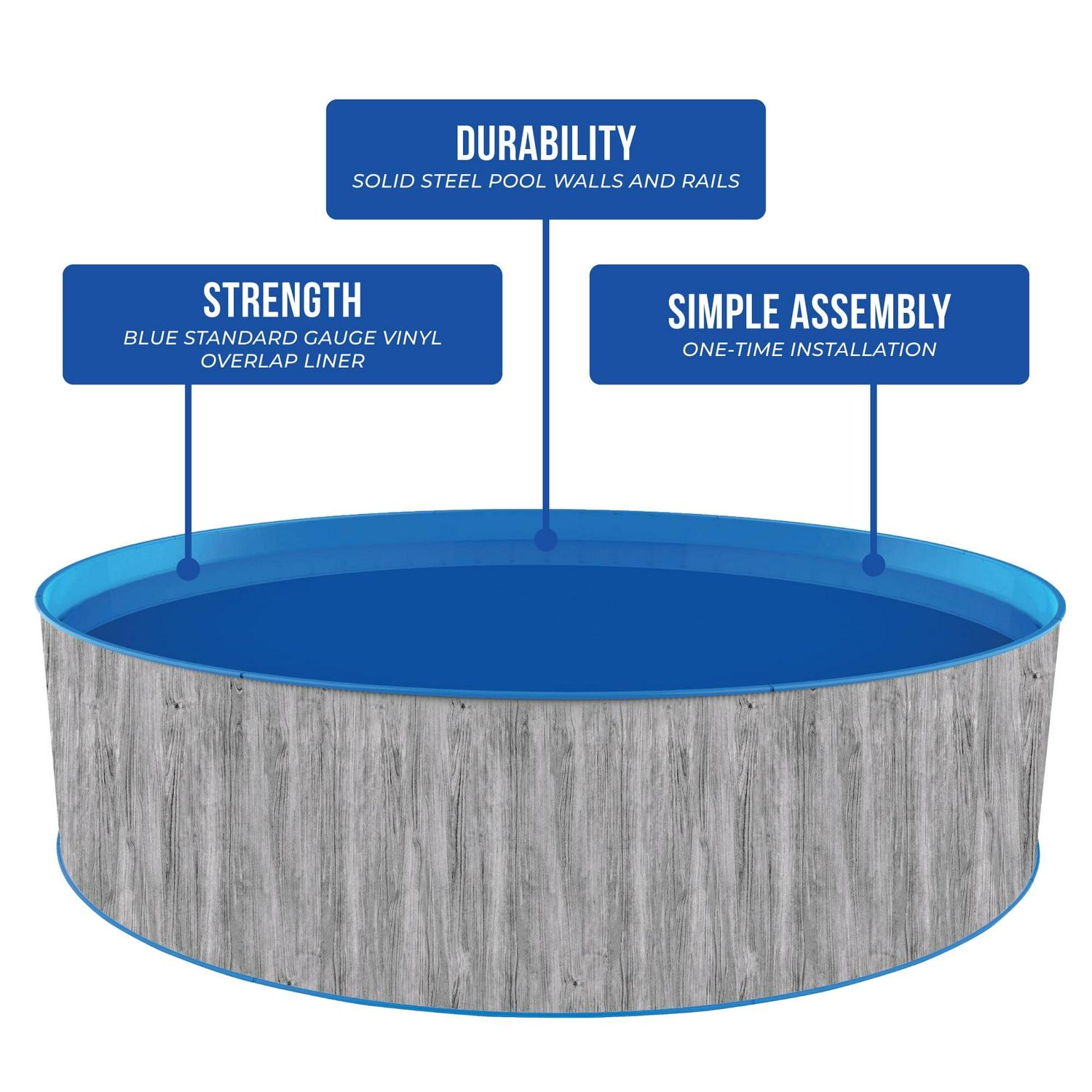 Bring farmhouse style to your outdoor space with the uniquely designed Blue Wave12-ft circle, Capri Above-Ground Swimming Pool. Its neutral Barn wood pattern will transform any backyard into a stylish oasis. Manufactured from solid steel, the Capri Above-Ground Pool is designed to last. A simple, one-time installation is all it takes for your family to start creating endless memories year after year. Includes a skimmer and filter system, an A-frame ladder, blue overlap liner, and hoses.