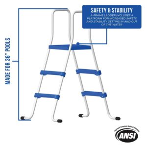– Includes a skimmer and filter system, an A-frame ladder, blue overlap liner, and hoses