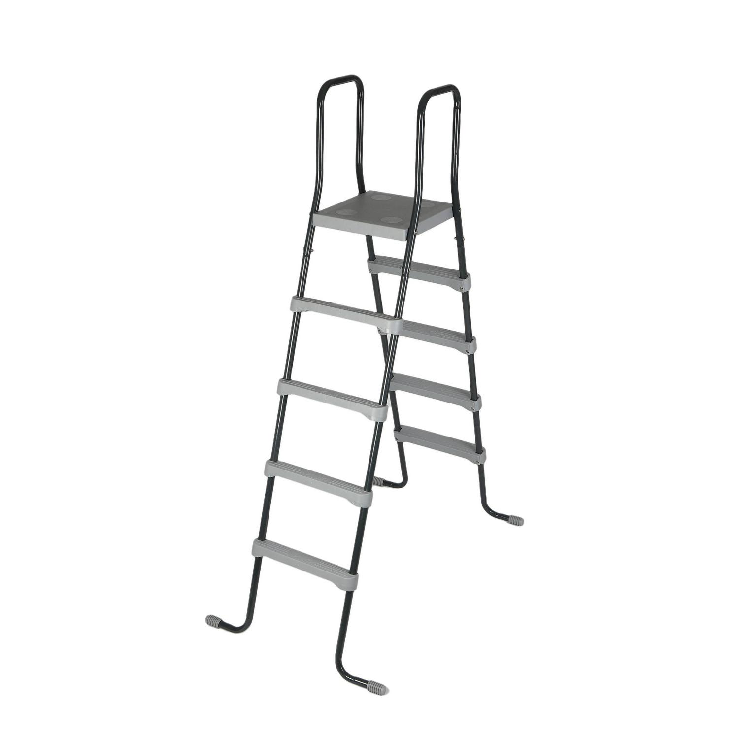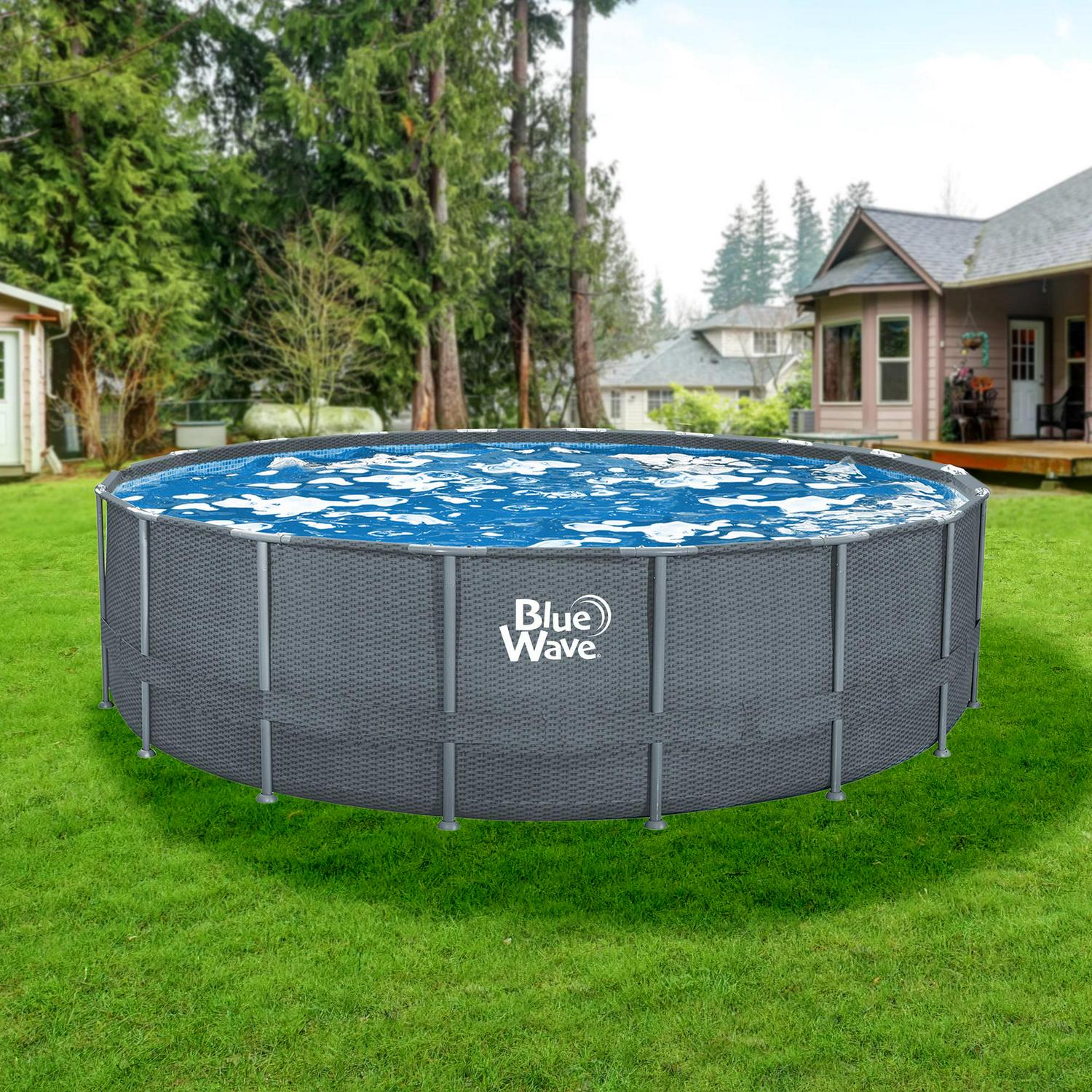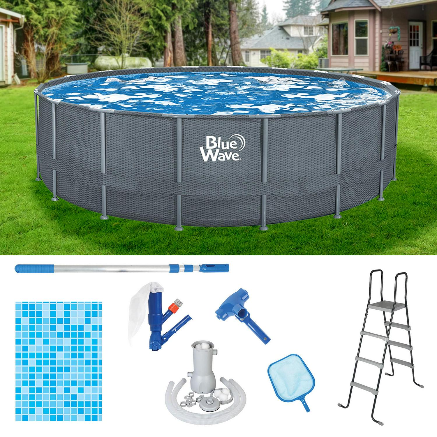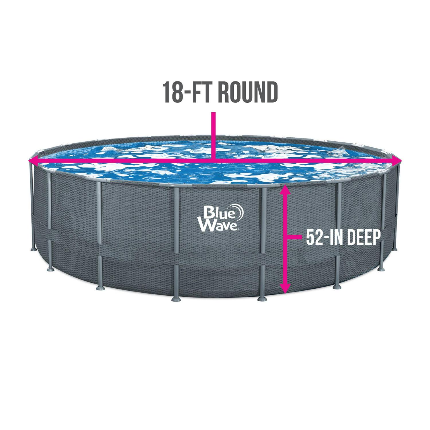 Maximize your time outside during the hot months of summer with the Gray Rattan 18-ft Round 52-in Deep Frame Swimming Pool Package. Supported by a sturdy, metal frame with a heavy-gauge PVC liner for superior durability. A ladder with a platform makes entry and exit from the pool safe and easy. Includes a maintenance kit, filtration system, and cover for immediate use right out of the box. Designed with a distinctive wicker-patterned wall, this above-ground pool complements any deck or patio. 90-day limited warranty on pool and all components.
