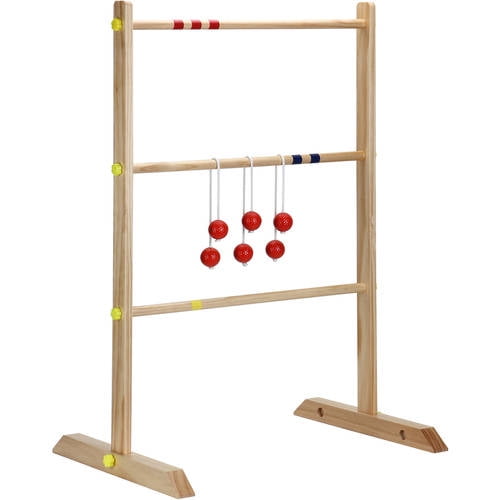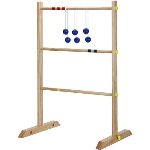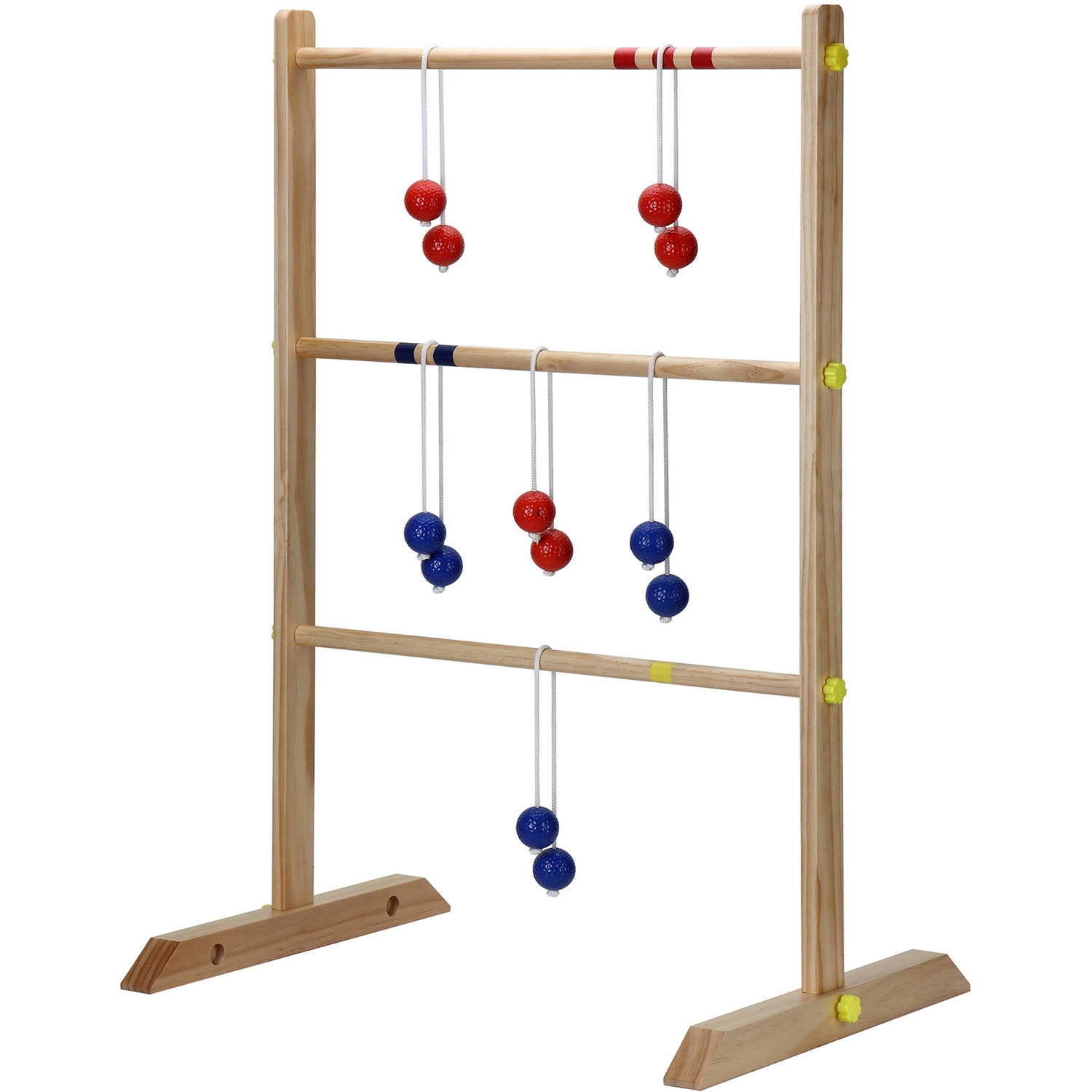 Dimensions: 39.75L x 27.5W x 23.65H in. Ladder targets are constructed of solid hardwood Targets have weighted bases for stability Includes 3 red and 3 blue bolas Rip-resistant nylon carry bag included for easy portability and storage