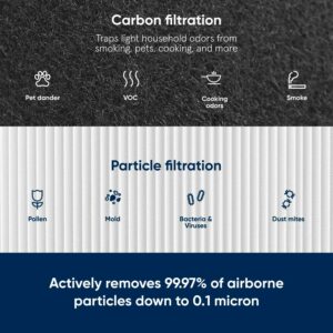 – REMOVES EVEN TINIEST AIRBORNE PARTICLES DOWN TO 0.1 MICRON: Particle filter removes airborne particles such as pollen, pet dander, bacteria, mold, viruses, and dust from your indoor environment