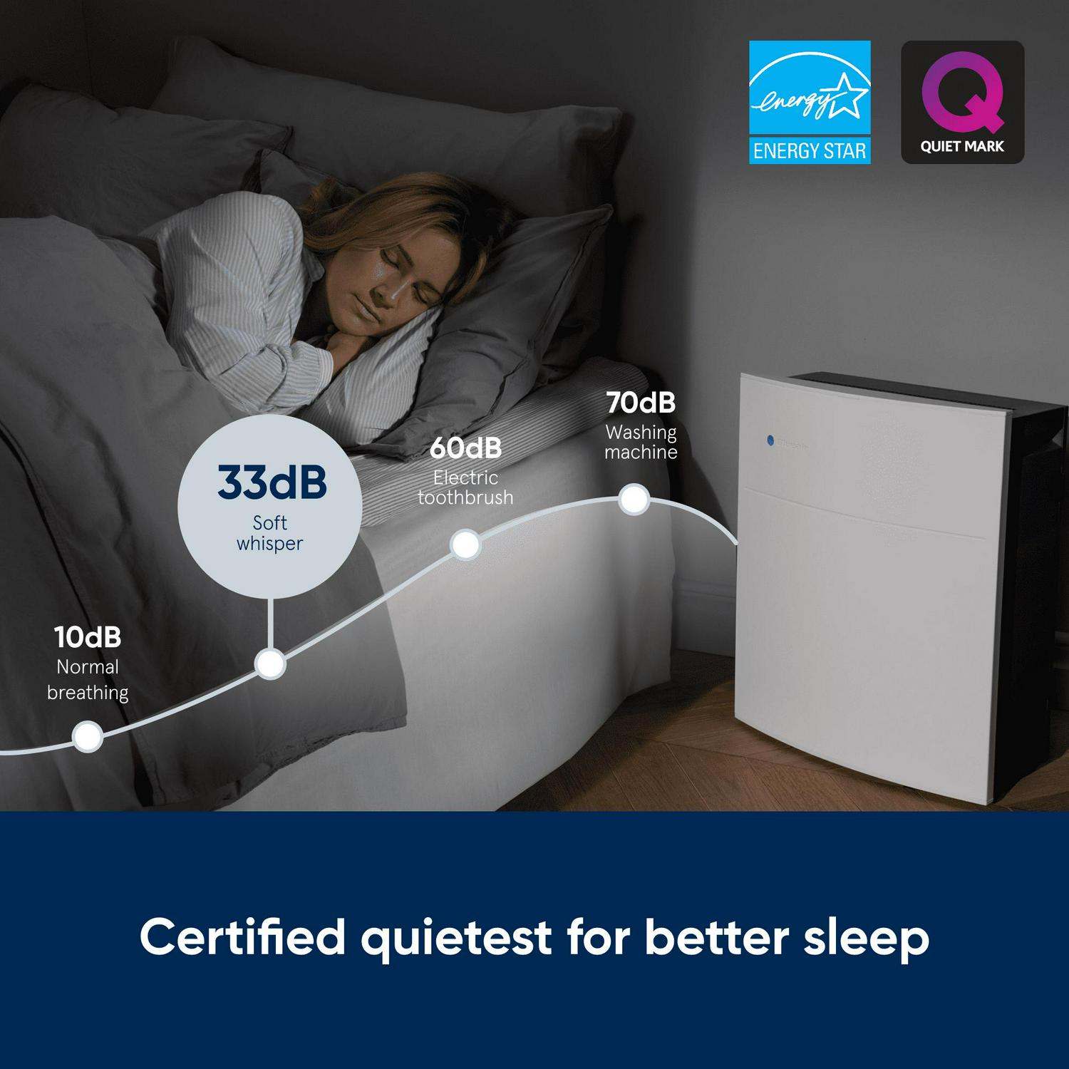 – Sleep without disruption with noise levels no louder than a whisper on low speed (32 dB) and equivalent to the noise level of rainfall on high (56 dB)