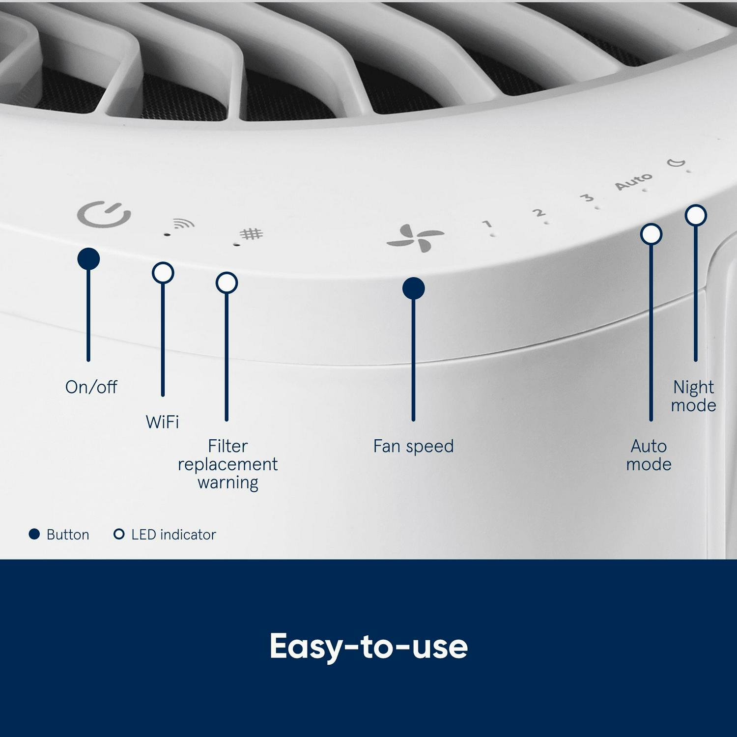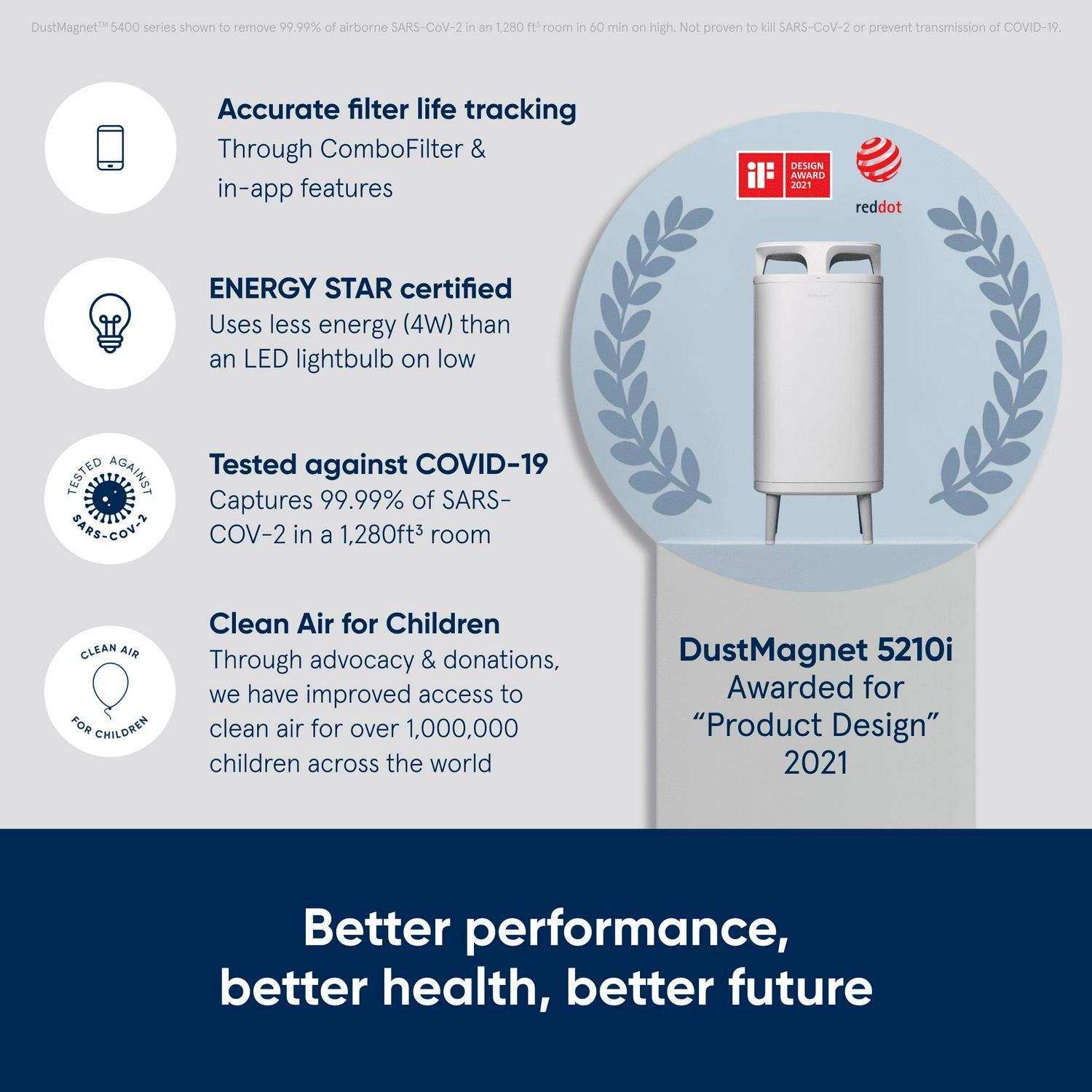 Designed for a life with less cleaning, the Dust Magnet 5210i air purifier catches 99%¹ of airborne dust before it settles on floors and surfaces. Independently tested for performance as part of the AHAM Verified Program for room air cleaners, for a Clean Air Delivery Rate (CADR) of 154 cfm for fine smoke particles, 173 cfm for pollen particles, and 153 cfm for dust particles. Recommended for small to medium rooms like a guest bedroom, home office, or dining room, the 5210i model completely filters room air about every 12 minutes² (approx. 5x an hour at 238 ft²) at the highest speed.³. Patent-pending Dust Magnet technology powerfully attracts airborne dust particles like a magnet. Two air intake points and a unique airflow pattern create a vortex effect in the room to capture dust before it settles. A stream of negatively charged particles clusters airborne dust particles, making them easier to capture. Once inside the air purifier, the particles stick to the positively charged pre-filters like a magnet. Equipped with filtration technology to kill germs and effectively trap 99.97% of airborne particles like allergens, dust, pollen, pet dander, mold, bacteria, and viruses yourselves down to 0.1 microns. Additionally, activated carbon is integrated throughout the filters to absorb gases and light household odors from cooking, smoke, and pets. Air purifier not tested against SARS-CoV-2 (COVID-19). Dust Magnet delivers more clean air using less energy and less noise. The 5210i quietly cleans the air with noise levels of less than a whisper (29 dB) on low and less noise than a normal conversation (45 dB) on high – while using less energy than a light bulb (5-22 watts) on all speeds. . Designed to blend into your home like a great-looking piece of Scandinavian-style furniture, the dual-use design features a convenient top surface to double as a side table and air purifier. With a design worth showing off, there’s no need to hide your air purifier, place it prominently in the room where it will be most effective. Dust Magnet takes a simple approach to smart air quality management with proactive features such as Auto mode, Welcome home, and a five-color LED air quality indicator light. When Auto mode is enabled the air purifier will auto-increase fan speed when the particle sensor measures diminishing air quality conditions (when cooking, vacuuming, etc.) and returns to a lower speed once pollution dissipates. Activate the Welcome home feature (expected March 2021) via the Blueair app and your air purifier will go into standby mode when you leave the house and turn back on as you approach home, reducing airborne dust for when you arrive. The Wi-Fi-enabled air purifier also allows you to control settings from almost anywhere with the Blueair app and voice-control via Amazon Alexa and Google Assistant-enabled devices. Includes one set of combination particle and carbon filters with a maximum of 1-year filter life and two permanent stainless-steel pre-filters. Dust Magnet proactively monitors filter use and pollution levels in real-time to accurately determine when you need a filter change. When it’s time for a replacement, the Blueair app sends an alert with an option to order filters at the touch of a button. For optimal performance, we recommend cleaning the pre-filters with a vacuum or cloth weekly, or as often as needed. Replace the Combo Filters when the filter light indicates a filter change is necessary (roughly 6-12 months of 24/7 use based on pollution levels). At Blueair, our Swedish heritage inspires sustainability and quality at the heart of everything we do. All Blueair purifiers are AHAM Verified for Clean Air Delivery Rate (CADR) and recommended room size, ENERGY STAR certified and tested by the California EPA Air Resources Board (CARB) for safe ozone emissions.