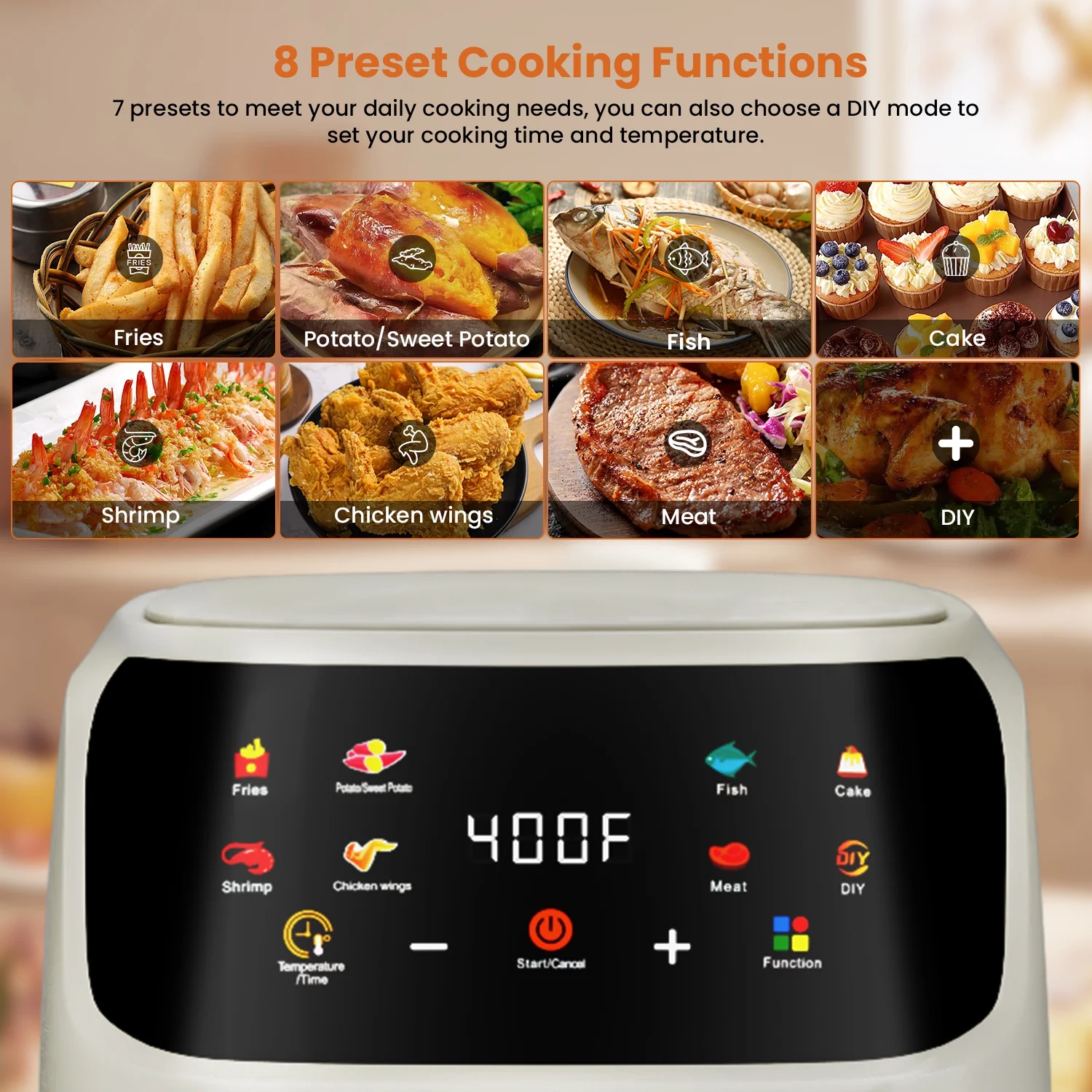 Multi-purpose Air Fryers: The perfect alternative to fryers, ovens, microwaves, toasters, toasters and fruit dryers. 360° high-speed hot air circulation technology, cooking food without adding a drop of oil will reduce 85% fat compared with the traditional frying method. Healthy and smokeless, high temperature air will squeeze out the fat out of the food, while locking moisture and nutrition, to achieve the perfect crisp and delicious effect! 8-in 1 Meet All Your Needs: With 8 cooking presets, you can quickly make delicious meals according to your needs. And you can adjust the time (1 to 120 minutes) and temperature (175 to 400℉) to customize everything to suit your air frying recipe. Visible Window Design: With a visual food cooking basket, glass viewing window and built-in indoor light, it is easy to observe the cooking progress without opening the cooking basket and convenient real-time monitoring of the cooking process. Safe and Assured: The back of the air fryer is equipped with a heat dissipation device, and the bottom is designed with non-slip feet to ensure a safe and stable cooking process. Roasting basket automatic power off protection, if you forget to season the food, just take out the frying basket, the air fryer will automatically shut down operation to ensure your safety. Once you put the basket back, the frying pan will revert to the Settings you selected earlier. Easy to Clean: Hands free, easy to clean, detachable non-stick pan square baskets of food-grade materials for more cooking space. Frying baskets and detachable frying pans can be quickly and easily washed off or placed in the dishwasher, saving time and labor for every cook.