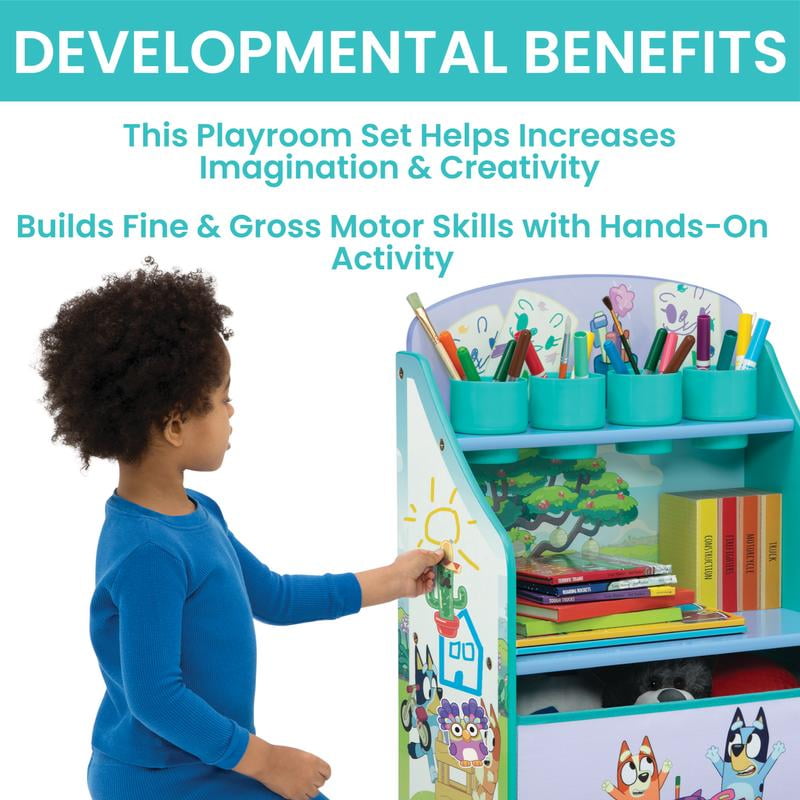 Bluey 3-Piece Art & Play Toddler Room-in-a-Box by Delta Children – Includes Draw & Play Desk, Art & Storage Station & Fabric Toy Box, Blue