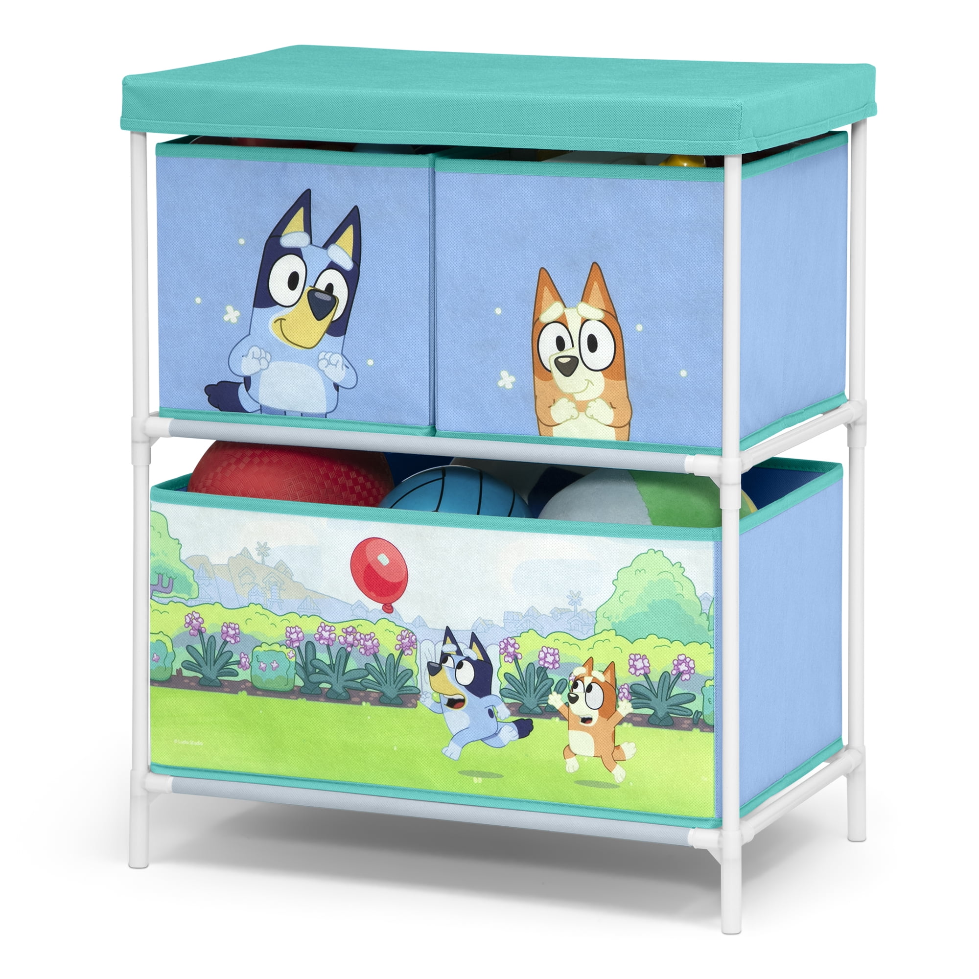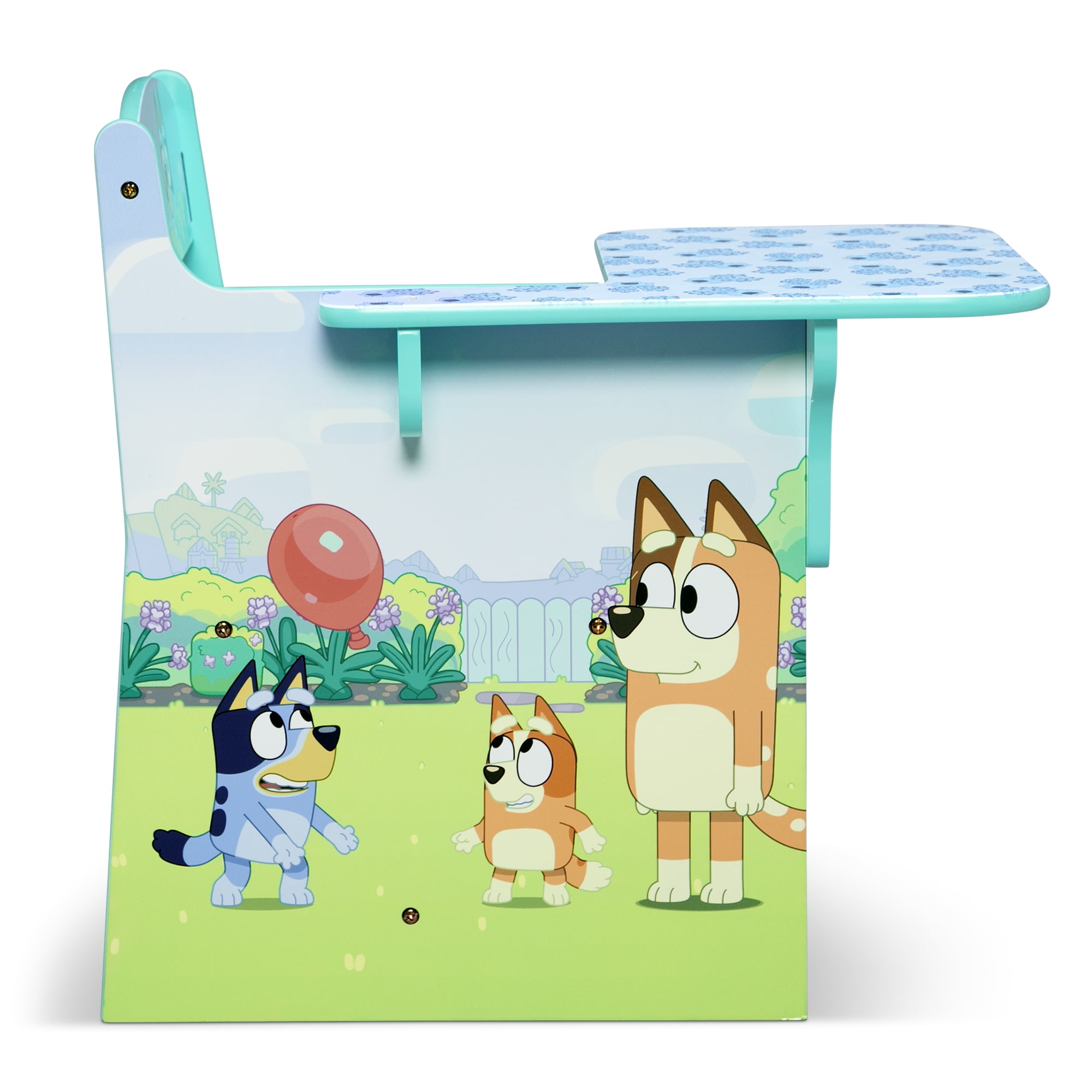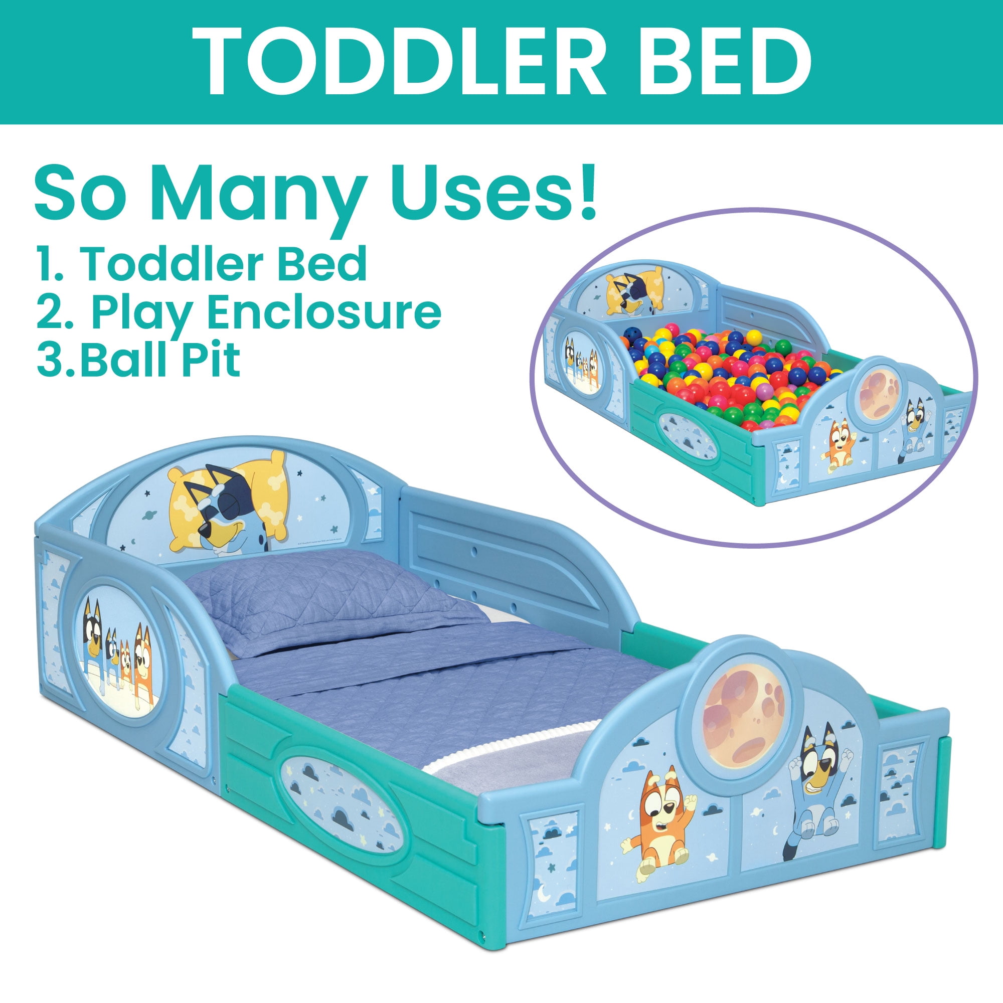 WHAT’S INCLUDED: This 3-Piece Toddler Bedroom Set includes 1 Sleep and Play Toddler Bed, 1 Chair Desk, 1 Toy Organizer with 3 Fabric Bins FOR BLUEY FANS: Colorful Bluey graphics makes this a must-have set for any fan SLEEP AND PLAY TODDLER BED: Built in toddler guardrails to keep your child secure | Mattress is designed to sit low in the bed frame for your child’s safety and ease (mattress sold separately) | JPMA certified to meet or exceed all safety standards set by the CPSC & ASTM | Versatile frame of the Sleep and Play Toddler Bed can be used as a bed, play enclosure, ball pit and much more (play balls not included) TOY ORGANIZER: Toy Organizer has 3 fabric bins in varying sizes to fit a wide variety of toys, from small to large CHAIR DESK: Holds up to 50 lbs. | Desk sits low to the ground for easy access SIZE: Sleep and Play Toddler Bed: 29.5”W x 54.5”D x 17”H; Chair Desk: 16.5”W x 20.5”D x 20.3”H; Organizer: 20.9”W x 11.8”D x 24.4”H | Easy assembly | Recommended for ages 15 months+