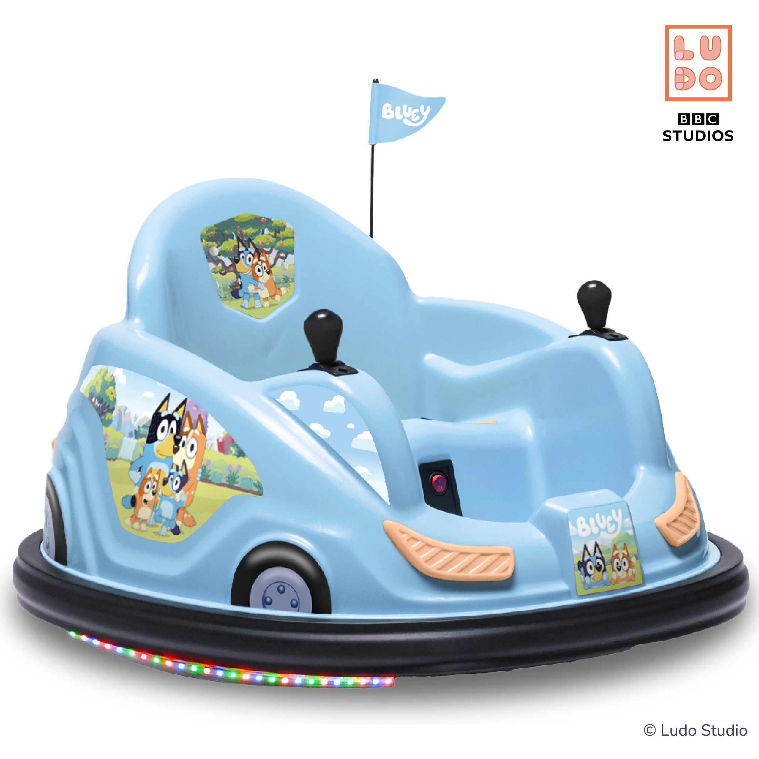 Bluey by Flybar, 6V Bumper Car Ride on Toy for Children, 1 Count Age: 18 months – 4 years Weight: Up to 66 lbs Lights & Action: Fun, exciting flashing LED lights glow bright. Watch your child’s face light up as they drive and bump their way all around the hous Bump & Play: Car spins 360 degrees and provides screen-free, exciting entertainment. Your child will giggle and smile as they spin and bump Lights & Action: Fun, exciting flashing LED lights glow bright. Watch your child’s face light up as they drive and bump their way all around the hous uality & Durability: Built with a tough plastic shell and a soft rubber bumper to protect walls and furniture Made For Safety: Features an adjustable seat belt, 1 MPH max speed, and anti flat tires Dual Joystick Controls: Easy-to-use dual joysticks for spinning 360 degrees and steering the ride on baby bumper car Design: Decorative stickers, headlights, taillights, and your own racer flag Power: Includes 6V rechargeable battery and 120V wall charger. Power up the fun whenever you want. Charge fully before use. Assembly: Vehicle is fully assembled. Attach the bumper, charge/connect the battery and go
