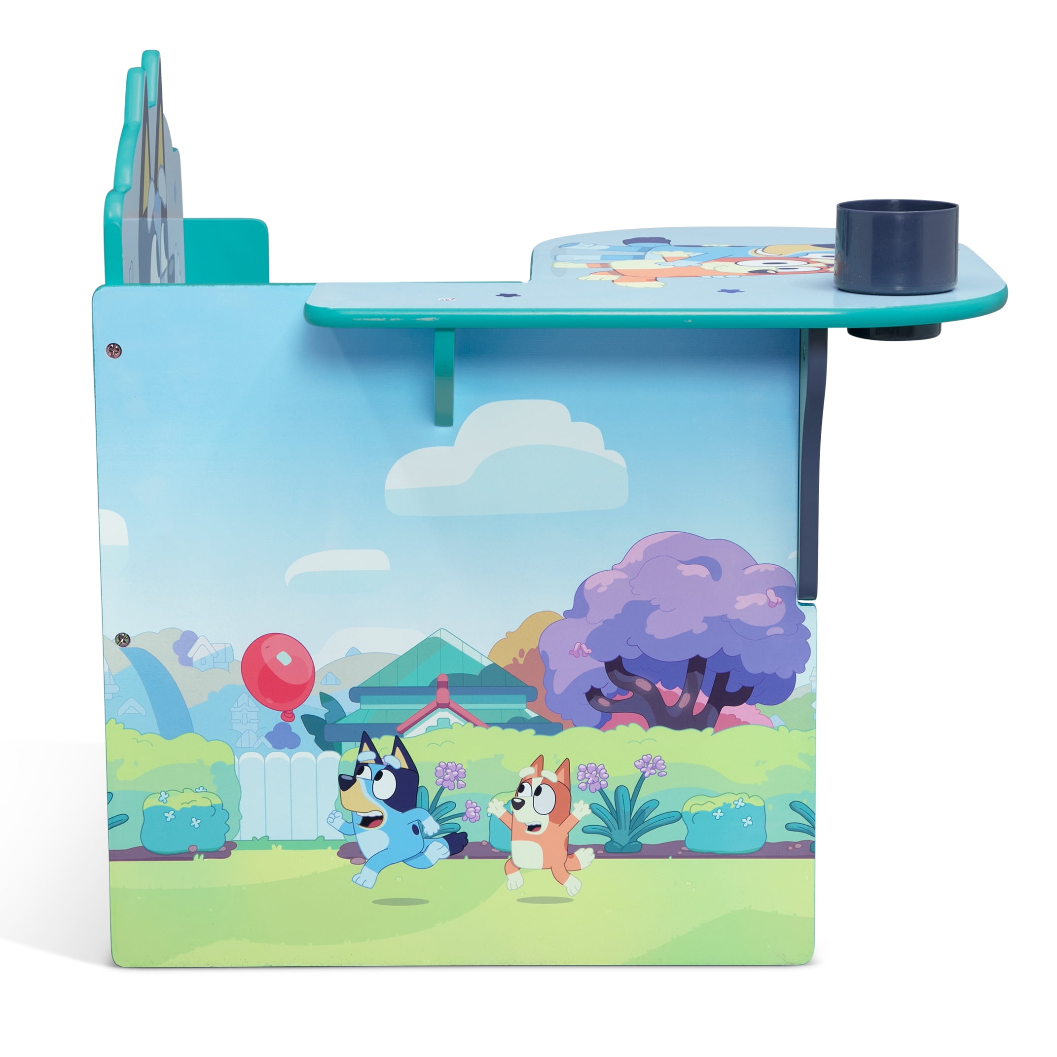 This Bluey Chair Desk with Storage Bin by Delta Children offers kids the perfect spot for snack time, crafts, playtime or homework. This smart and sturdy chair with colorful graphics of Bluey characters also features a built-in cup holder to hold markers, plus a fabric storage bin underneath for additional art supplies or toys. Perfectly sized, this durable chair and desk combo has a large work surface and low height that makes it easy for preschool kids and toddlers to get in and out on their own. About Bluey: Bluey follows the adventures of a lovable and inexhaustible six-year-old Blue Heeler puppy who lives with her dad, mum and four-year-old little sister, Bingo. In every episode, Bluey uses her limitless Blue Heeler energy to play elaborate games that unfold in unpredictable and hilarious ways.