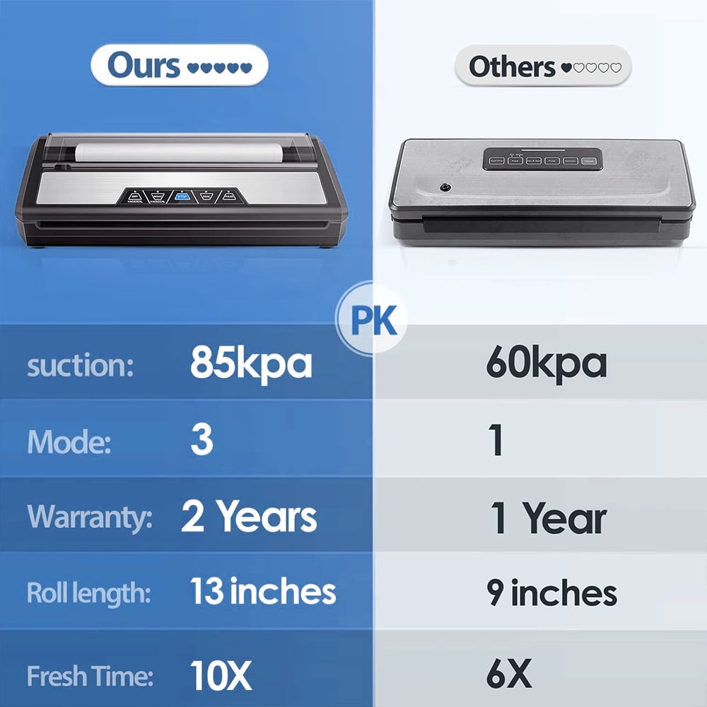 🌟【Easy to Operate】- Smart single-button touch control, LED progress display, beginners can also easily get started. 🌟【Fast & Efficient】 – Strong suction power, only 8-12 seconds to complete vacuuming, saving time. 🌟【Superior Sealing Performance】 – 3mm wider heating wire design ensures sealing width and prolongs food freshness. 🌟【Innovative Design】 – Built-in bag storage and cutter to avoid contamination, as well as fast heat dissipation and automatic overheating protection to ensure machine durability. 🌟【Low Noise & Environmental Protection】 – Noise is 30% lower than other vacuum sealers, providing a more comfortable using experience. Specifications: Food sealer Vacuum sealers Machine Dry & Moist Mode Built-in Cutter & BPA Free Vacuum Roll Bag With vacuum roll storage chamber Rated voltage: 120V/60Hz Vacuum Power: 80 KPA Vacuum Display: green/dry, red/wet Product Dimensions: 15.83″ x 6.34″ x 3.27″ Vacuum Display: green/dry, red/wet Sealing time: 8-12 Seconds VAC / Sealing Time: 10-12 Seconds Weight: 3.31 lb.Package Include: 1pc Vacuum Sealer 10pcs 20cm*30cm Vacuum Sealer bags, 1pc 20cm*200cm vacuum roll bag, 1pc Hose for sealing Jars