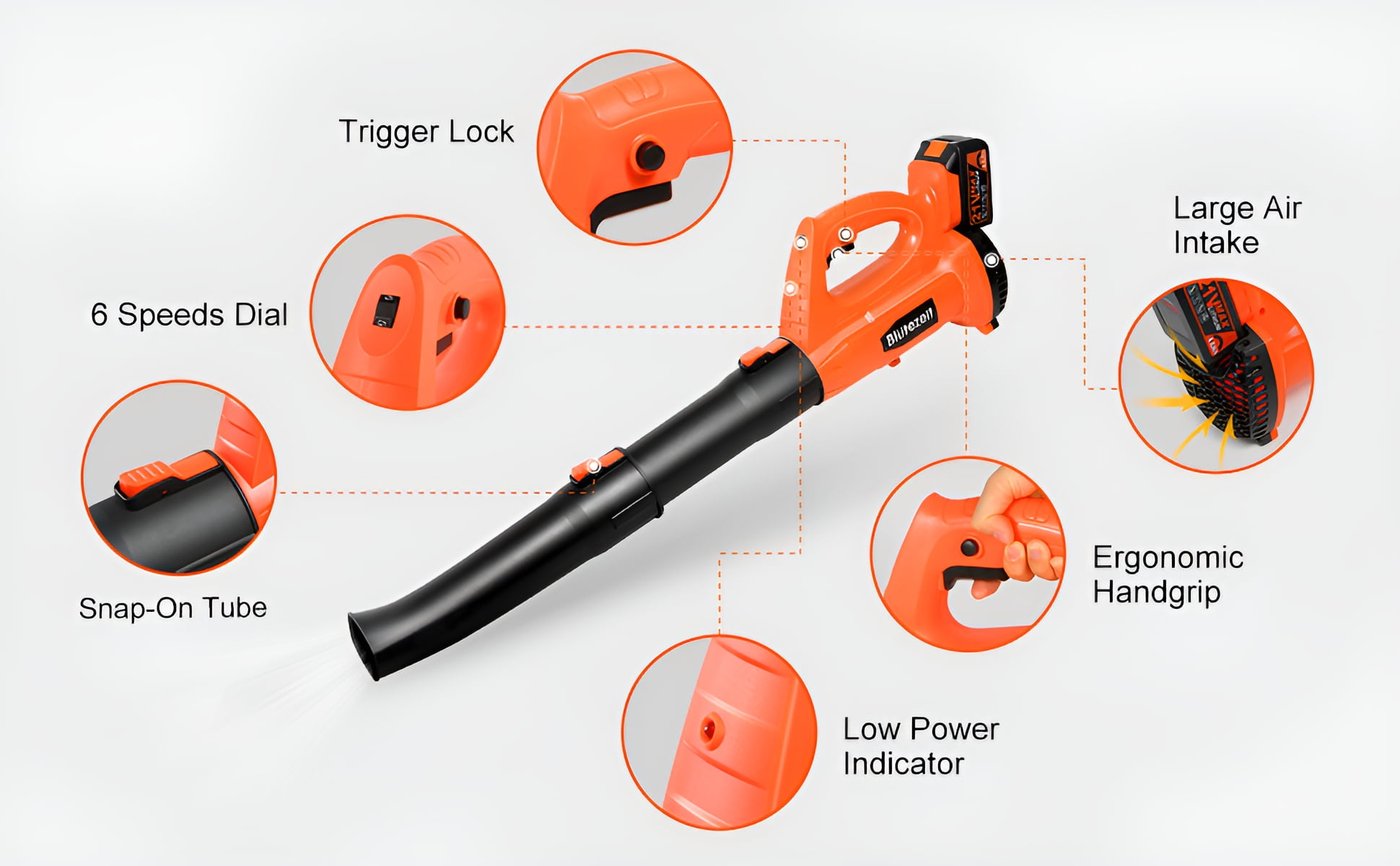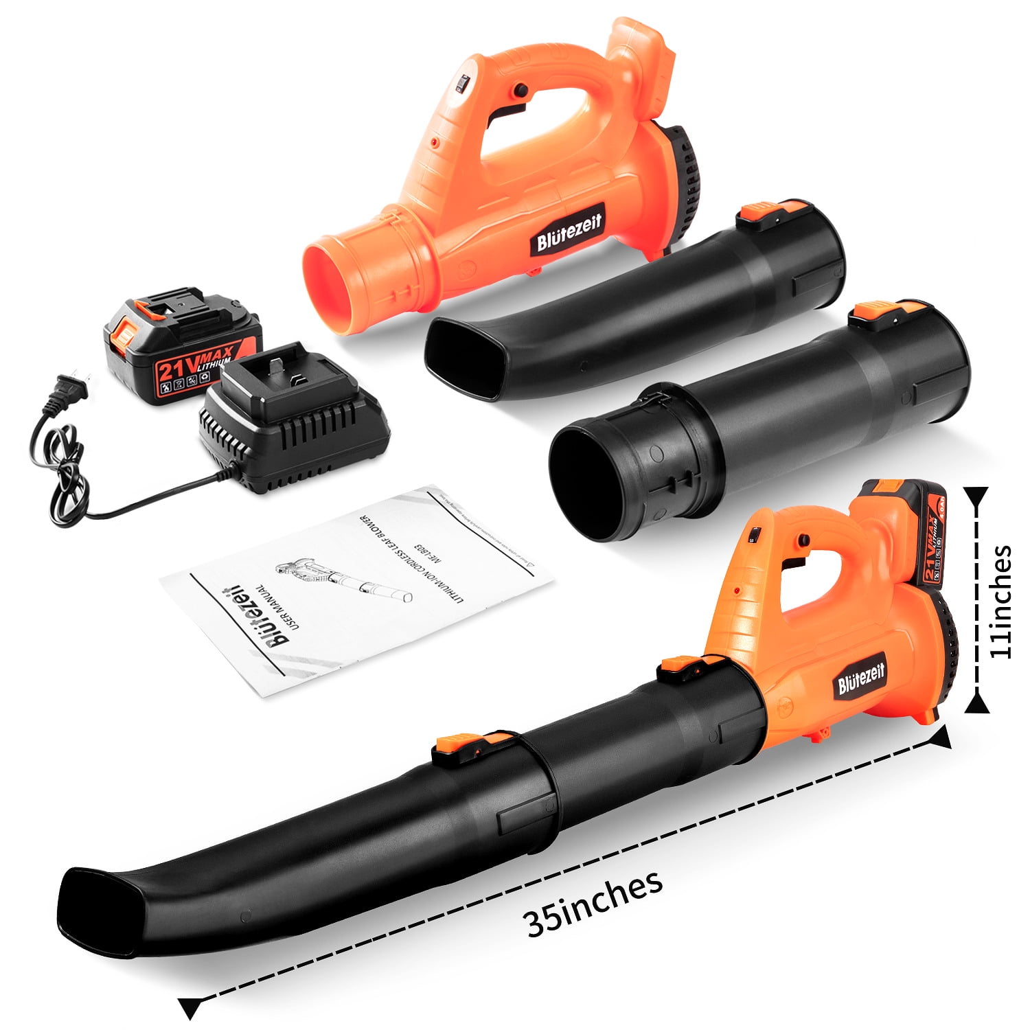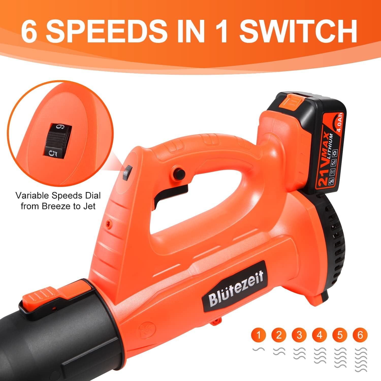 Specifications: Product Type———– Cordless Leaf Blower Battery Type———–Rechargeable Lithium-Ion Battery Battery Voltage———–DC 21V Battery Capacity———–4000mAh Material———–PP & ABS Color———–Orange & Black Max. Air Speed———–Up to 150MPH Max. Air Volume———–Up to 320CFM Working Time———–20-70mins Battery Charging Time ———–2.5-3 hours Sound Pressure Level———–78.8 dB(A) K=2.5 dB(A) Length———–27 inches (1 tube) / 37 inches (2 tubes) Switch Type———–Trigger Switch & Safety Lock Key Features:Please FULLY CHARGE the battery before use especially for the FIRST time to guarantee the blowing performance. Powerful Blowing with Turbine Tech – Blütezeit cordless leaf blower is equipped with high-quality Pure Copper Motor and upgraded turbine technology with airspeed up to 20000RPM, maintains a steady stream of power throughout large and heavier jobs. 4.0Ah Battery & Fast Charger – Included 21V big capacity battery and fast charger to offer a long lasting runtime up to 30mins at high speed, ensures a smoother blowing for longer period. There’s a low battery indicator light which can remind users to charge in time. 6 Variable Speeds – This yard blower is designed with 6 speeds in 1 dial, perfectly achieves different purposes from indoor to outdoor. It features a turbo mode up to 320CFM 150MPH, makes it able for clearing debris from hard surfaces and out of tight spaces. Lightweight & Easy to Operate – Only 5.73lb with ergonomic handle, it can ease fatigue on your hand and arm. Trigger lock design improves the operation experience, effortlessly to maneuver by one hand without keep pressing down on the switch. Portable to carry for all-purpose use. Multi-Purpose Uses – Quickly sweep away fallen leaves and grass clippings from driveway, sidewalk and garden; blow the dust and dirts from car seat and garage. Compact blower for lawn care and tackling large yards, widely uses at home and patio. It can also be used to blow powdery snow. 2-Section Tubes & Quick Assembly – With removable extension tube, this leaf blower can be set to 27 or 37 inches, give it more length to clear debris from hard-to-reach nooks and crannies. It just takes 5 seconds to quick assemble or disassemble for use and storage. Why To Choose Blütezeit Battery Leaf Blower?No Cable, More Mobility – Cordless design without usage limitation, take this cordless leaf blower anywhere as you like, no more dealing with power cords dragging around the floor. No Smell, Less Noise – Prevents from releasing smelly, toxic emissions like gas leaf blowers do, battery leaf blower has much lower noise. 4.0Ah Battery, Longer Runtime – Instead of traditional 2.0Ah battery, this battery powered leaf blower has double service time which allows you to handle more jobs. Variable Speeds, More Controls – 6 speed modes from breeze to jet, switch at will with a dial, satisfy your different needs of cleaning. Extension Tube, More Length – 2 section tubes, make it possible to reach hard-to-clean spaces like gutters & grooves, crannies & nooks. Lighter Design, More Portable – Lightweight but powerful, easy to carry and maneuver a carpet of leaves. Widely Use, All Purposes – Suitable else for yard & lawn care, snow blowing, home cleaning, car drying etc. Thoughtful Details For Convenient UseSnap-On Tube – Just 5 seconds to assemble and disassemble this battery leaf blower, which is detachable for easy storage and maintenance. 6 Speeds Dial6 Speeds Dial – Adjust and customize the airflow by rotating the speed dial from breeze to jet, suitable for various jobs from indoor to outdoor. Trigger Lock – Simply press the trigger lock button to keep this yard blower working, enormously reduces fatigue and saves your effort. Ergonomic Handgrip – The ergonomic non-slip handle perfectly adapts to hand and disperses pressure across the palm to minimize strain, allowing operators to work comfortably. Large Air Intake – The big air inlet design of this lawn blower and high quality copper motor ensure a more powerful, steady blowing and maximum air volume producing. Low Power Indicator – The LED low power indicator can remain users in time when the battery should be recharged. Note: it’s not always on, only flashes in low battery status. What Will You Get? 1 x Leaf Blower Main Engine 2 x Tubes (should be assembled) 1 x 4.0Ah Li-Ion Battery 1 x User Manual About Blütezeit Blütezeit focus on providing better solutions of variable tools for home, lawn & garden. We aim to bring more conveniences to your daily lives, expect that you can not only save time by using our products, but also enjoy the time during use. We are always ready for providing satisfied service for our customers. What makes our products unique? Blütezeit has its own industrial design and R&D team. We develop a product from aesthetics, ergonomics and practicability. We always Improve the pain points and listen to consumers’ advice. Why do we love what we do? Customers’ satisfaction and their love to our products make all of the time and effort that we put into each job well worth it. We’re so honored with the trust that they give us. What problem are we solving? We provide tidy solutions for your garden, help you save time, space and effort, bring you true conveniences. Our series products must pass strict quality inspection processes before arriving in your hands.