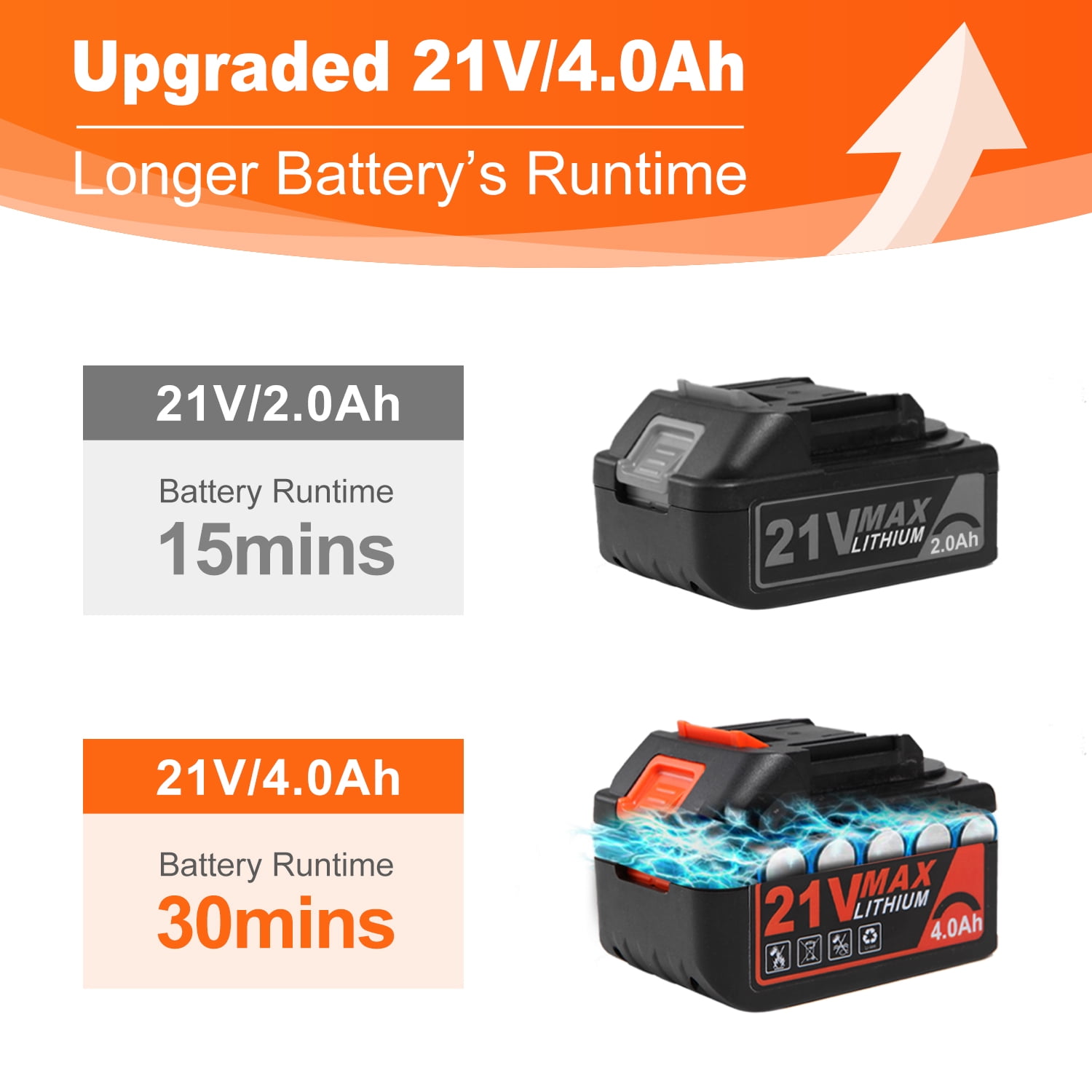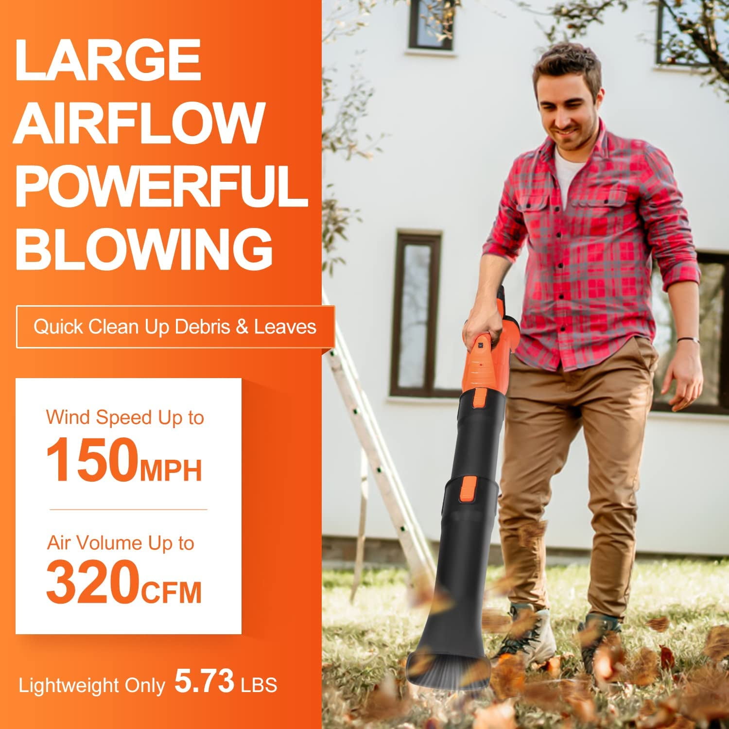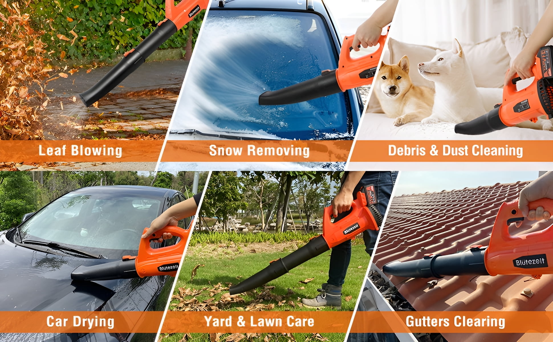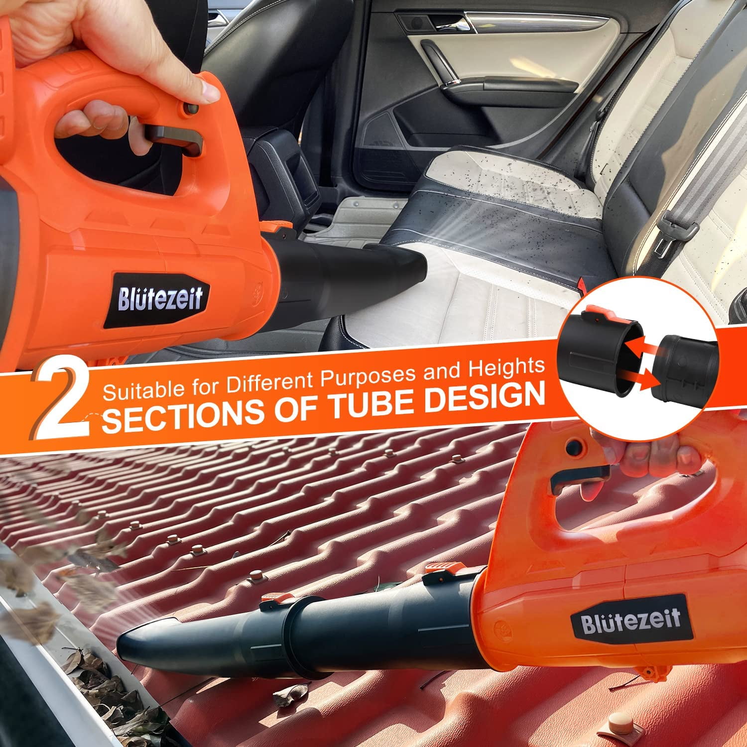 Specifications: Product Type———– Cordless Leaf Blower Battery Type———–Rechargeable Lithium-Ion Battery Battery Voltage———–DC 21V Battery Capacity———–4000mAh Material———–PP & ABS Color———–Orange & Black Max. Air Speed———–Up to 150MPH Max. Air Volume———–Up to 320CFM Working Time———–20-70mins Battery Charging Time ———–2.5-3 hours Sound Pressure Level———–78.8 dB(A) K=2.5 dB(A) Length———–27 inches (1 tube) / 37 inches (2 tubes) Switch Type———–Trigger Switch & Safety Lock Key Features:Please FULLY CHARGE the battery before use especially for the FIRST time to guarantee the blowing performance. Powerful Blowing with Turbine Tech – Blütezeit cordless leaf blower is equipped with high-quality Pure Copper Motor and upgraded turbine technology with airspeed up to 20000RPM, maintains a steady stream of power throughout large and heavier jobs. 4.0Ah Battery & Fast Charger – Included 21V big capacity battery and fast charger to offer a long lasting runtime up to 30mins at high speed, ensures a smoother blowing for longer period. There’s a low battery indicator light which can remind users to charge in time. 6 Variable Speeds – This yard blower is designed with 6 speeds in 1 dial, perfectly achieves different purposes from indoor to outdoor. It features a turbo mode up to 320CFM 150MPH, makes it able for clearing debris from hard surfaces and out of tight spaces. Lightweight & Easy to Operate – Only 5.73lb with ergonomic handle, it can ease fatigue on your hand and arm. Trigger lock design improves the operation experience, effortlessly to maneuver by one hand without keep pressing down on the switch. Portable to carry for all-purpose use. Multi-Purpose Uses – Quickly sweep away fallen leaves and grass clippings from driveway, sidewalk and garden; blow the dust and dirts from car seat and garage. Compact blower for lawn care and tackling large yards, widely uses at home and patio. It can also be used to blow powdery snow. 2-Section Tubes & Quick Assembly – With removable extension tube, this leaf blower can be set to 27 or 37 inches, give it more length to clear debris from hard-to-reach nooks and crannies. It just takes 5 seconds to quick assemble or disassemble for use and storage. Why To Choose Blütezeit Battery Leaf Blower?No Cable, More Mobility – Cordless design without usage limitation, take this cordless leaf blower anywhere as you like, no more dealing with power cords dragging around the floor. No Smell, Less Noise – Prevents from releasing smelly, toxic emissions like gas leaf blowers do, battery leaf blower has much lower noise. 4.0Ah Battery, Longer Runtime – Instead of traditional 2.0Ah battery, this battery powered leaf blower has double service time which allows you to handle more jobs. Variable Speeds, More Controls – 6 speed modes from breeze to jet, switch at will with a dial, satisfy your different needs of cleaning. Extension Tube, More Length – 2 section tubes, make it possible to reach hard-to-clean spaces like gutters & grooves, crannies & nooks. Lighter Design, More Portable – Lightweight but powerful, easy to carry and maneuver a carpet of leaves. Widely Use, All Purposes – Suitable else for yard & lawn care, snow blowing, home cleaning, car drying etc. Thoughtful Details For Convenient UseSnap-On Tube – Just 5 seconds to assemble and disassemble this battery leaf blower, which is detachable for easy storage and maintenance. 6 Speeds Dial6 Speeds Dial – Adjust and customize the airflow by rotating the speed dial from breeze to jet, suitable for various jobs from indoor to outdoor. Trigger Lock – Simply press the trigger lock button to keep this yard blower working, enormously reduces fatigue and saves your effort. Ergonomic Handgrip – The ergonomic non-slip handle perfectly adapts to hand and disperses pressure across the palm to minimize strain, allowing operators to work comfortably. Large Air Intake – The big air inlet design of this lawn blower and high quality copper motor ensure a more powerful, steady blowing and maximum air volume producing. Low Power Indicator – The LED low power indicator can remain users in time when the battery should be recharged. Note: it’s not always on, only flashes in low battery status. What Will You Get? 1 x Leaf Blower Main Engine 2 x Tubes (should be assembled) 1 x 4.0Ah Li-Ion Battery 1 x User Manual About Blütezeit Blütezeit focus on providing better solutions of variable tools for home, lawn & garden. We aim to bring more conveniences to your daily lives, expect that you can not only save time by using our products, but also enjoy the time during use. We are always ready for providing satisfied service for our customers. What makes our products unique? Blütezeit has its own industrial design and R&D team. We develop a product from aesthetics, ergonomics and practicability. We always Improve the pain points and listen to consumers’ advice. Why do we love what we do? Customers’ satisfaction and their love to our products make all of the time and effort that we put into each job well worth it. We’re so honored with the trust that they give us. What problem are we solving? We provide tidy solutions for your garden, help you save time, space and effort, bring you true conveniences. Our series products must pass strict quality inspection processes before arriving in your hands.