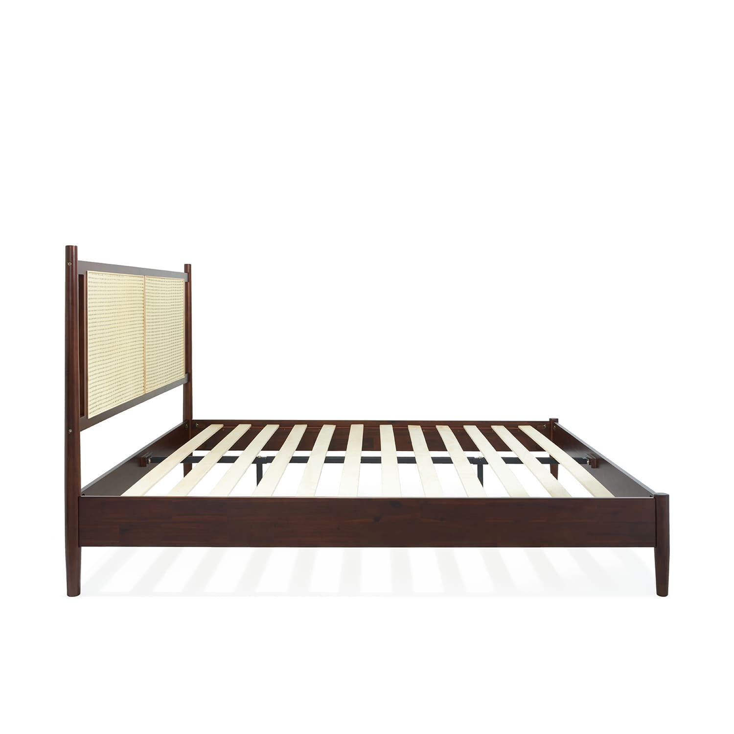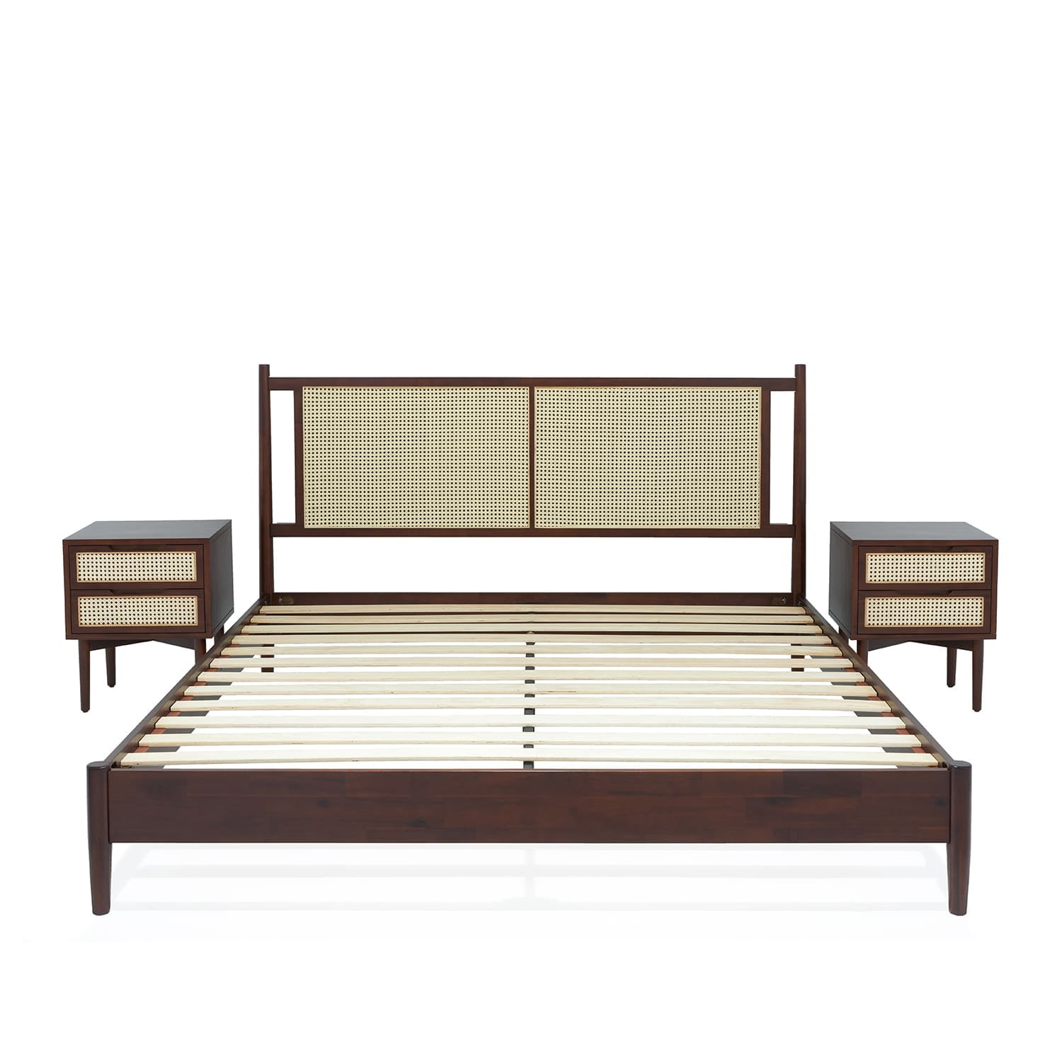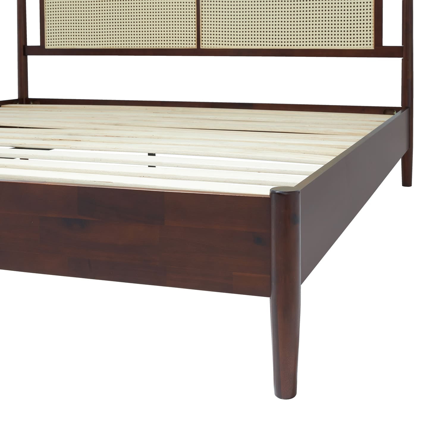 Asher 47″ King Platform Bed Frame, Rattan Headboard, Mid Century and Boho, Solid Wood, Walnut