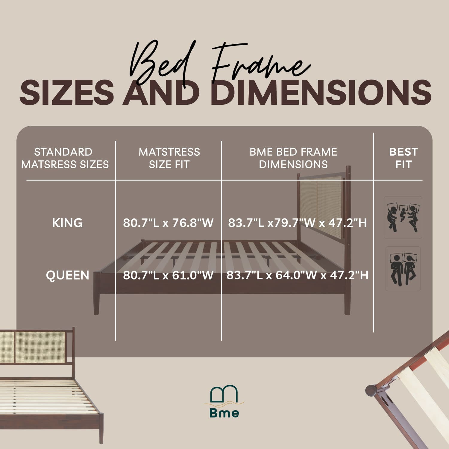 BME – BEHIND EVERY SWEET DREAM IS A STURDY BED FRAME Home is more than a mere shelter – It should lift us Emotionally and Spiritually. Bme Home provides accessible, high-quality wooden furniture through direct collaboration with factories in Vietnam. By prioritizing customer experience and innovative manufacturing, we offer affordable, durable pieces that last years. ASHER COLLECTION – BOHEMIAN STYLE Craft your own enchanting haven with the elegant and fashionable Rattan Bed. This bed embodies a timeless blend of modern and transitional design, radiating a sense of serenity and coastal ambiance. The fusion of rattan textures and traditional bed frame hues in Asher’s creation forms a captivating paradise where Mid-Century and Bohemian Styles coexist in perfect harmony. This distinct design effortlessly adjusts to complement any bedroom decor. BME ASHER 47″ KING PLATFORM BED FRAME, RATTAN HEADBOARD, MID CENTURY AND BOHO, SOLID WOOD, WALNUT The King Wooden Bed Frame is the perfect addition to any bedroom. This bed frame with headboard is made from high-quality wood, ensuring durability and longevity. The king headboard with frame is designed to provide maximum comfort and support while you sleep. The king bed frames with headboard are available in a variety of styles and finishes, making it easy to find the perfect match for your decor. Whether you prefer a classic or modern look, this wooden bed frame is sure to impress. Upgrade your sleeping experience with one of our king beds today!
